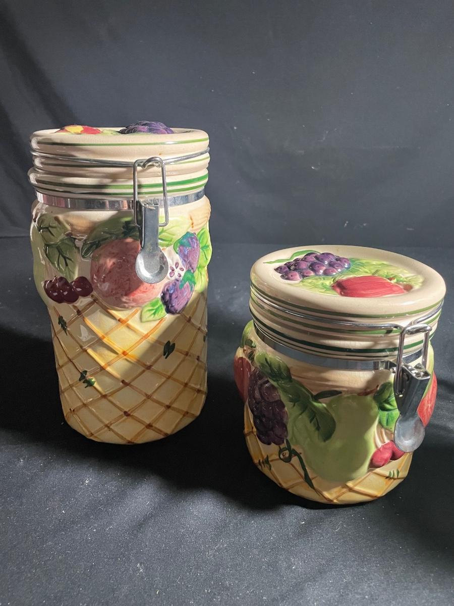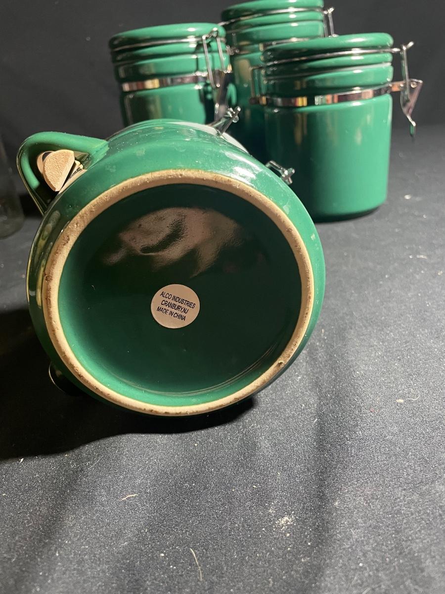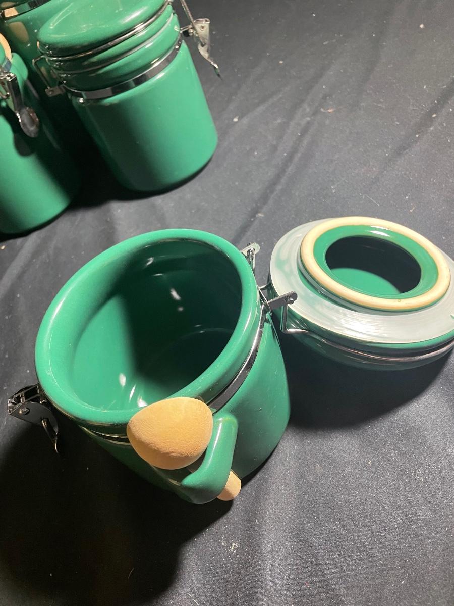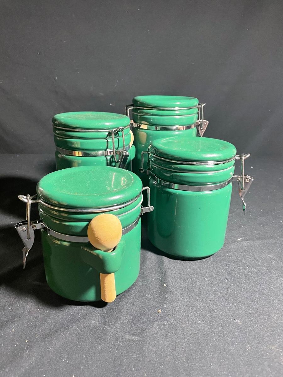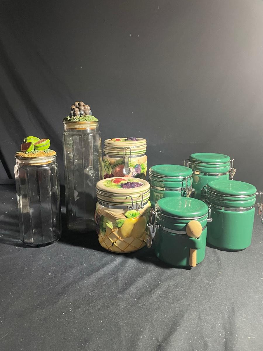 Lot includes a set of 4 matching ceramic green canisters with wooden spoons, 2 ceramic Gourmet and 2 glass (with resin like tops) canisters complete this lot.