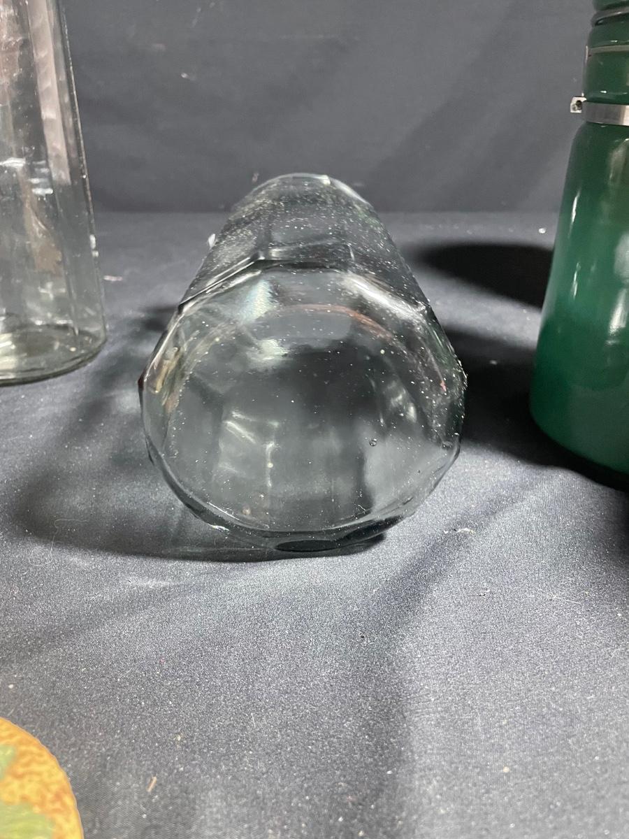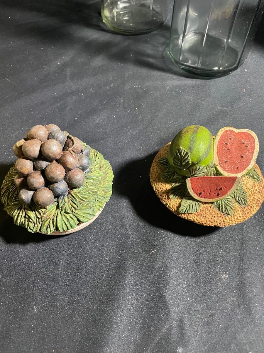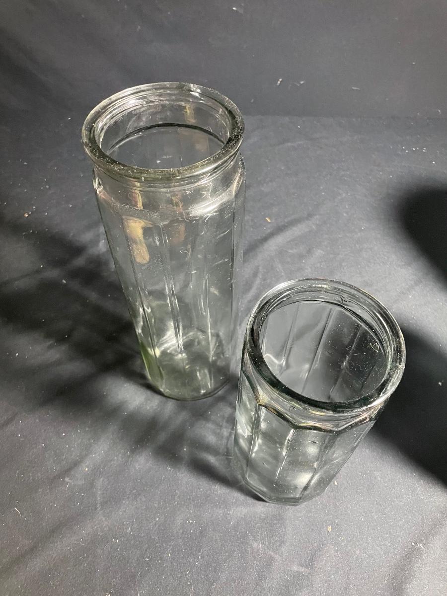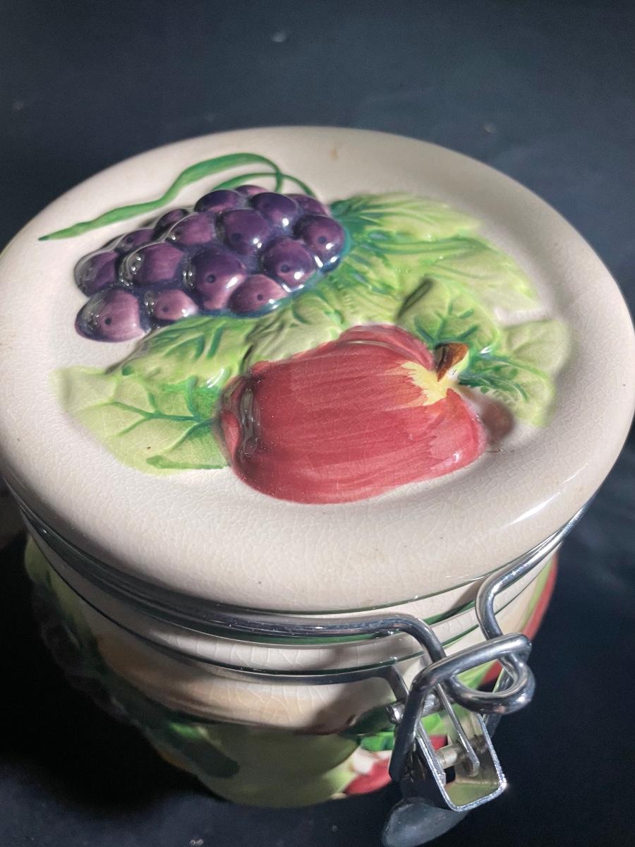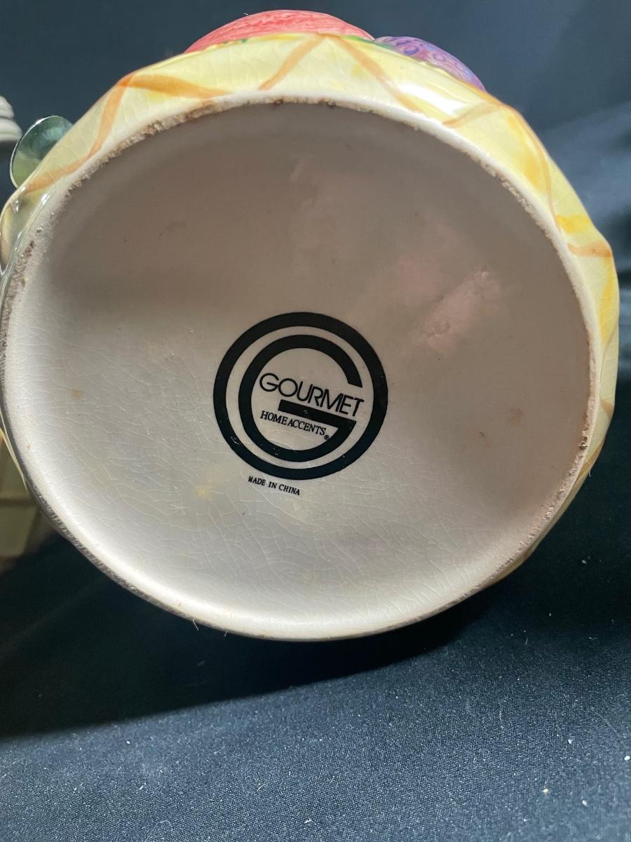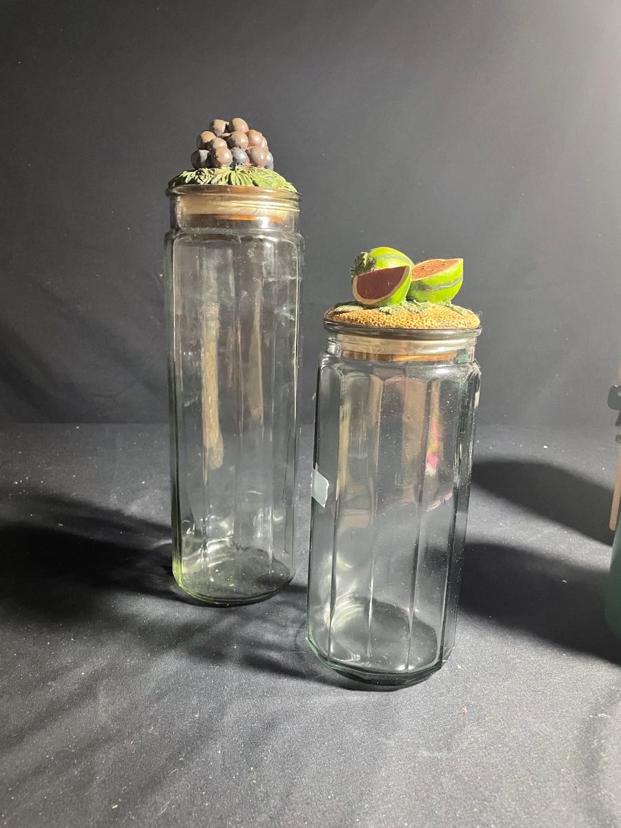 Lot includes a set of 4 matching ceramic green canisters with wooden spoons, 2 ceramic Gourmet and 2 glass (with resin like tops) canisters complete this lot.