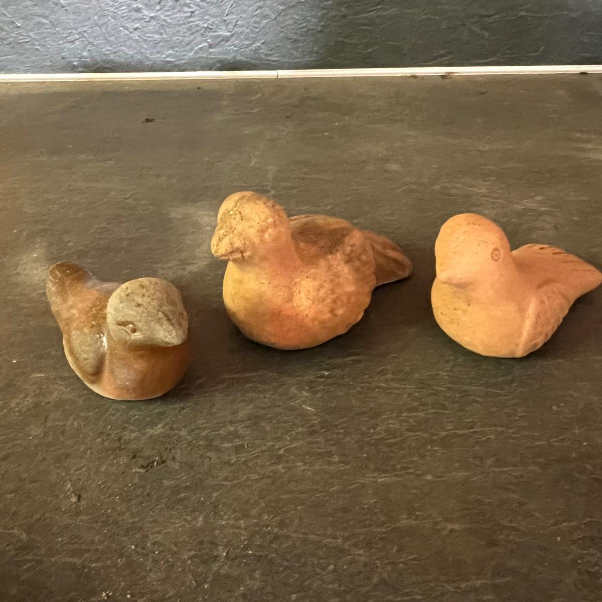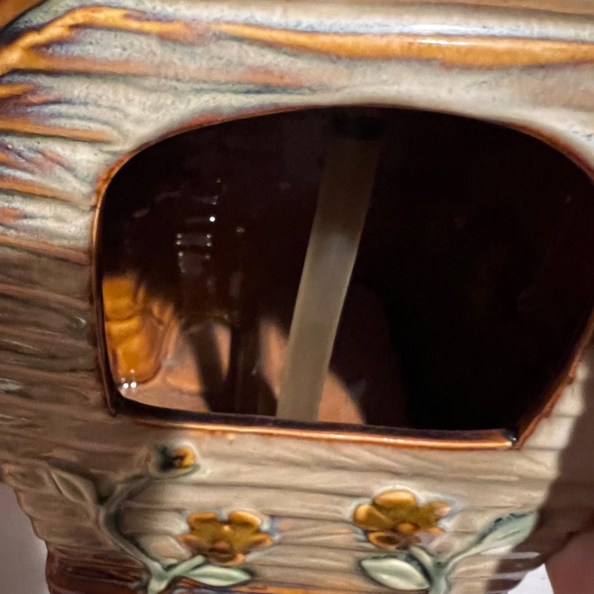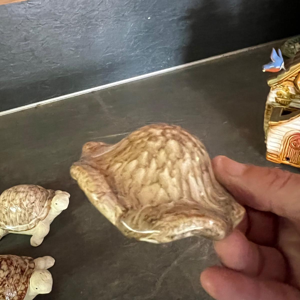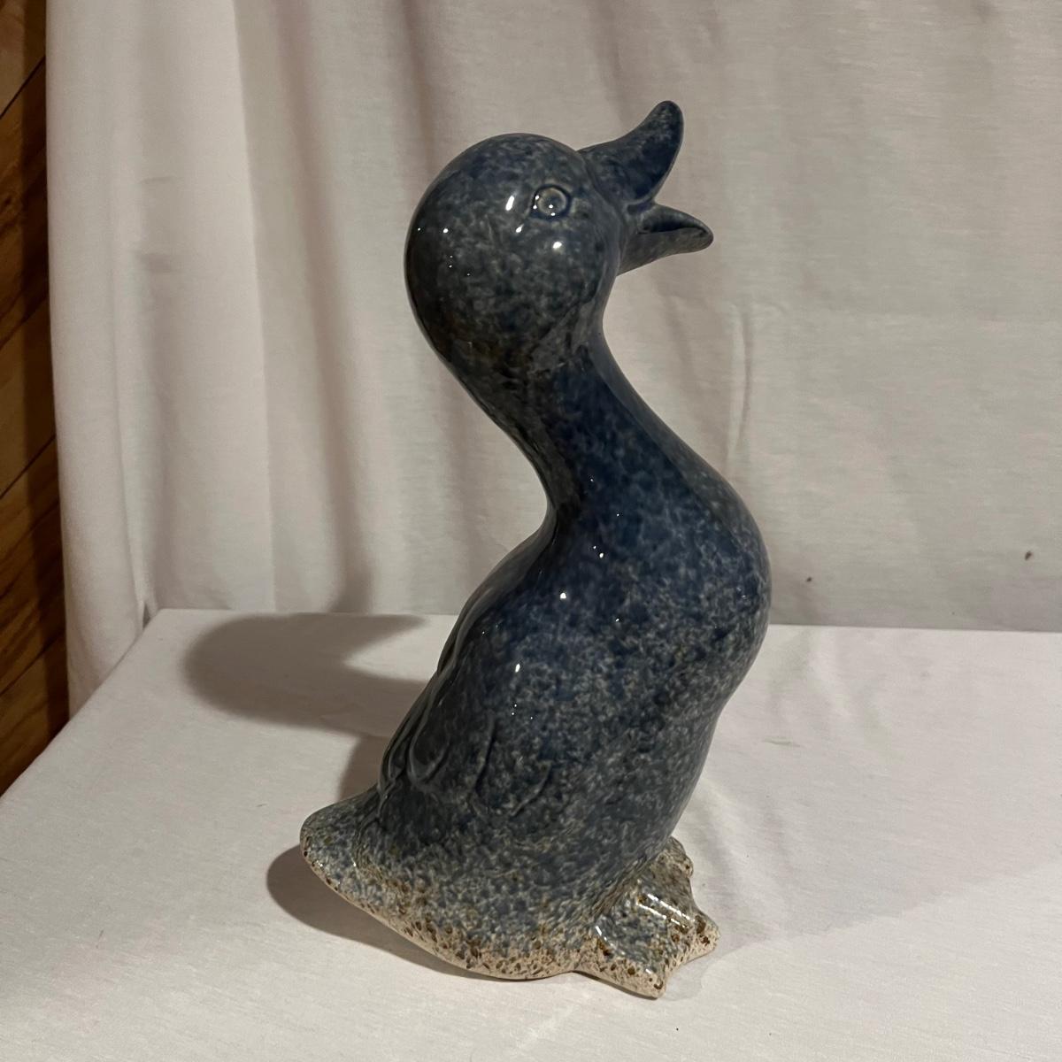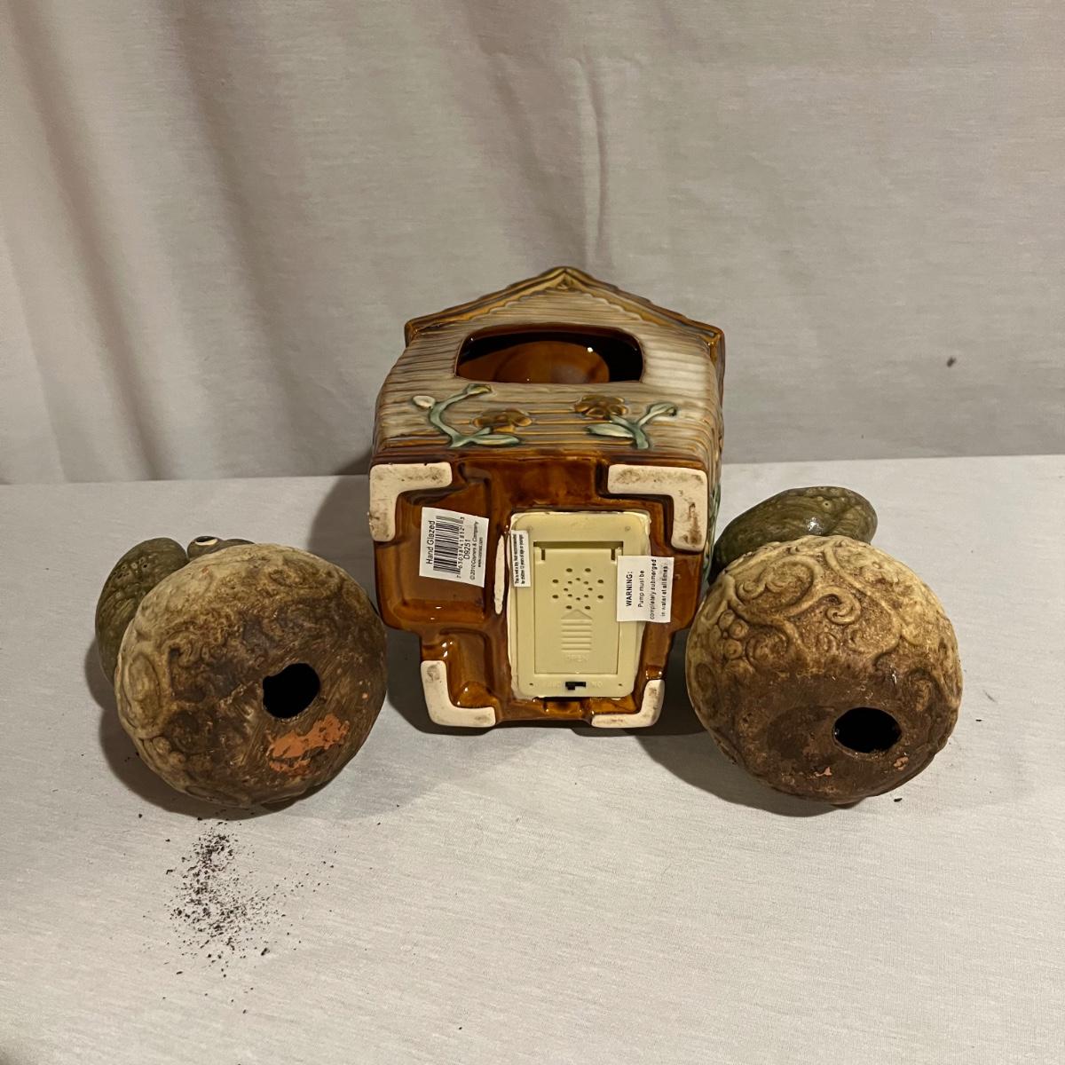 Approximately 20 ceramic pieces in this lot plus three glass mushrooms with copper colored metal stakes. The stake ceramic mushrooms just rest of their stakes. Note one green mushroom has a small crack. The three mushroom stakes with solar powered lights were not tested. The bird house has a battery powered pump which was also not tested. The blue duck is the tallest item and measures 7” x 6” x 14”H.