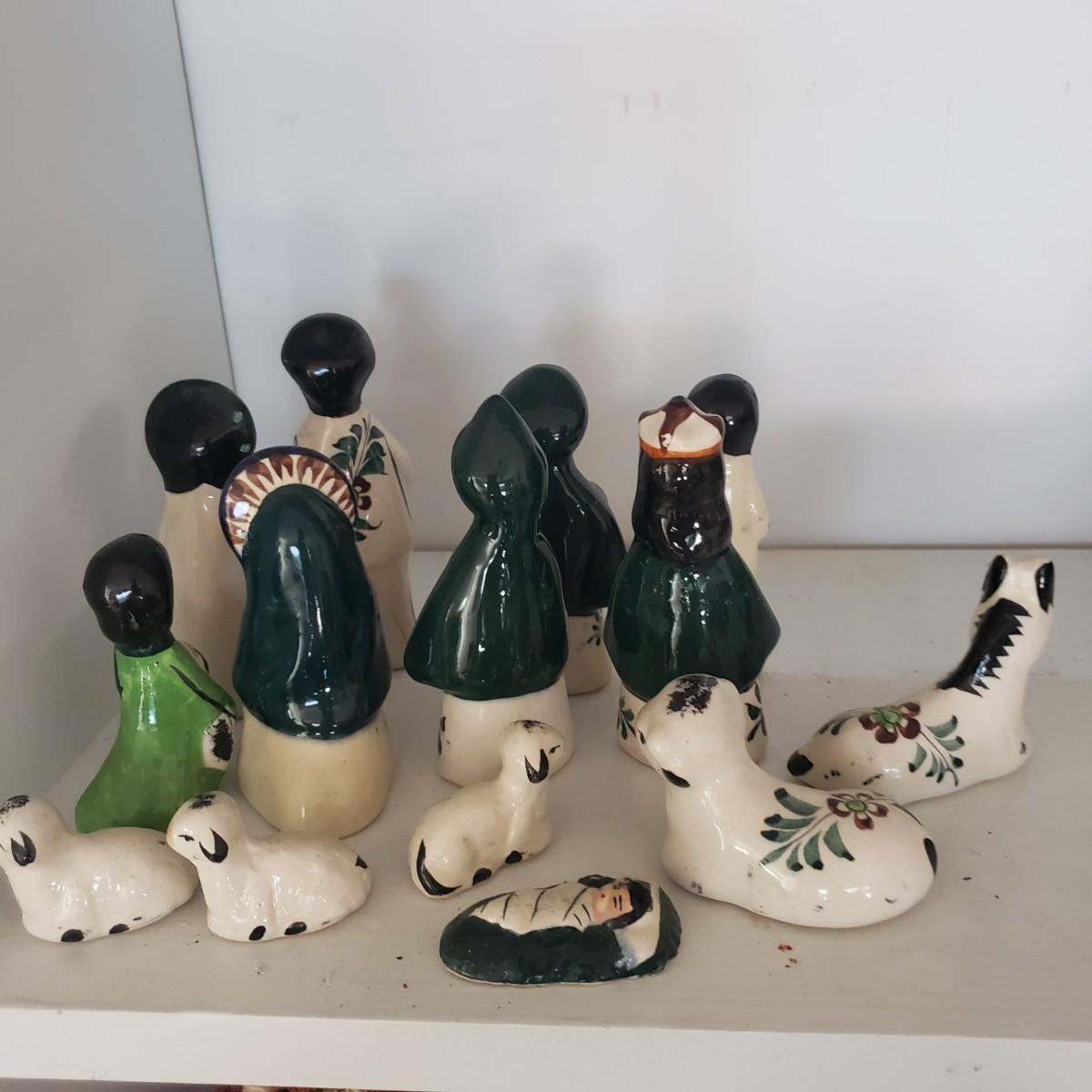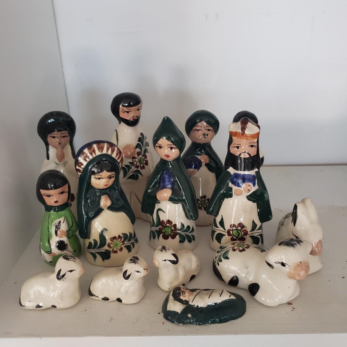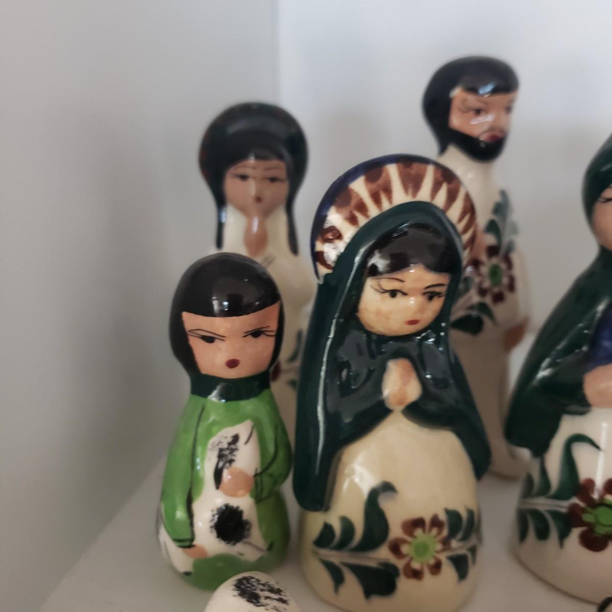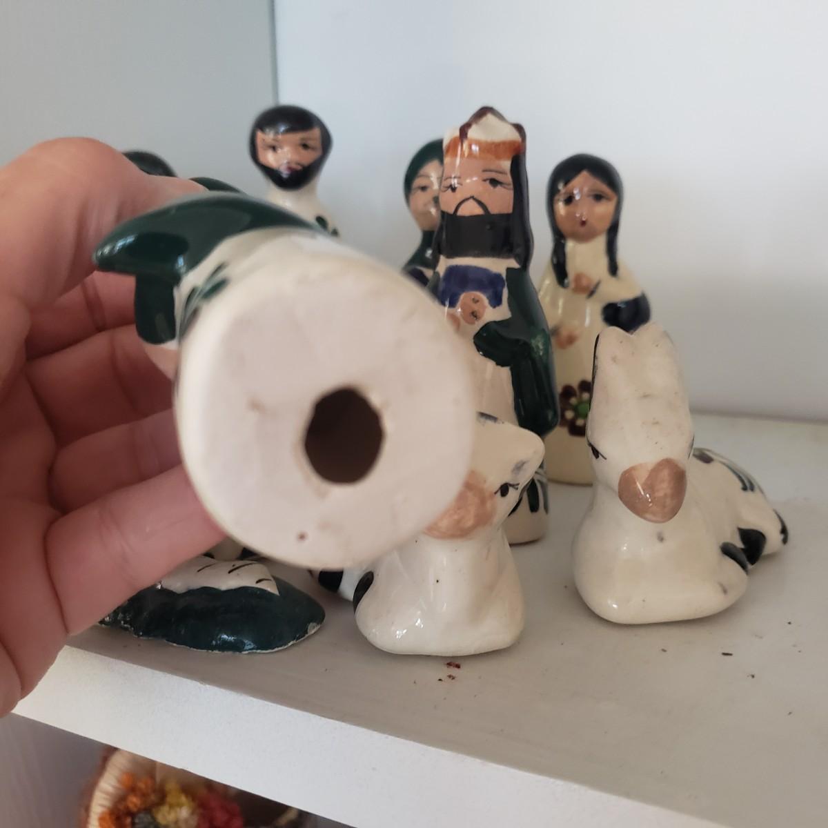 This 14 piece Nativity set is hand painted. There are no markings on any of the pieces. All the bottoms are the same, see the one picture of a bottom. The largest piece measures 5" x 2"H. The baby Jesus has some paint chipped off his face, see picture.
