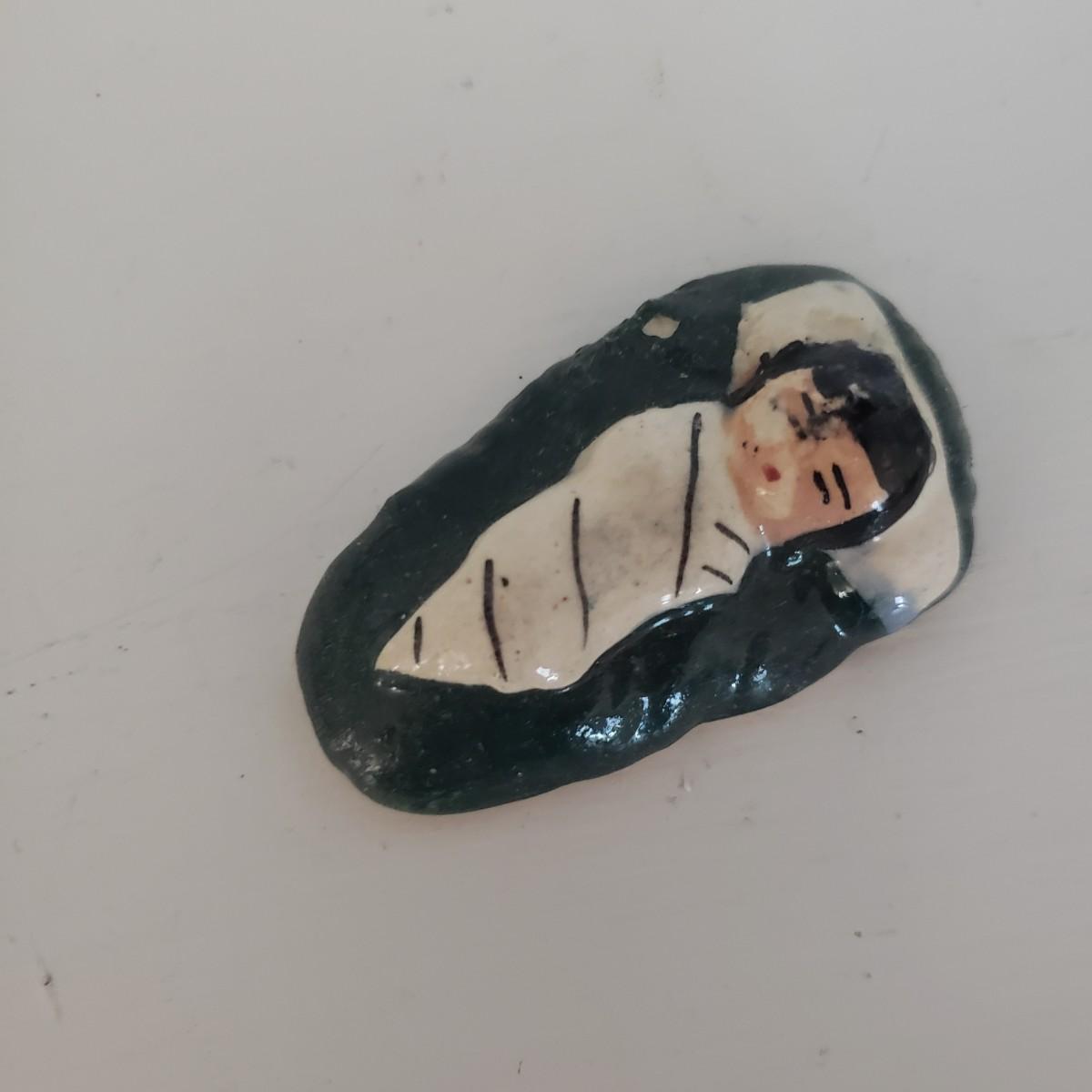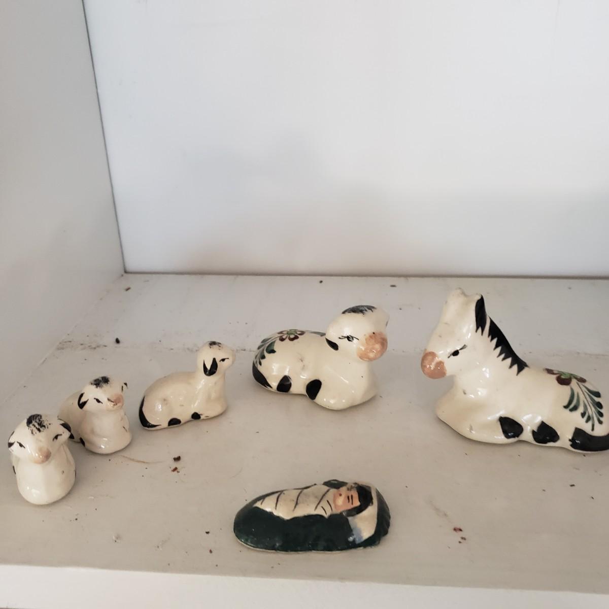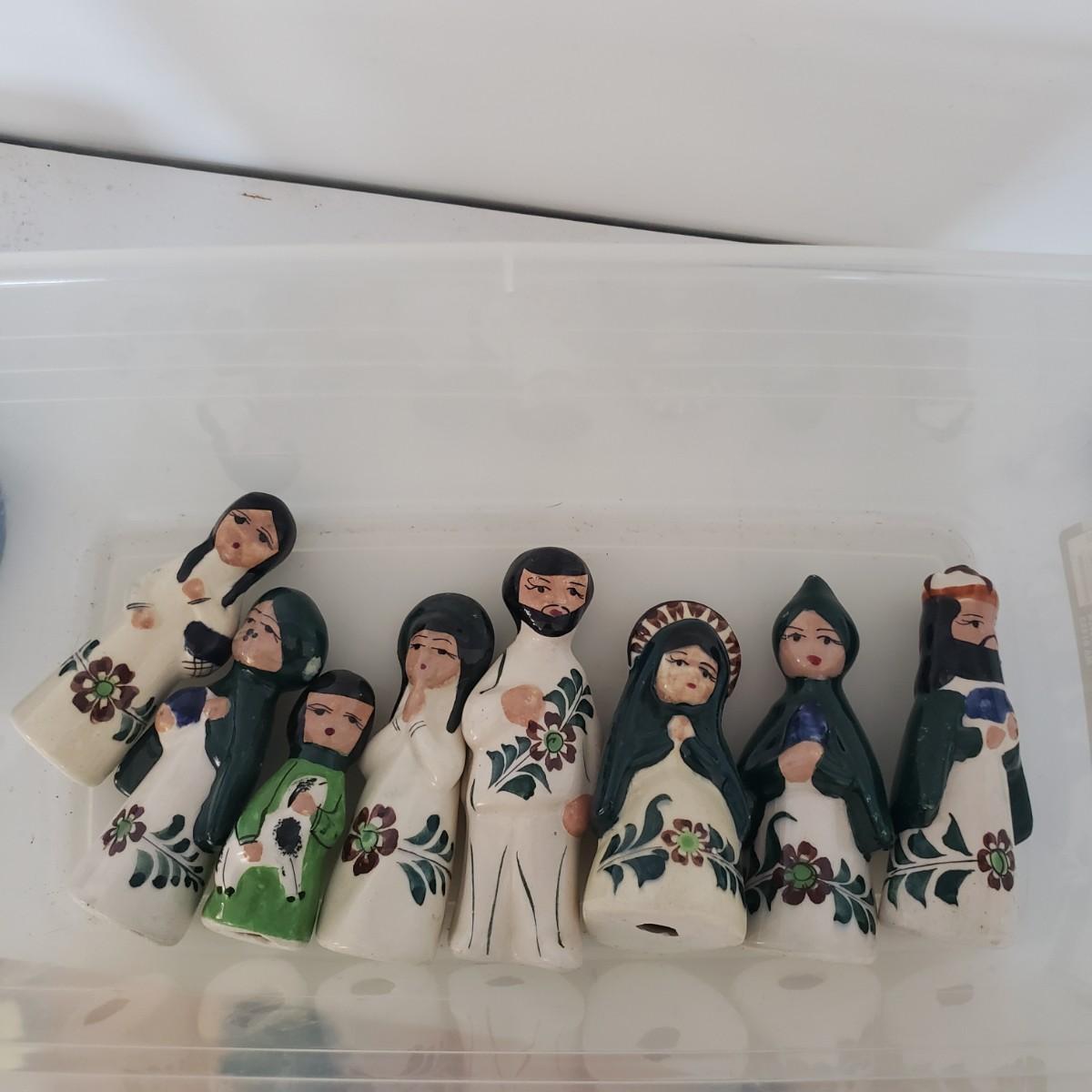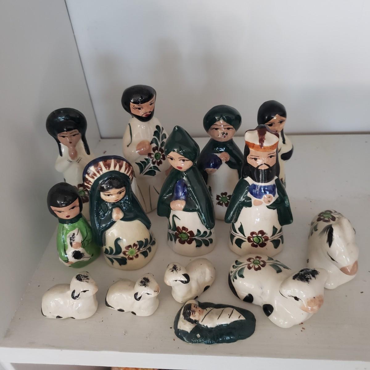 This 14 piece Nativity set is hand painted. There are no markings on any of the pieces. All the bottoms are the same, see the one picture of a bottom. The largest piece measures 5" x 2"H. The baby Jesus has some paint chipped off his face, see picture.
