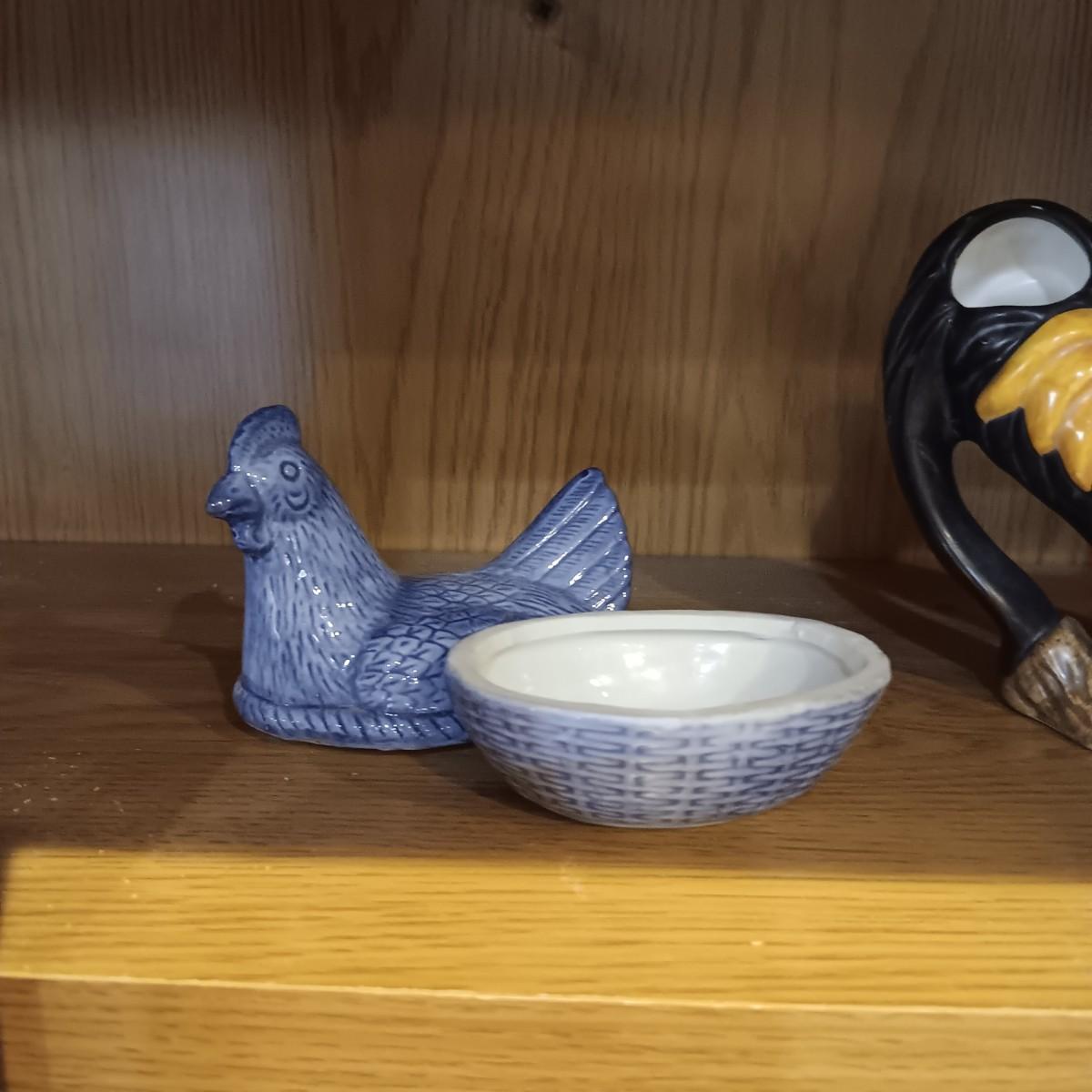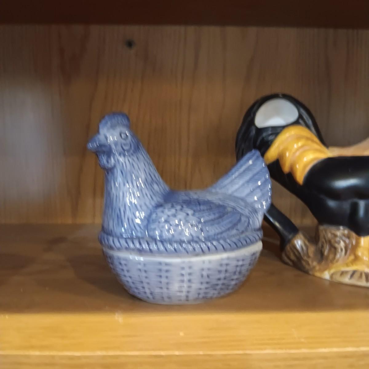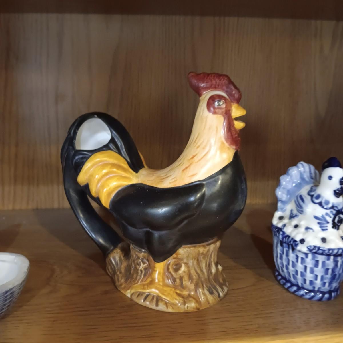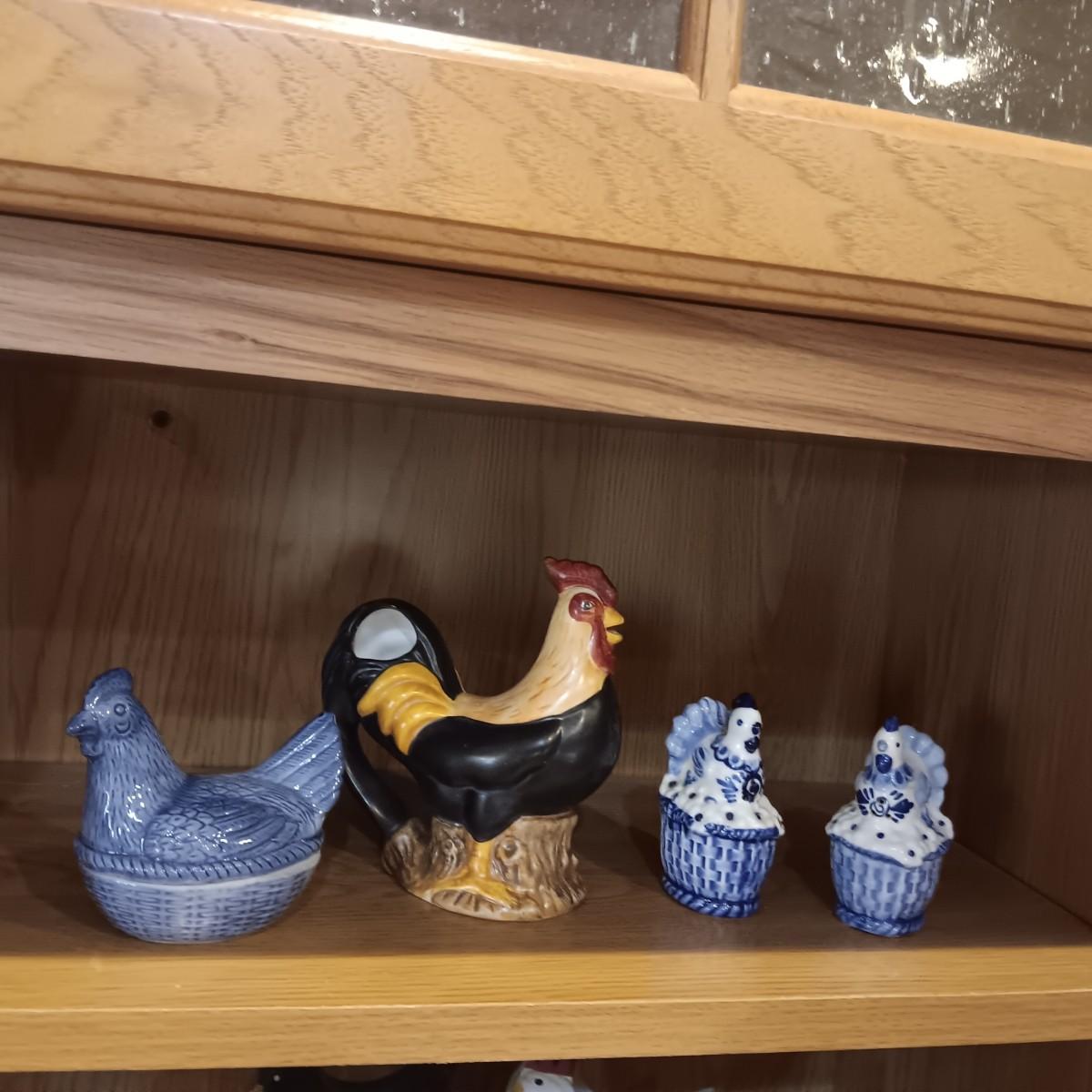 CERAMIC HEN ON NEST, SALT/PEPPER SHAKERS AND A ROOSTER CREAMER