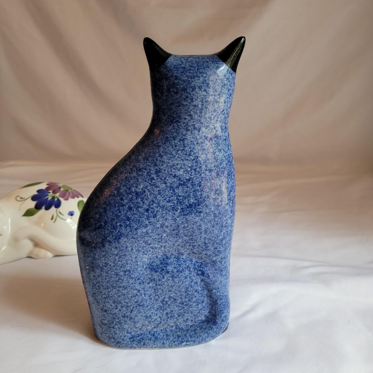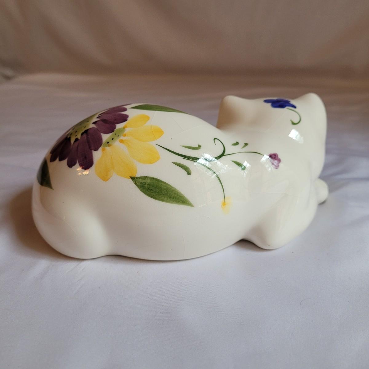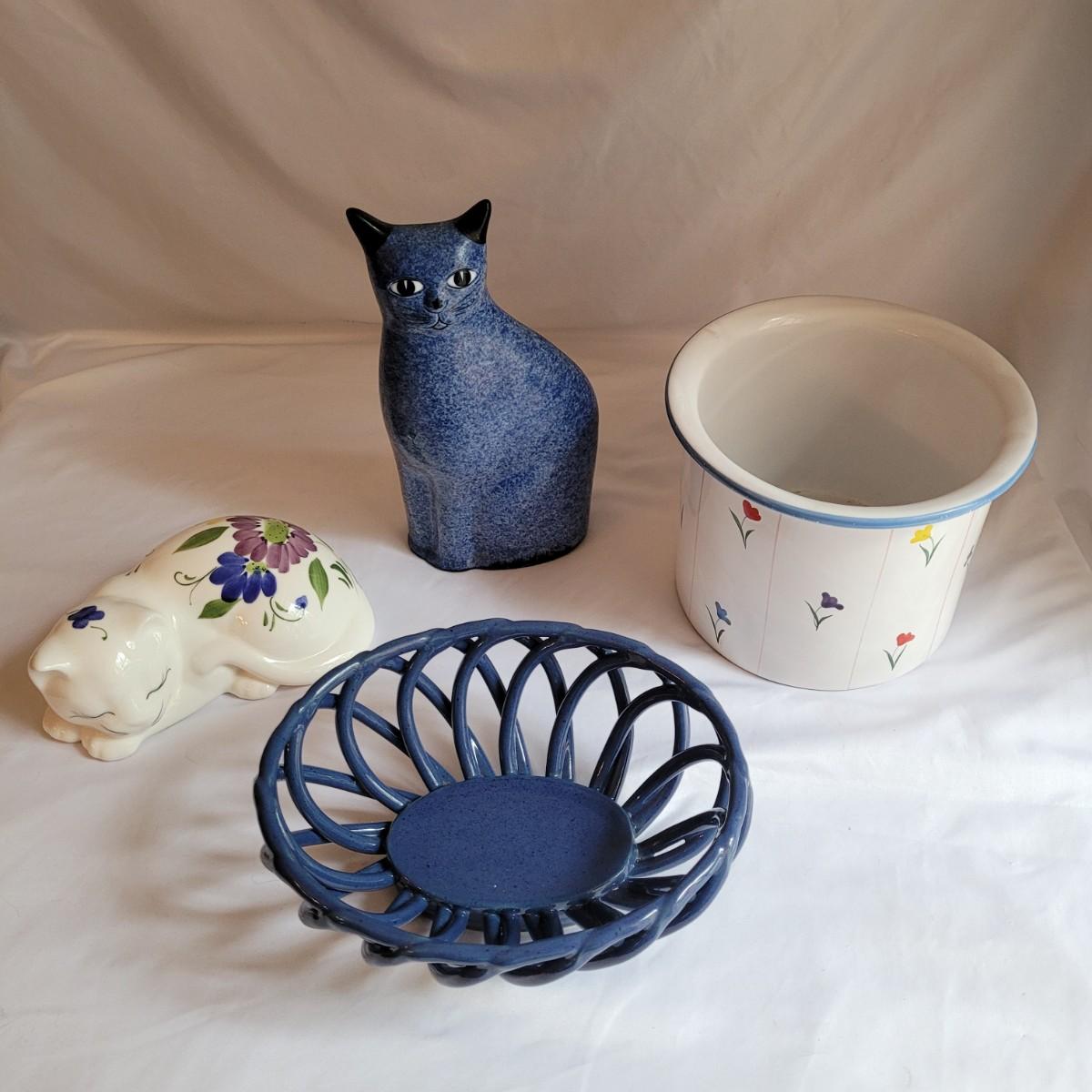 This lot includes a large ceramic jar, basket and two ceramic cats. Jar measures approximately 8”DIA x 7”. Shipping available.