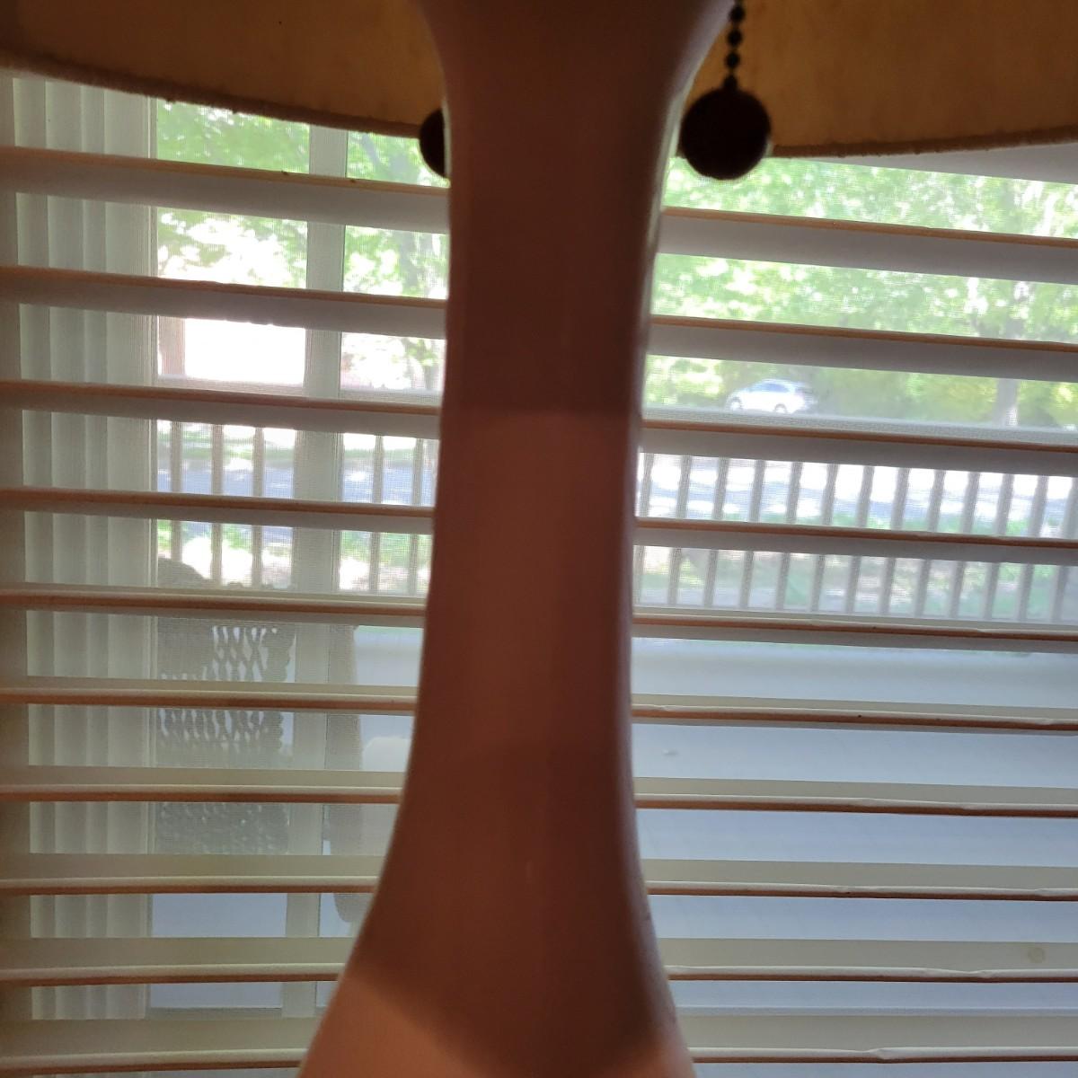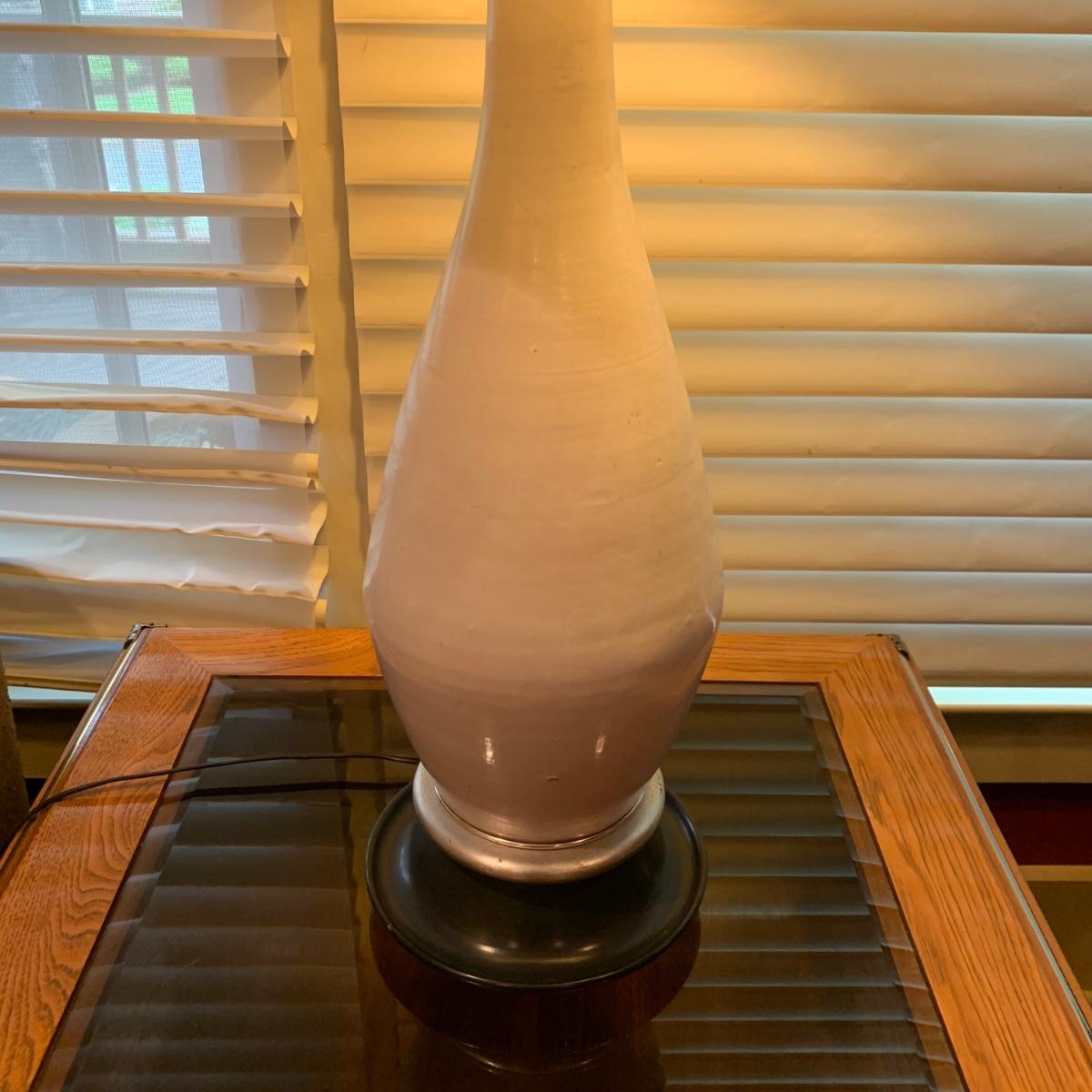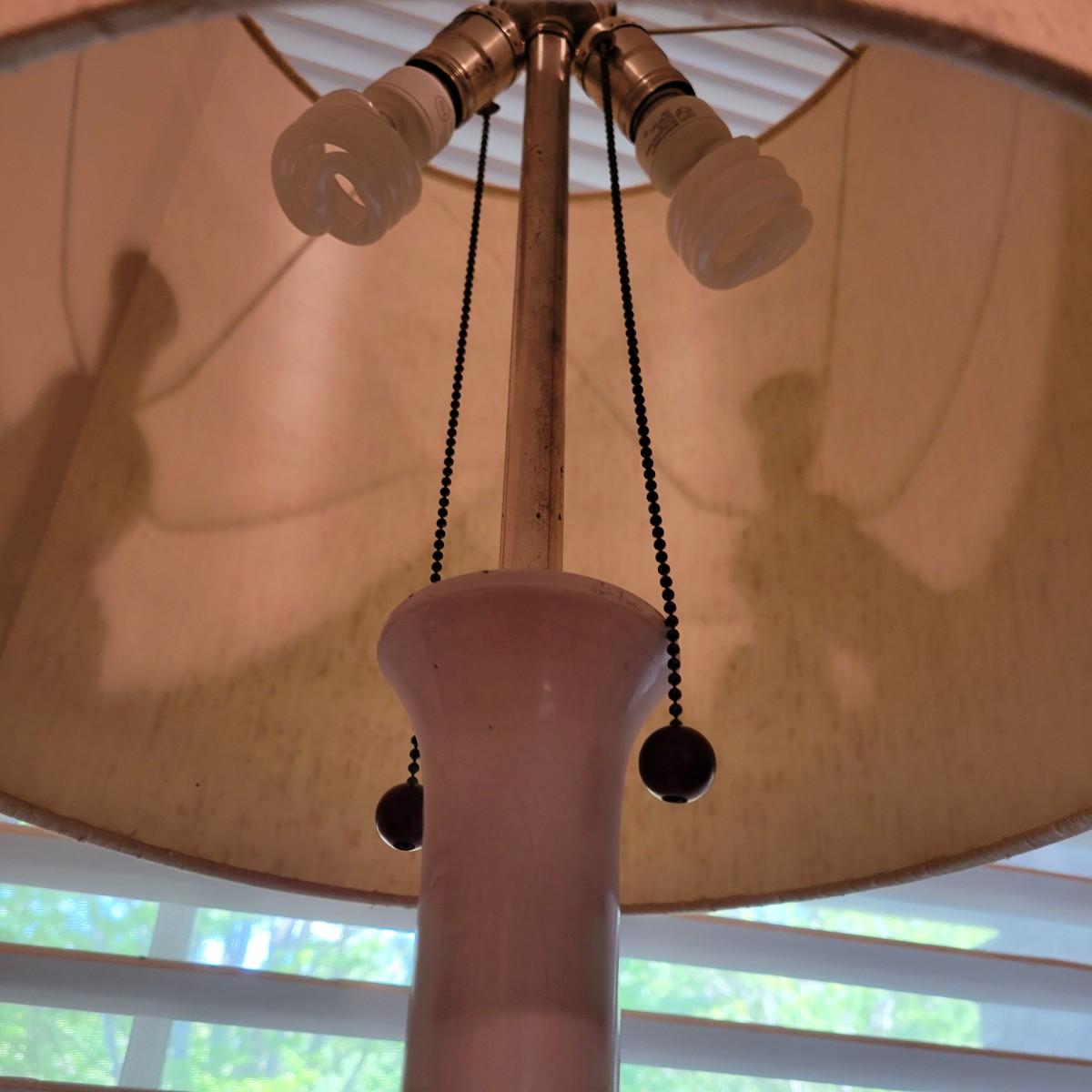 A white ceramic lamp with a cream, distressed linen shade. The lamp has a blue wooded base with silver accents and a white ceramic body. It has two pull chains to power on its two bulbs. Lamp powered on when plugged in. Including the shade, it measures approximately 15"D x 42"H. Local pickup only