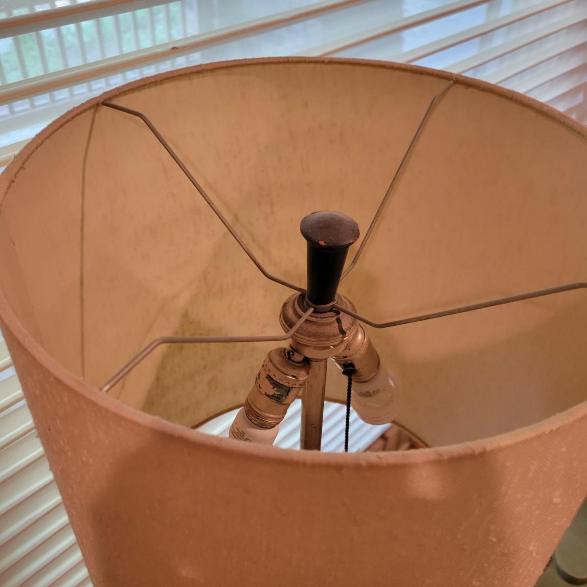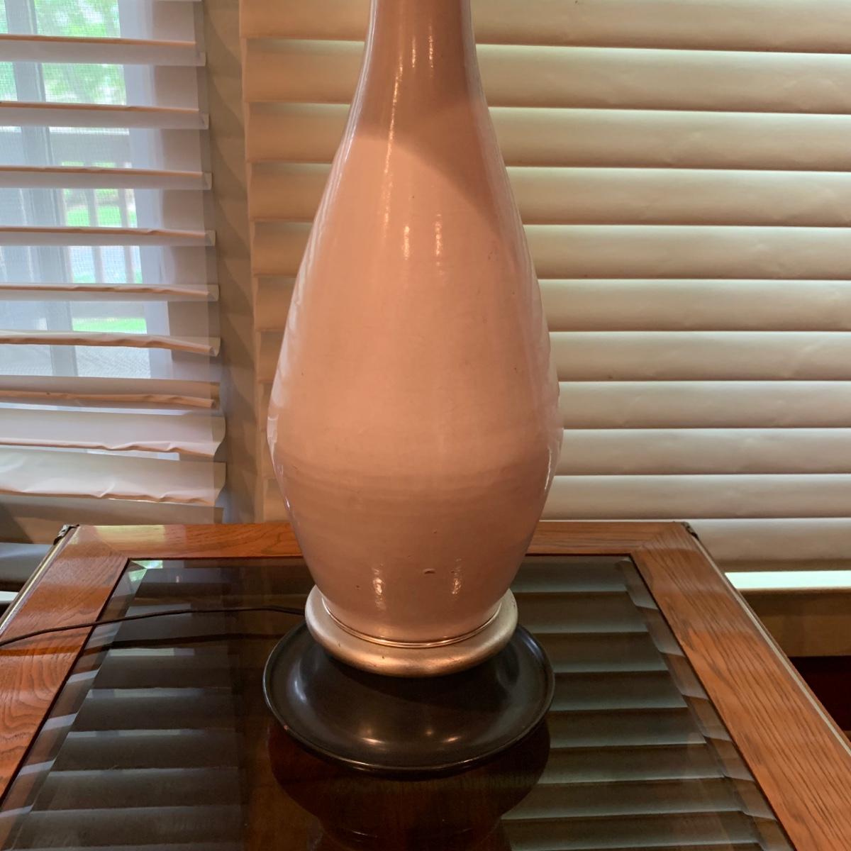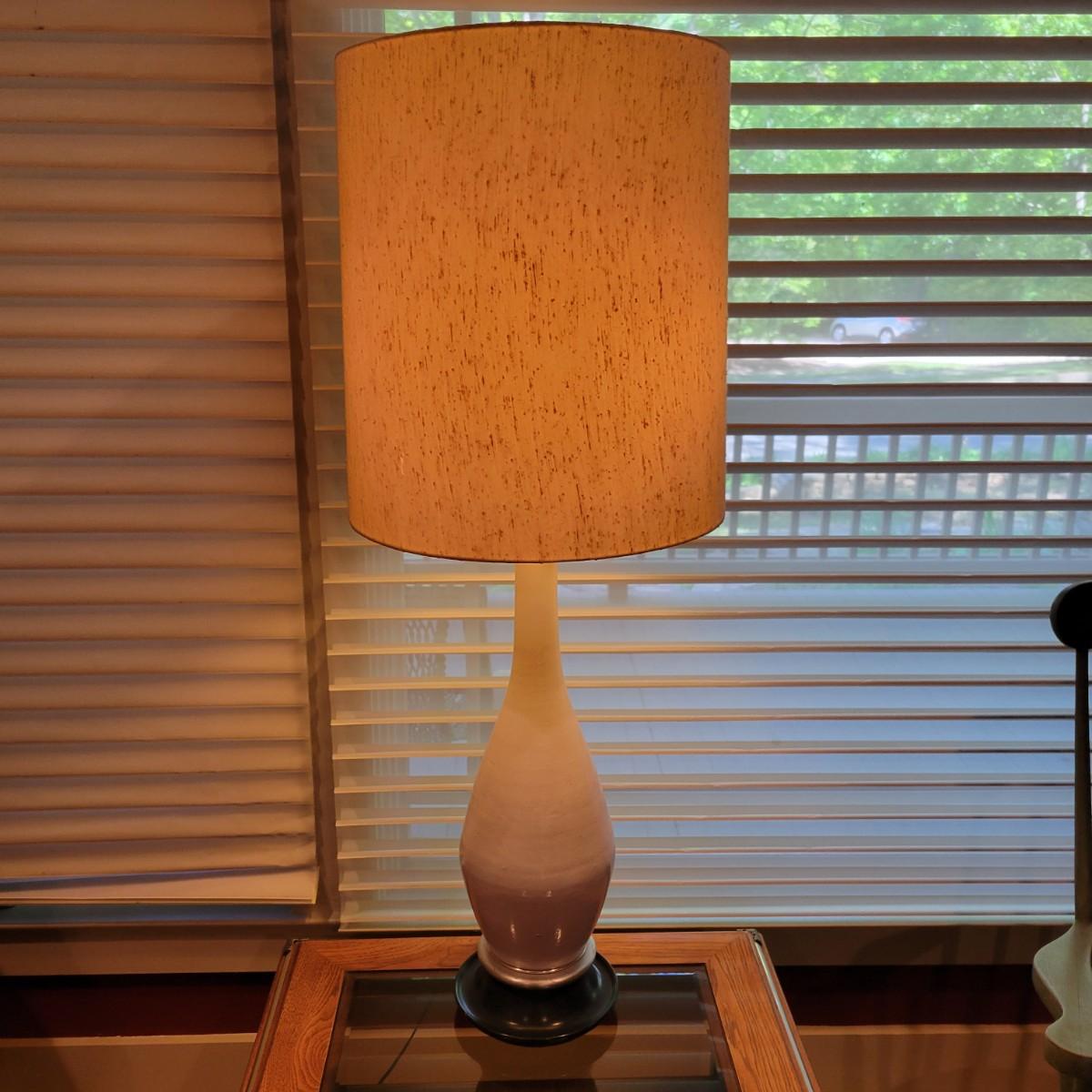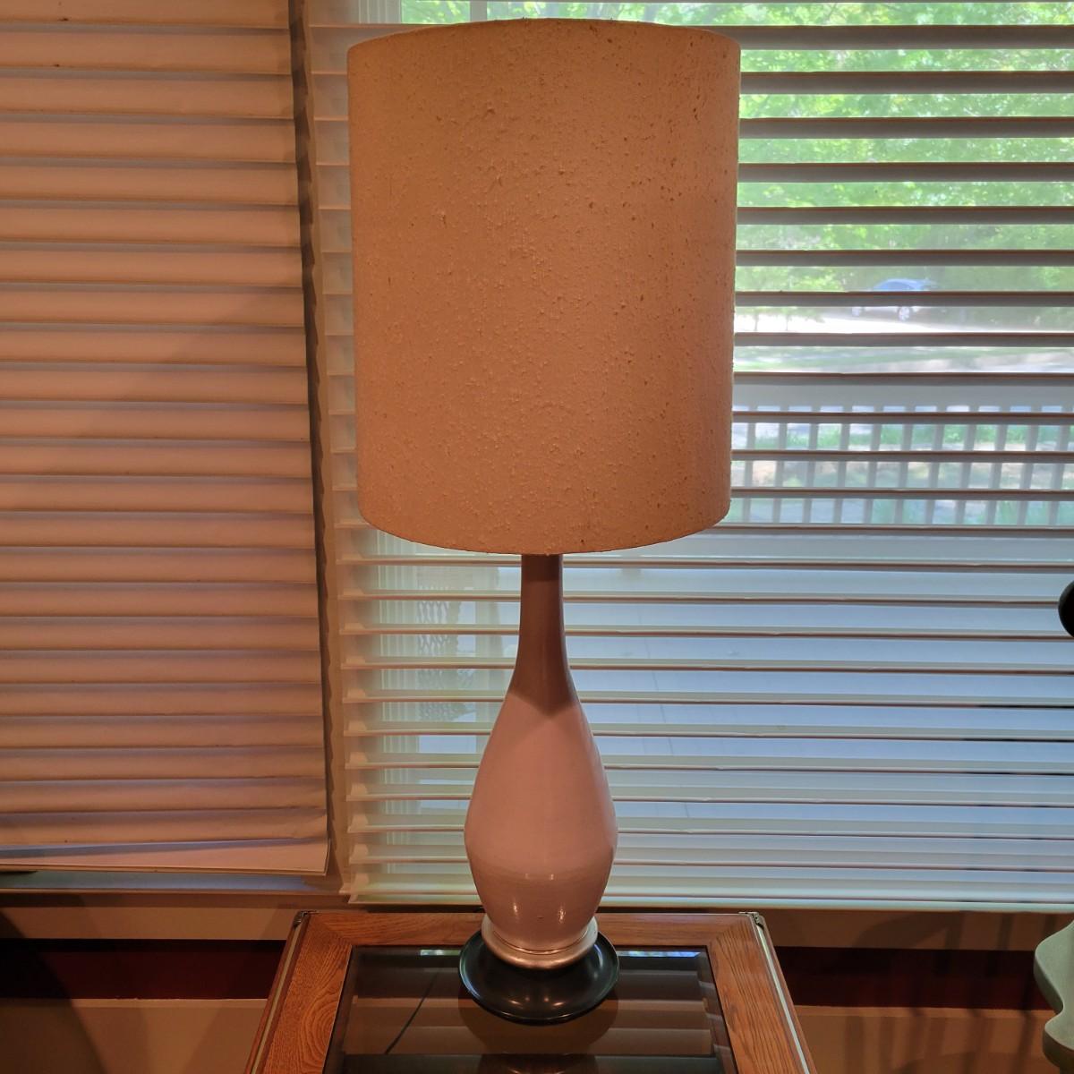 A white ceramic lamp with a cream, distressed linen shade. The lamp has a blue wooded base with silver accents and a white ceramic body. It has two pull chains to power on its two bulbs. Lamp powered on when plugged in. Including the shade, it measures approximately 15"D x 42"H. Local pickup only