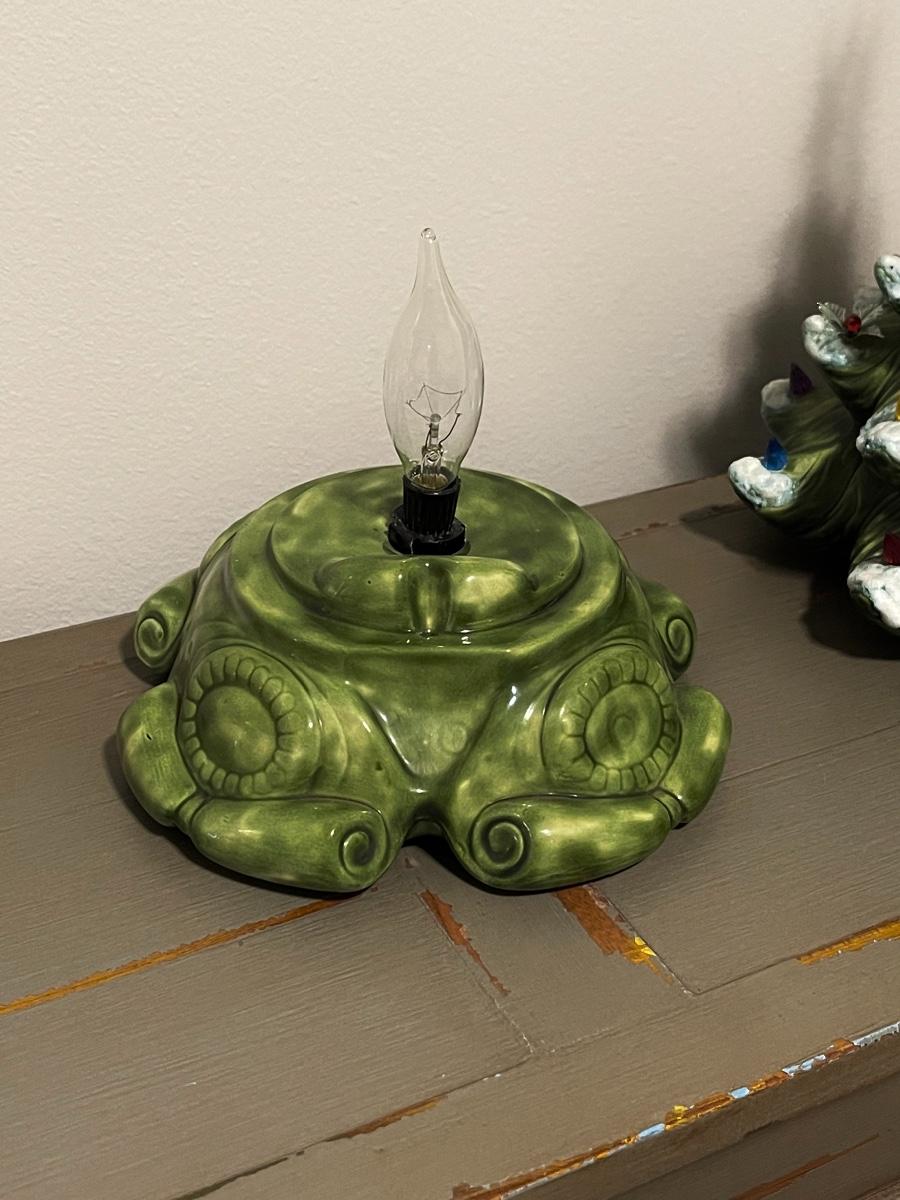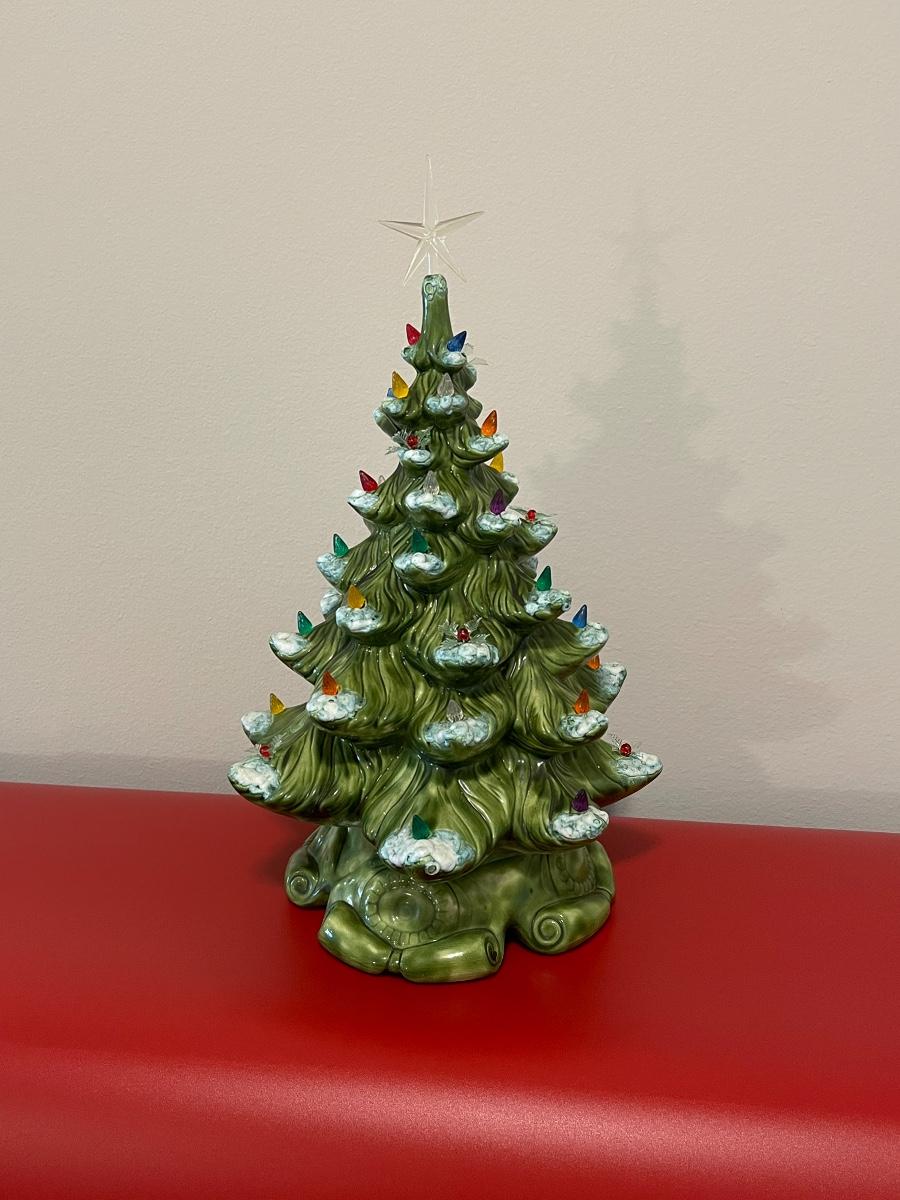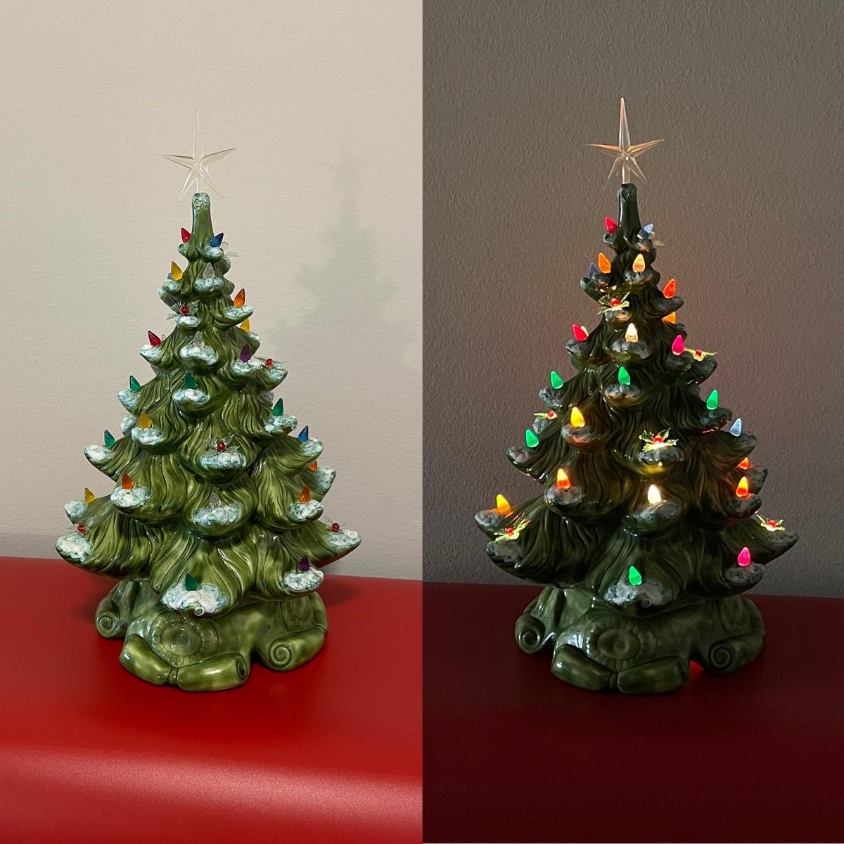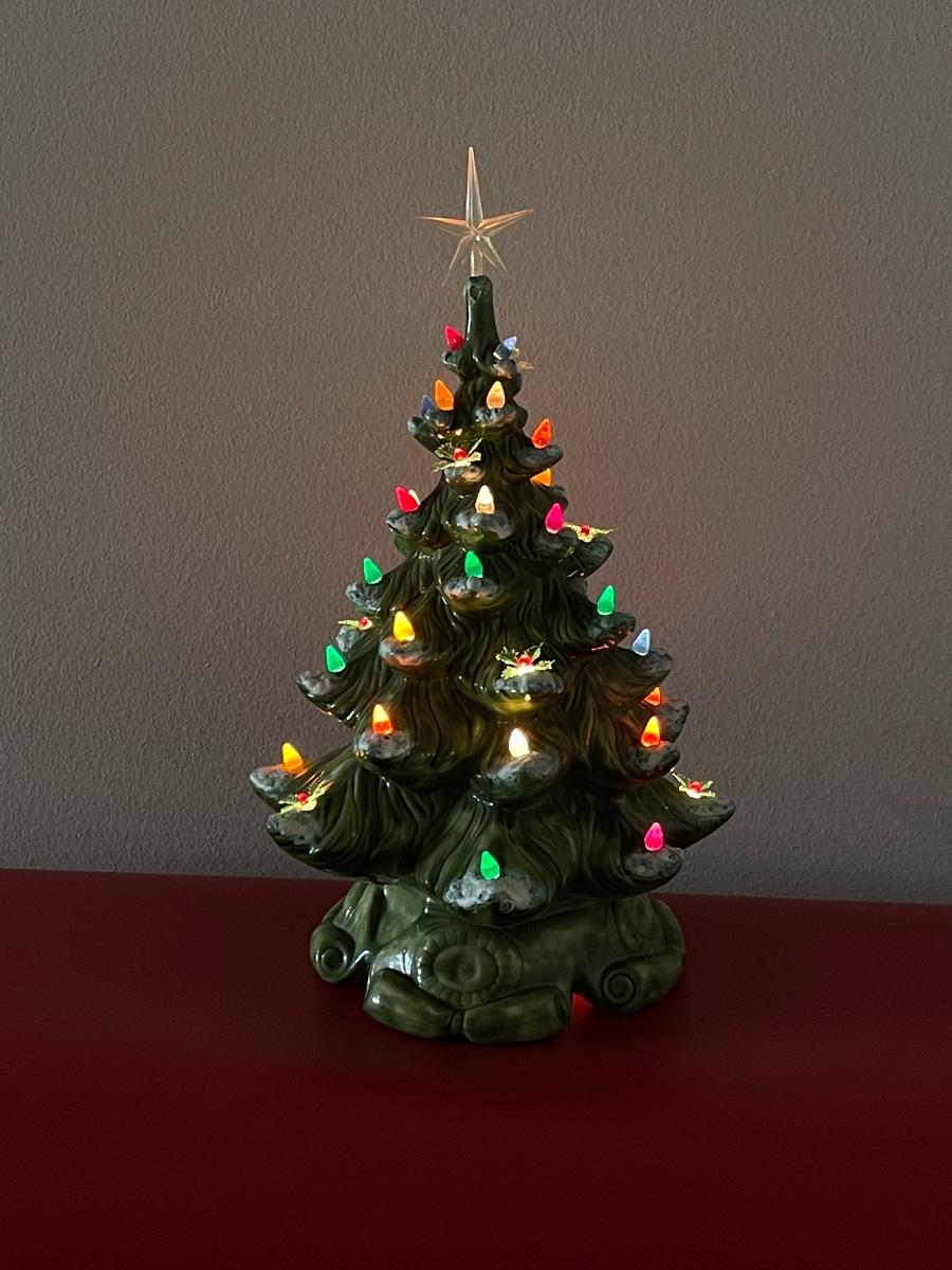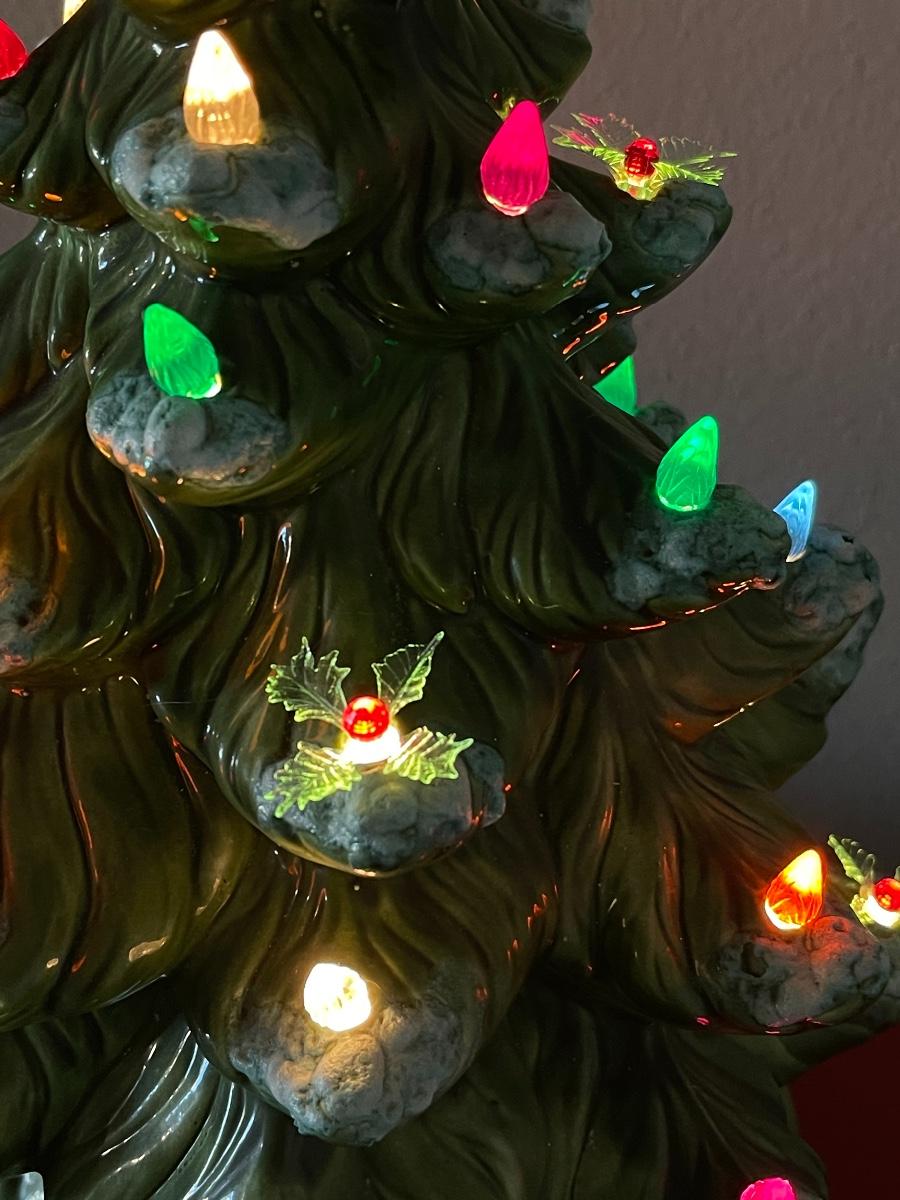 Vintage Ceramic Green Snow Tipped Lighted Christmas Tree ~ Includes Rare Poinsettia Ornaments