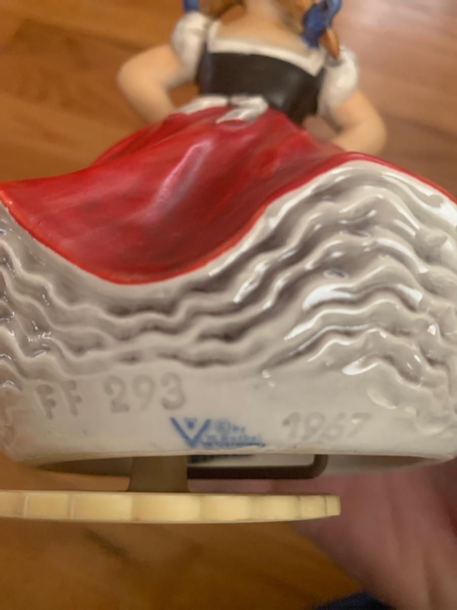 Adorable MAPSA Swiss Mechanics music box with a 1967 Goebel Hummel ceramic girl on top. Piece measures 7” tall x6” diameter. Cannot determine the tune and it is worn on paper on bottom. Plays fine though. Shipping available.