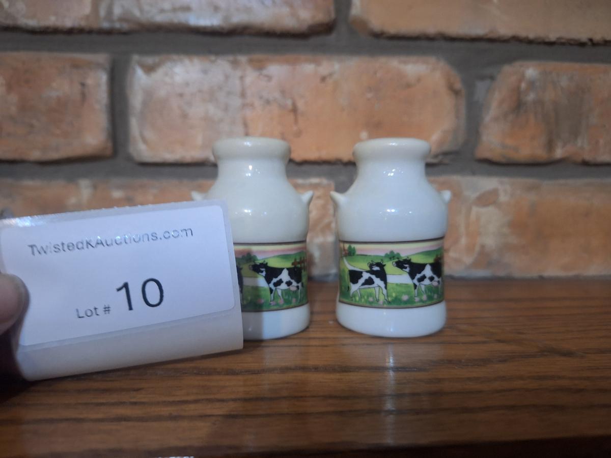 Ceramic milk jug salt and pepper shakers with a Holstein cow design.