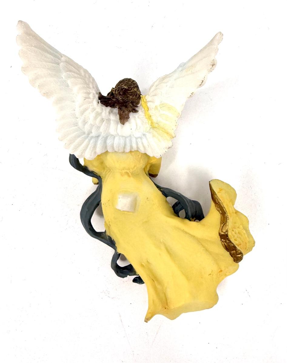 Angel is 6-3/4" tall x 3-1/4" wide. The angel has a square on her back and she fits into the square hole at