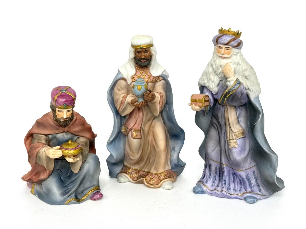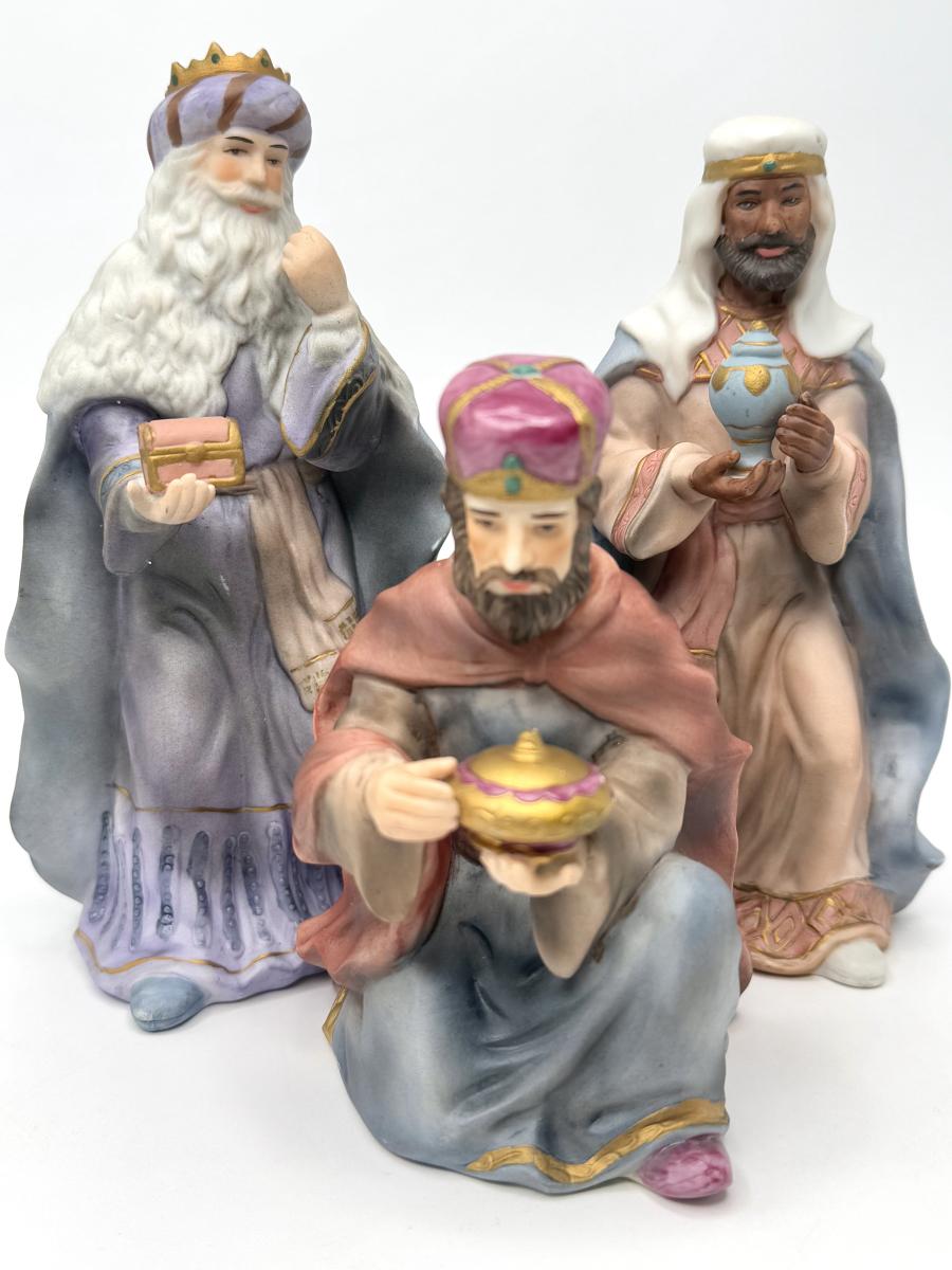 The tallest wiseman is 7-3/4" tall, the other standing one is 7-1/4" tall, and the kneeling one is 5-1/2" tall.
