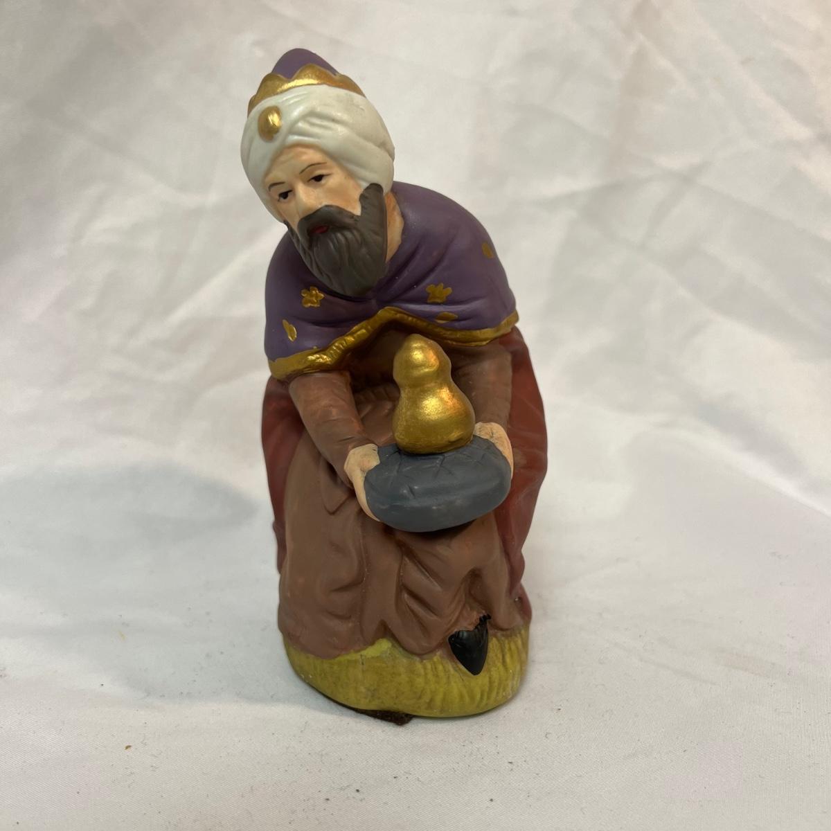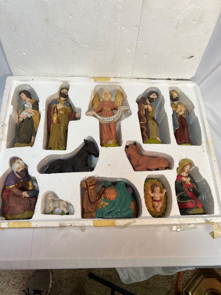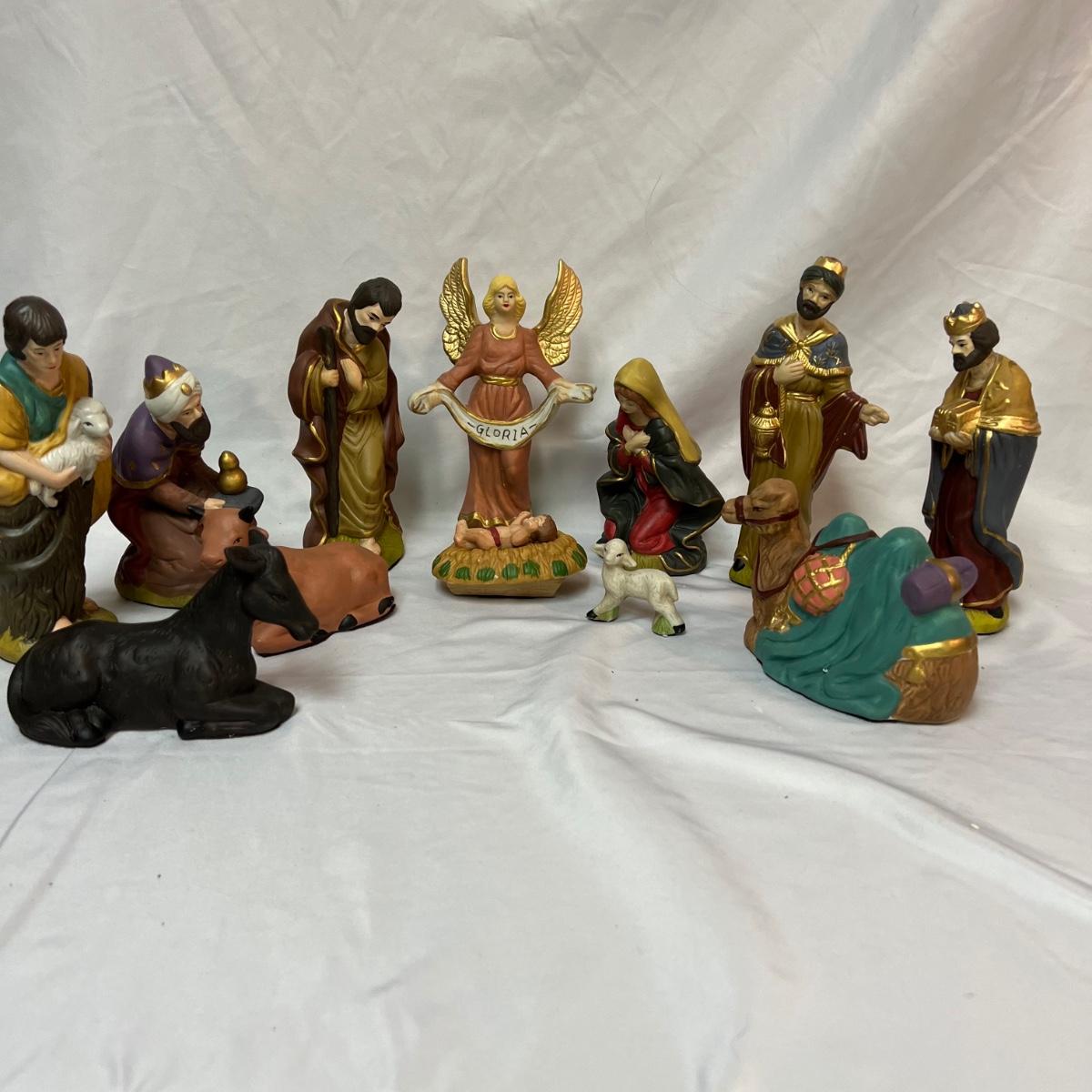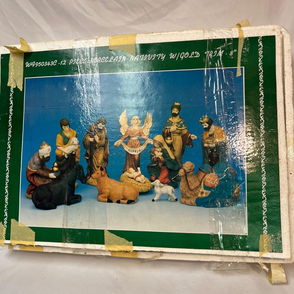 Twelve-piece Porcelain Ceramic Nativity scene in its original packaging. Each piece varies in size with the tallest up to 8”.