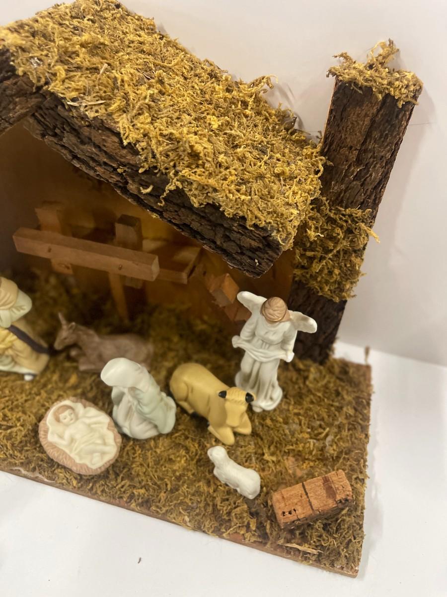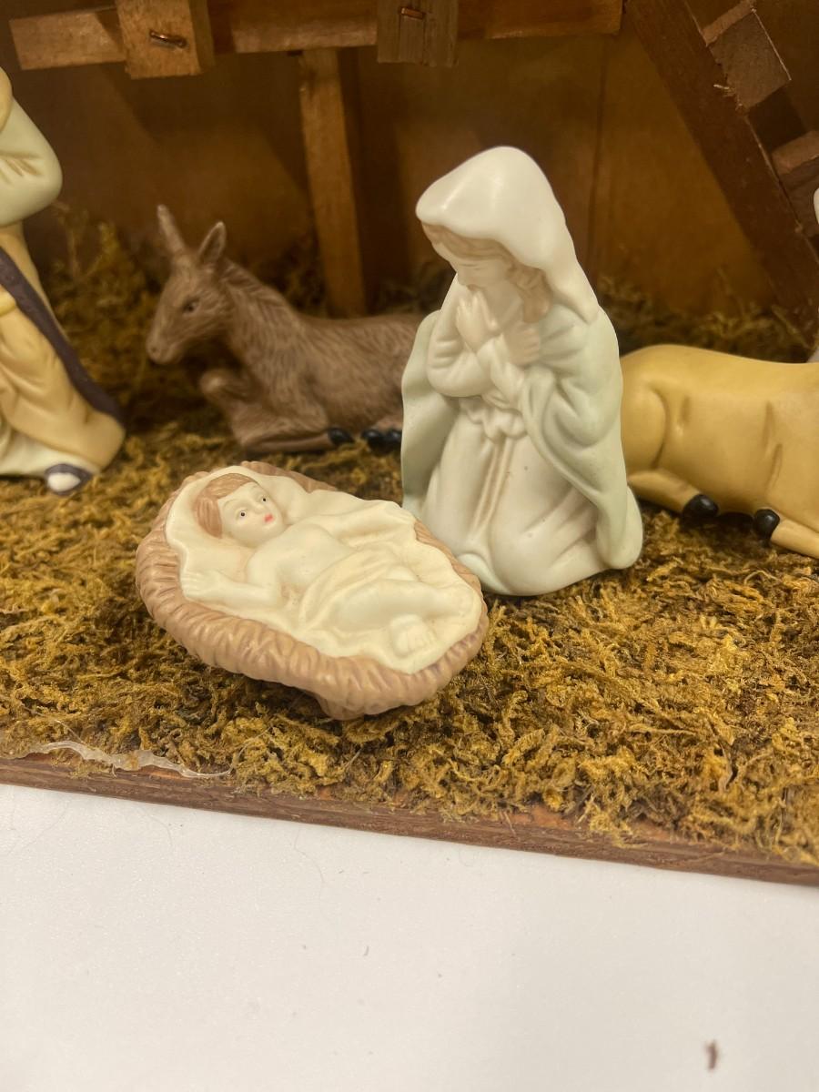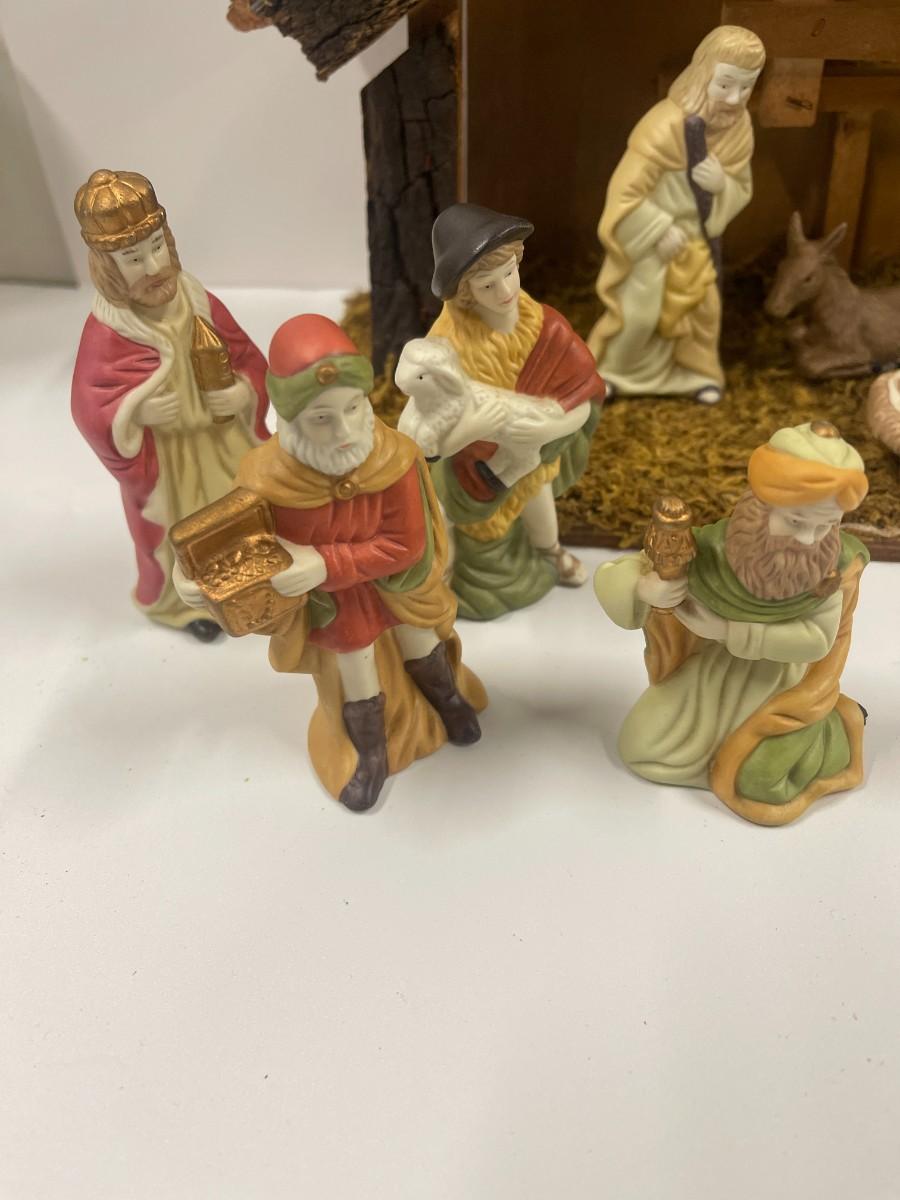 Complete ceramic nativity set with manger. For a sense of scale manger is 13 1/2" long x 9" high x 6" deep. 11 figures plus manger.
