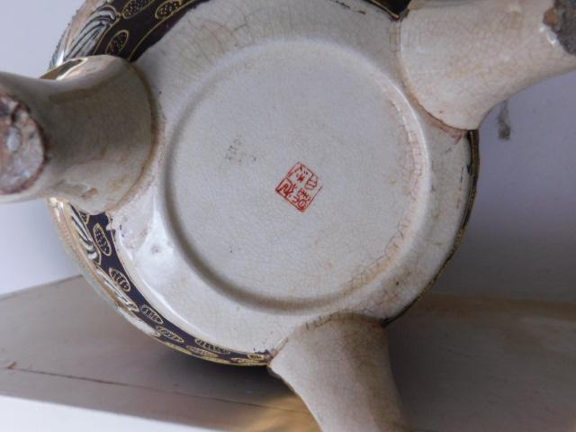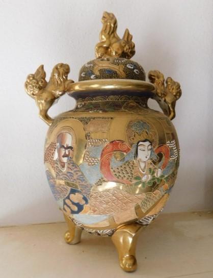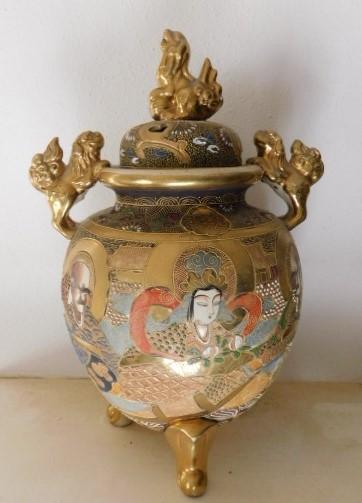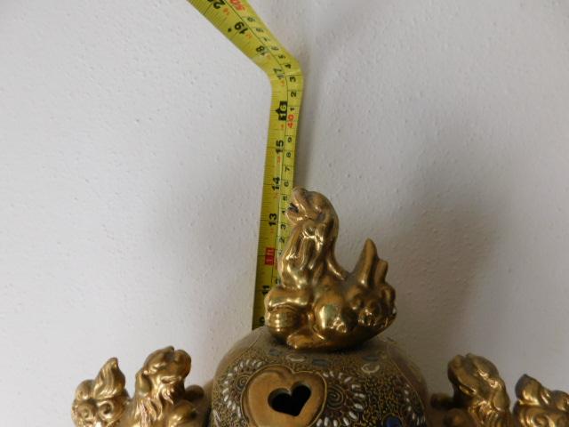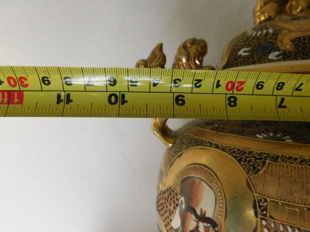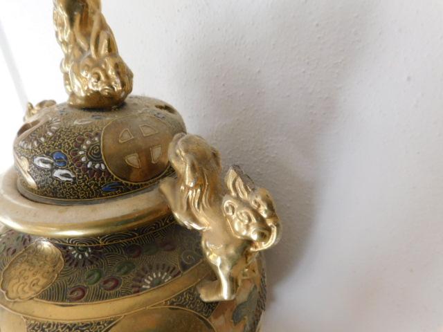 Ceramic Oriental Design Incense Jar with Foo Dog Accent large piece. One dragon dog has chipped tail as shown.
