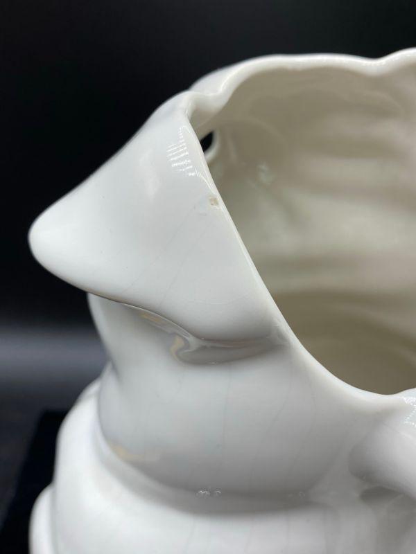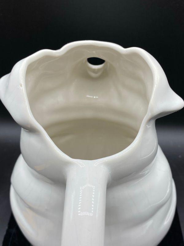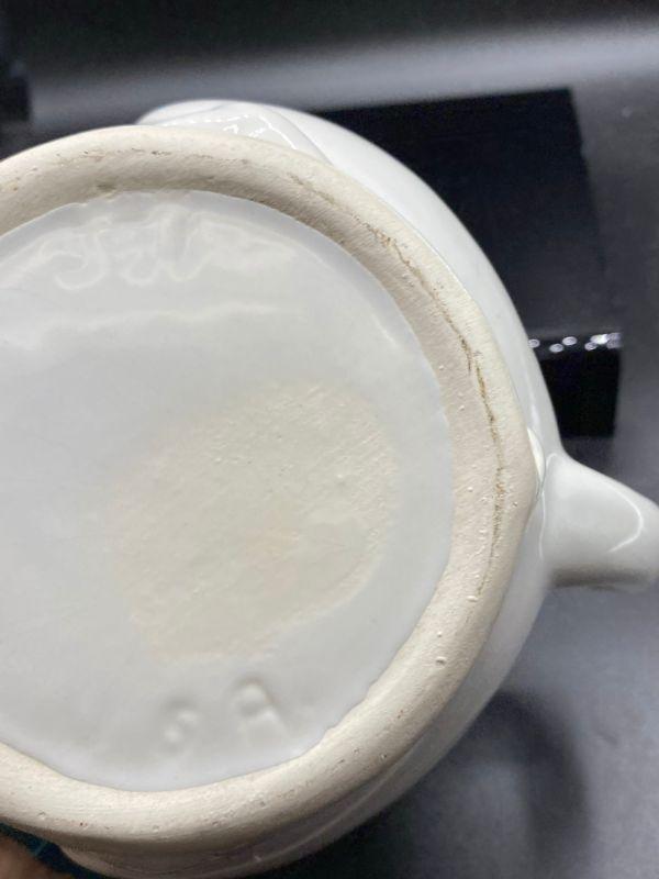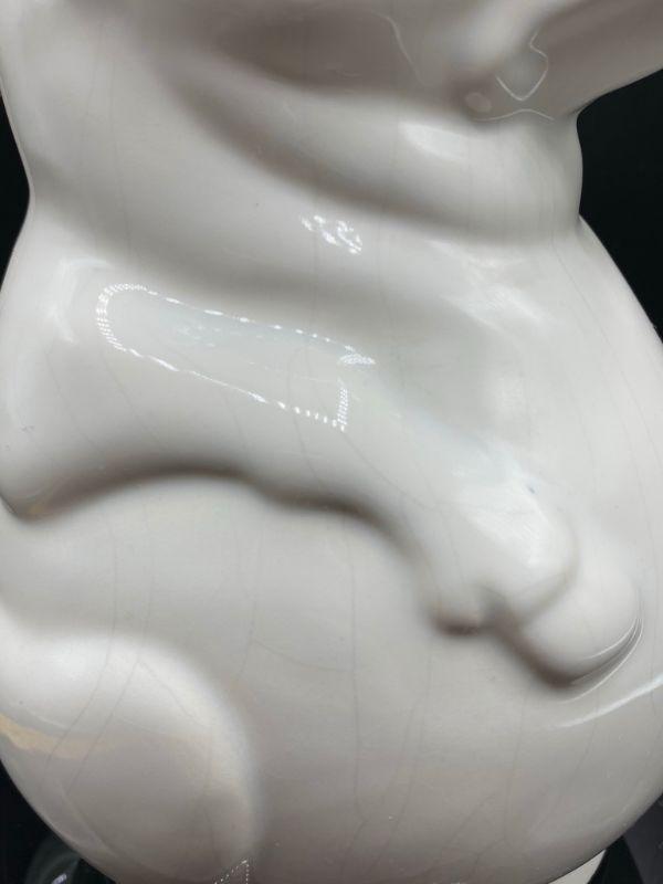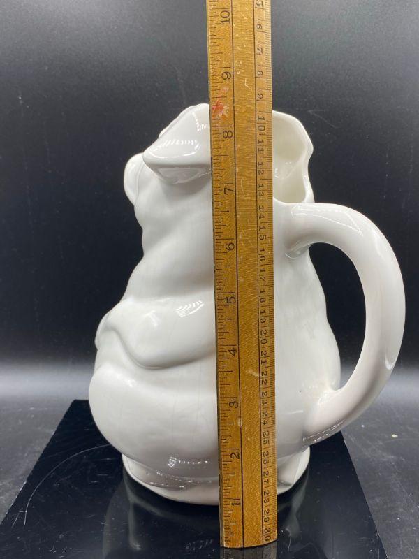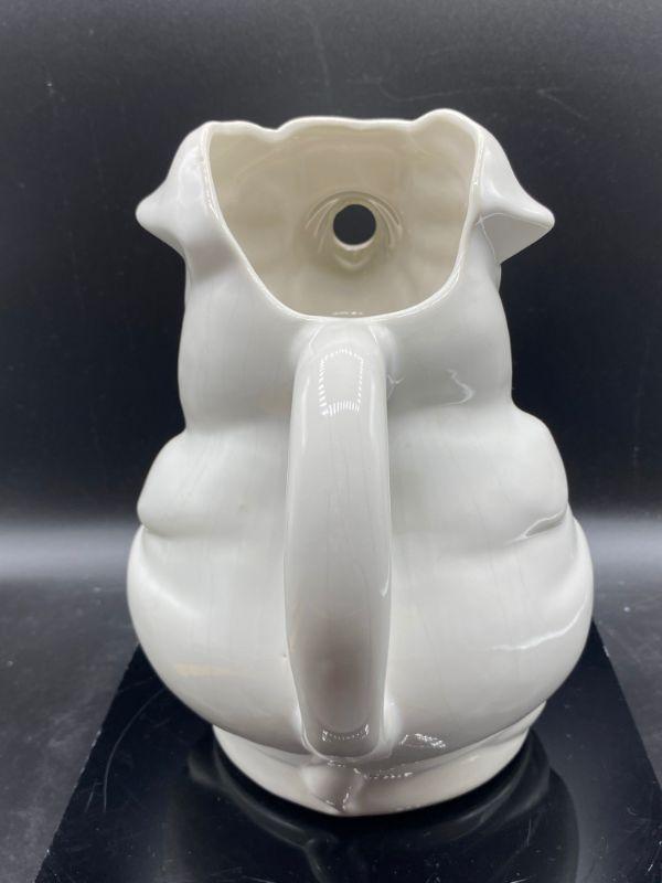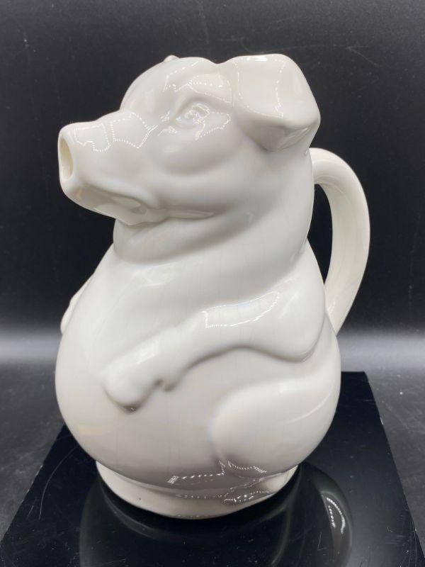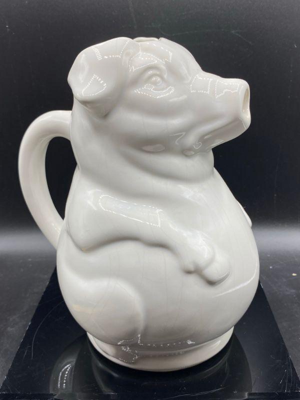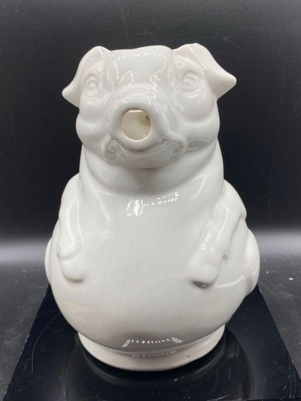 White ceramic pig water pitcher. Water pours from the snout. USA pottery mark on the bottom. There is crazing to the glaze but displays great. Stands about 8.5" tall.