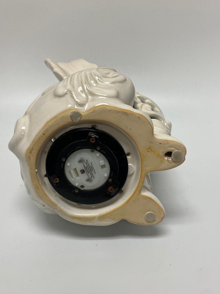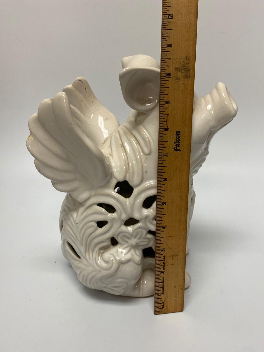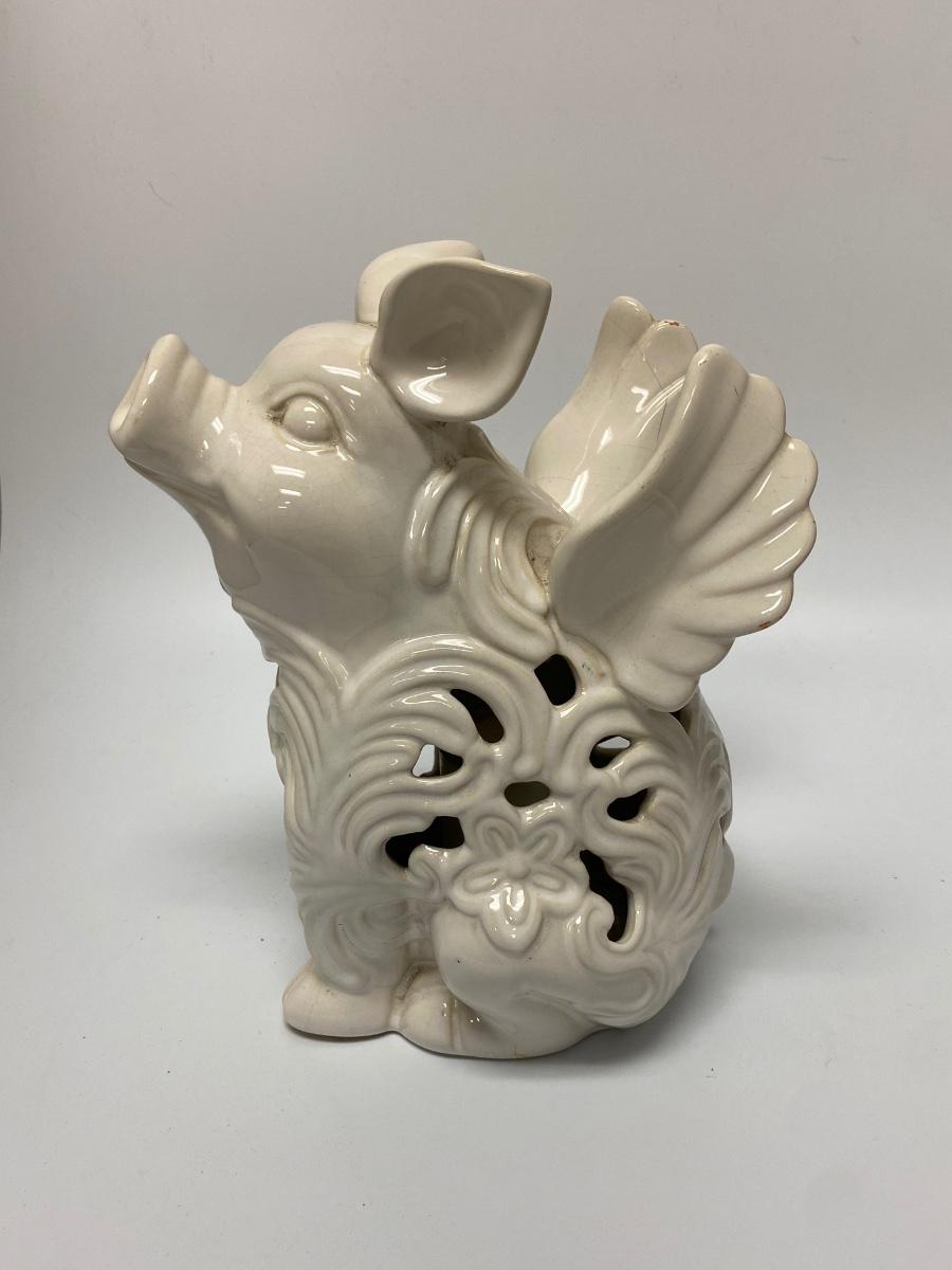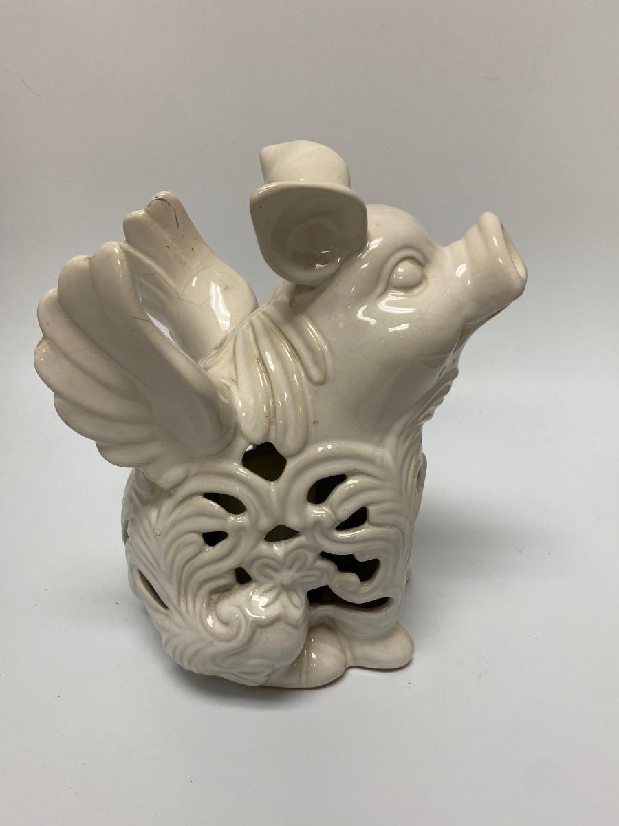 Ceramic pig with wing garden light. Battery-operated, untested. Whaite finish has crazing from age and being outdoors. Displays nicely without light. Great for patio, garden or in the home. About 10" size.