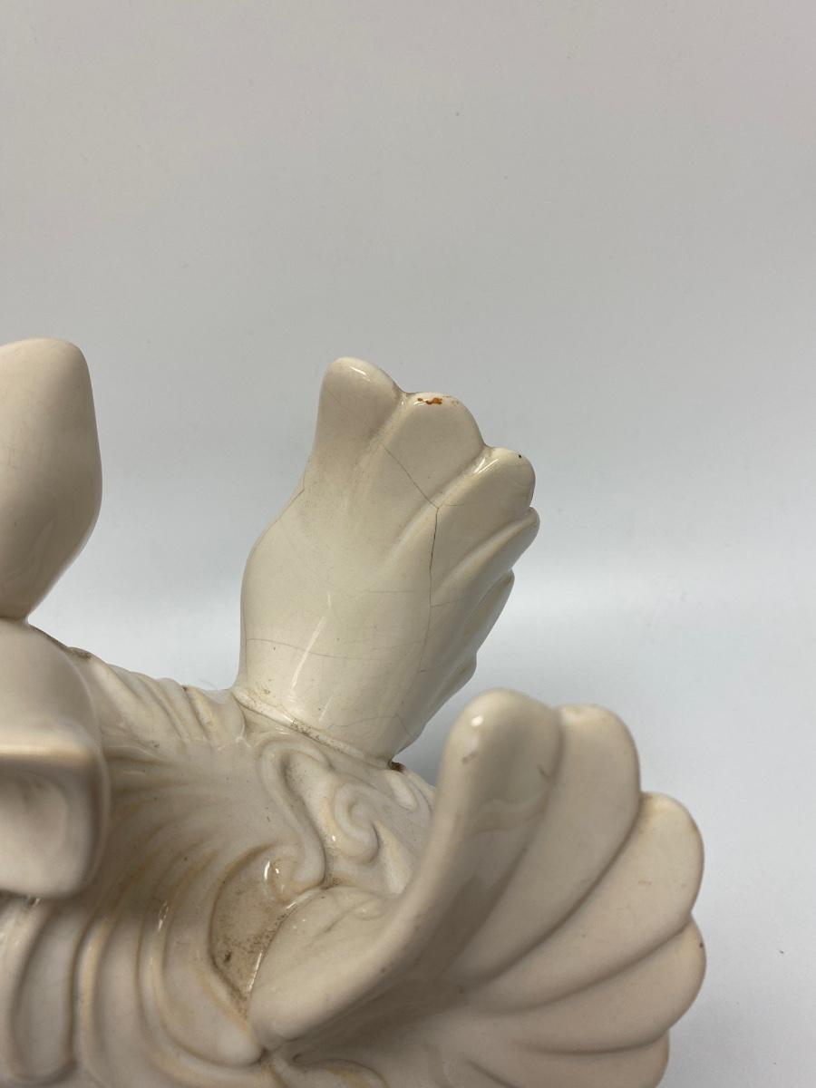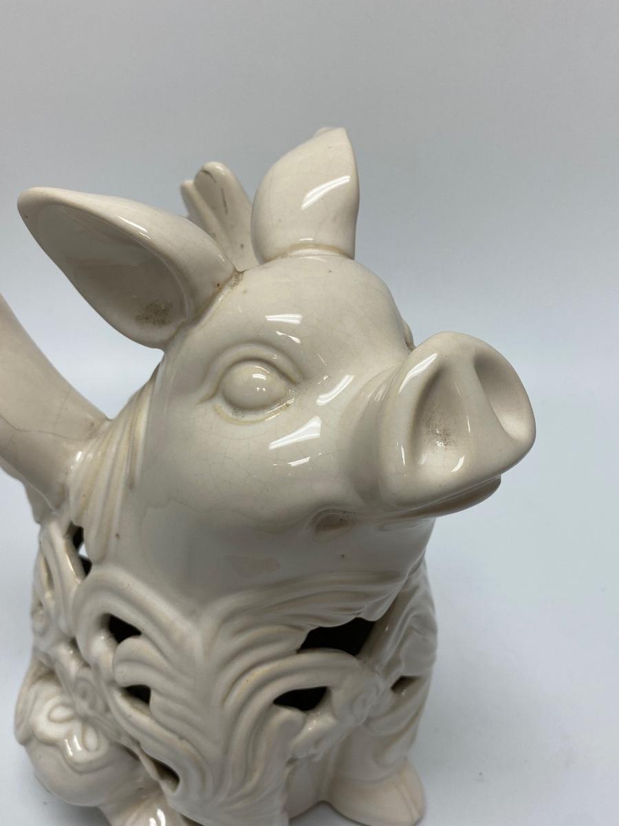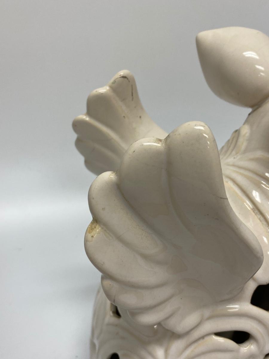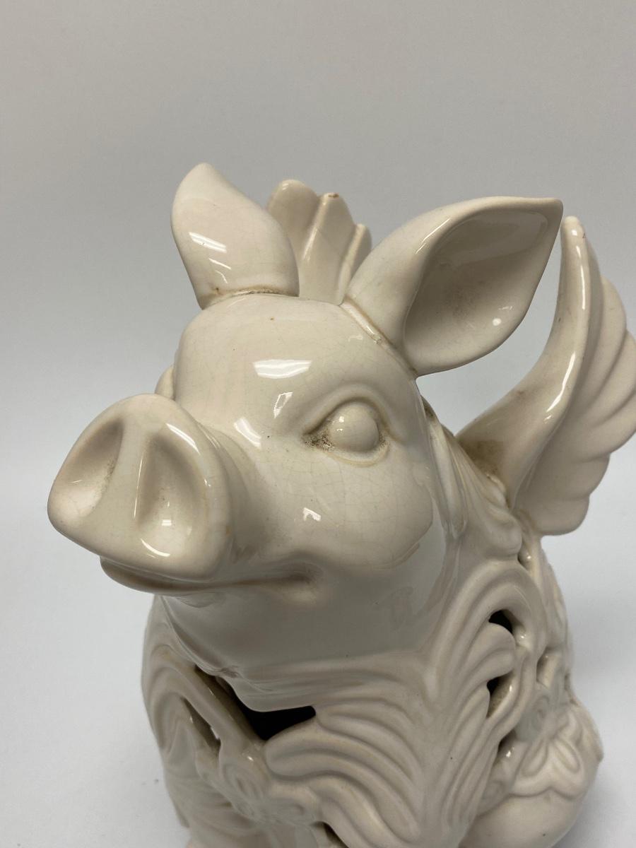 Ceramic pig with wing garden light. Battery-operated, untested. Whaite finish has crazing from age and being outdoors. Displays nicely without light. Great for patio, garden or in the home. About 10" size.