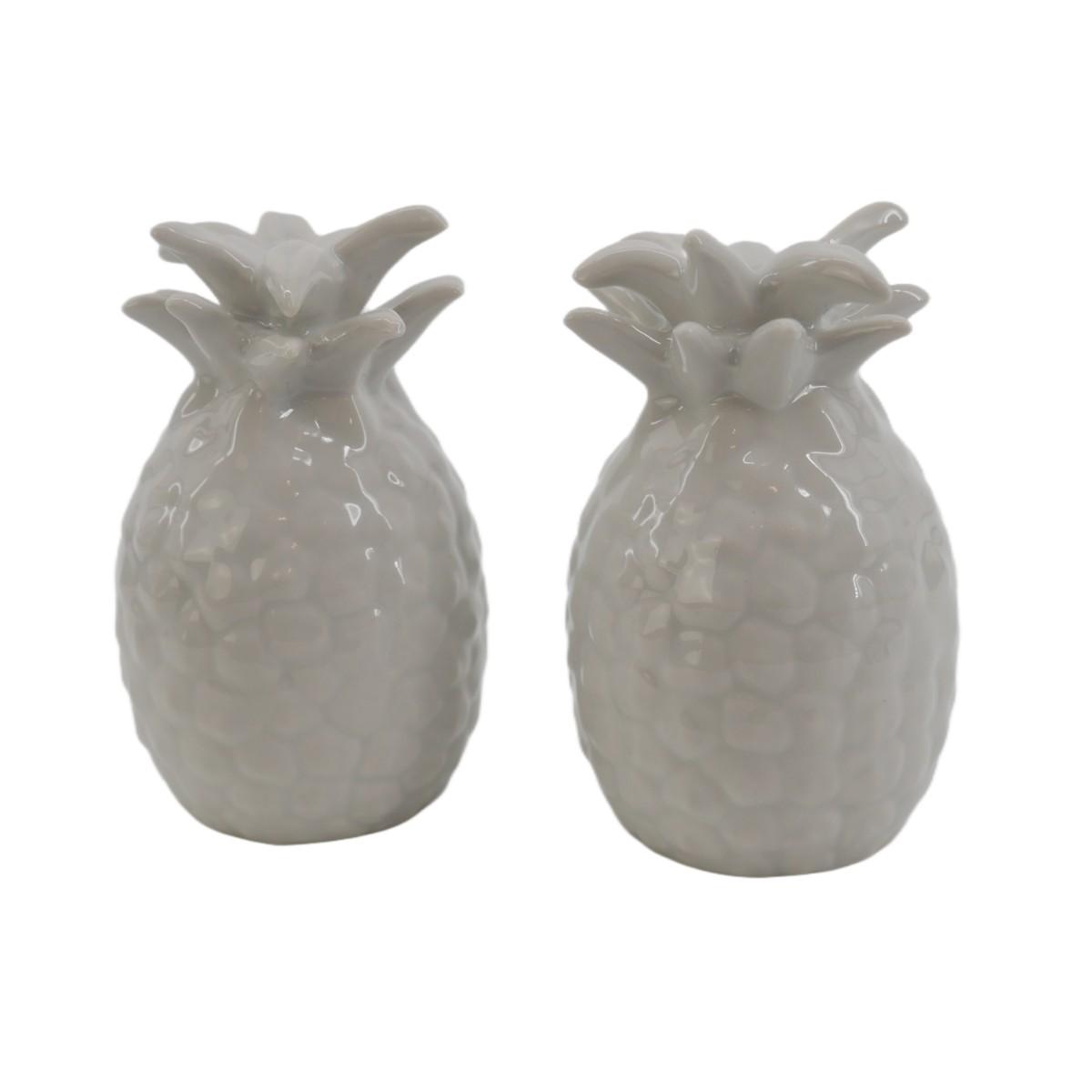 Ceramic pineapple salt and pepper shakers. No issues found. Each measures 1.75" x 1.75", total weight is 5.4 oz.