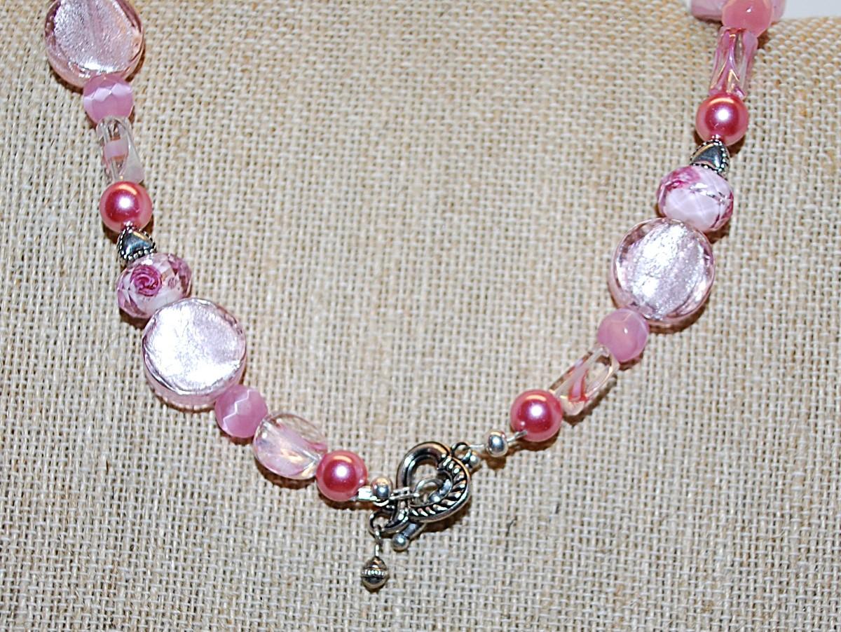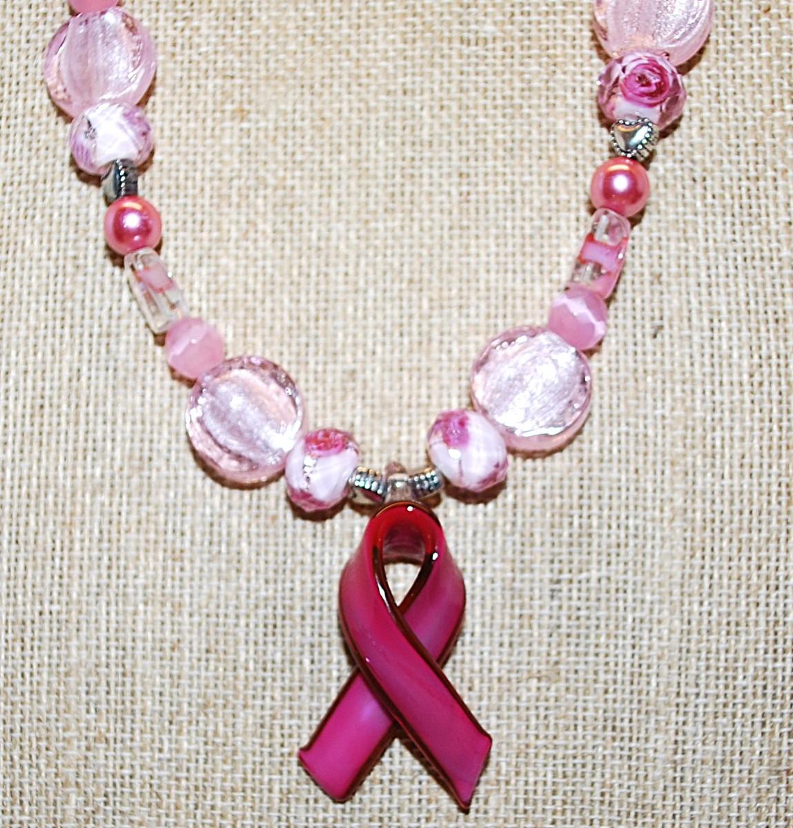 Ceramic PINK RIBBON NECKLACE with "Rose Filled" Bead Accents, Disks, Hearts and HEART Toggle Clasp 24" L