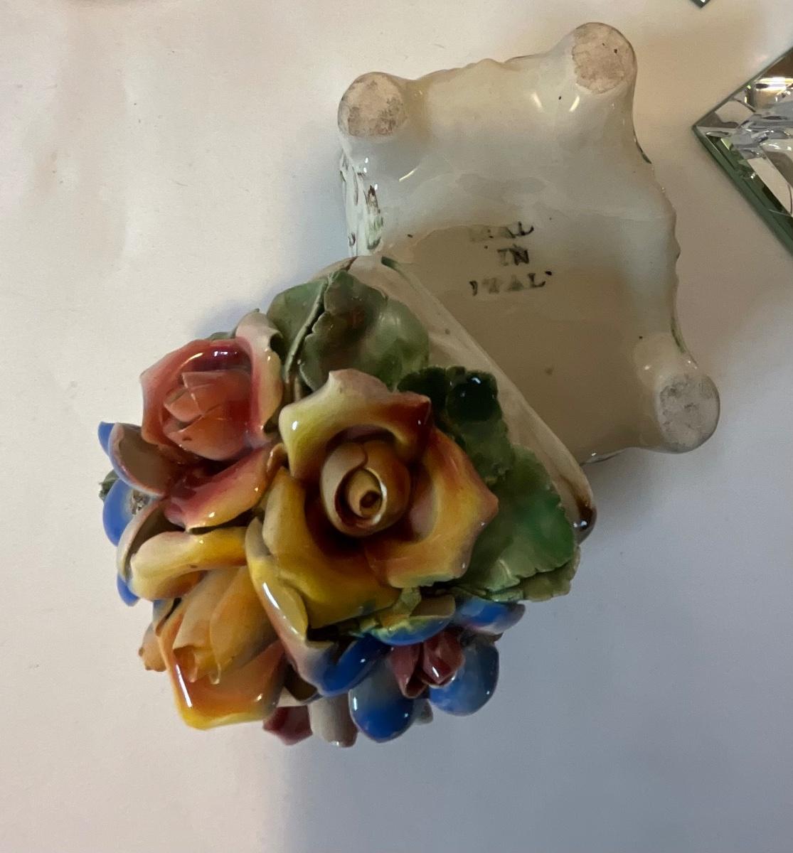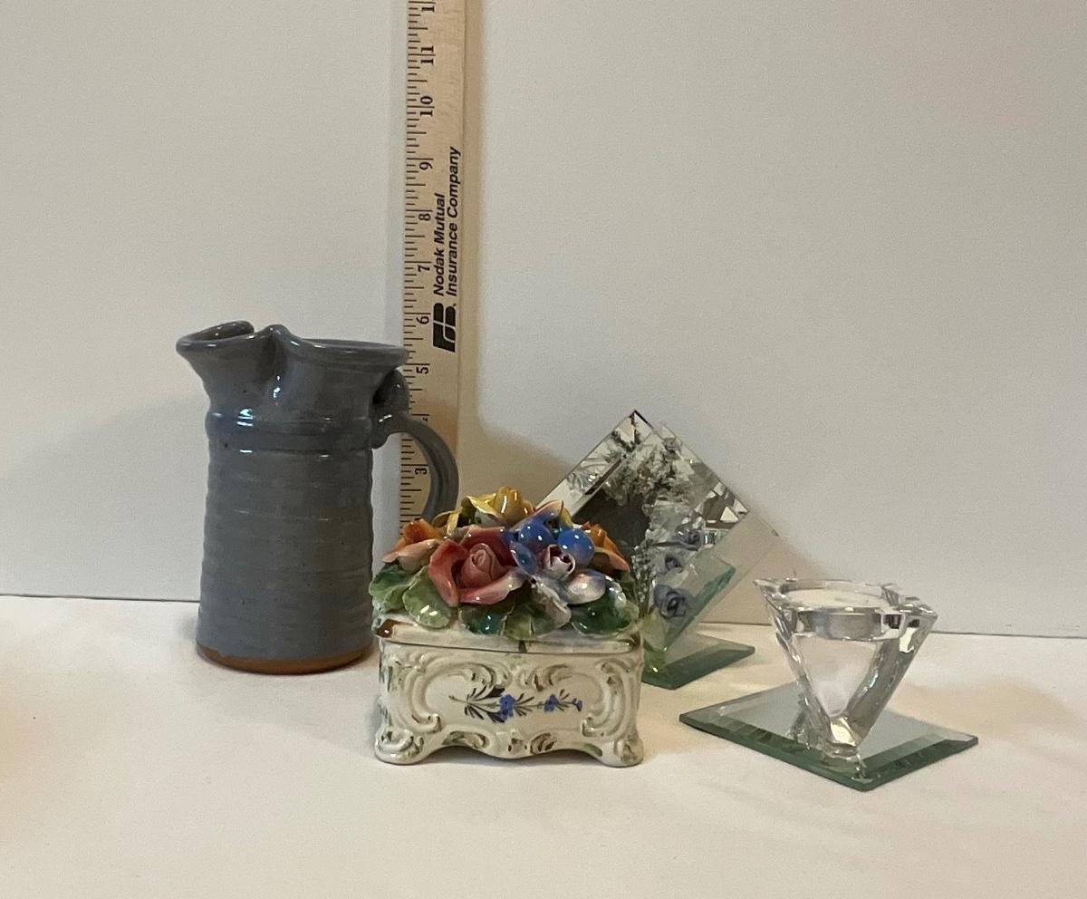 Ceramic pitcher, flowered trinket box, glass candle holders