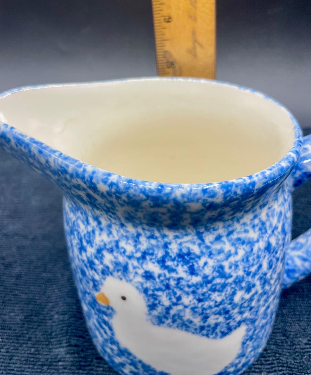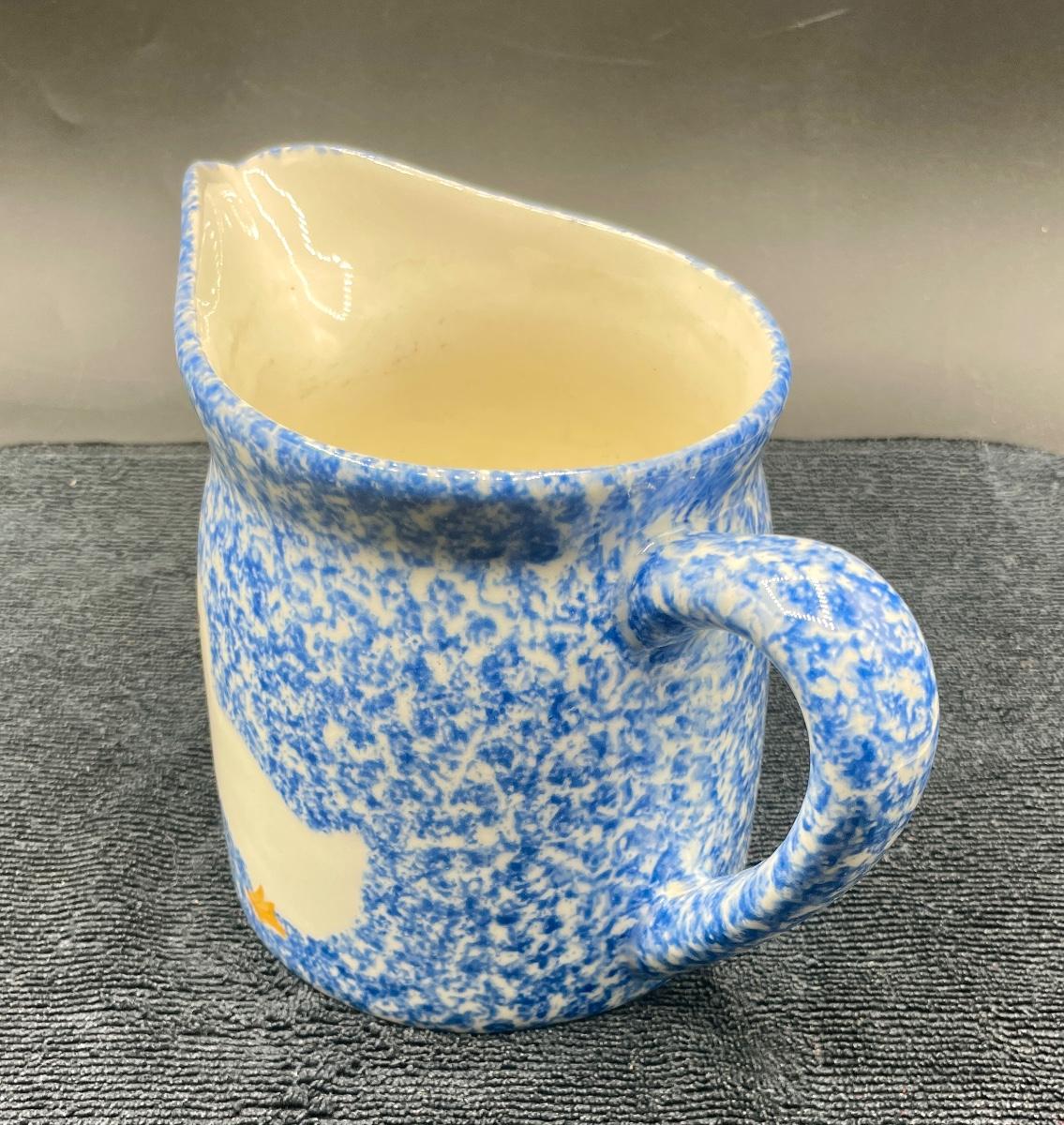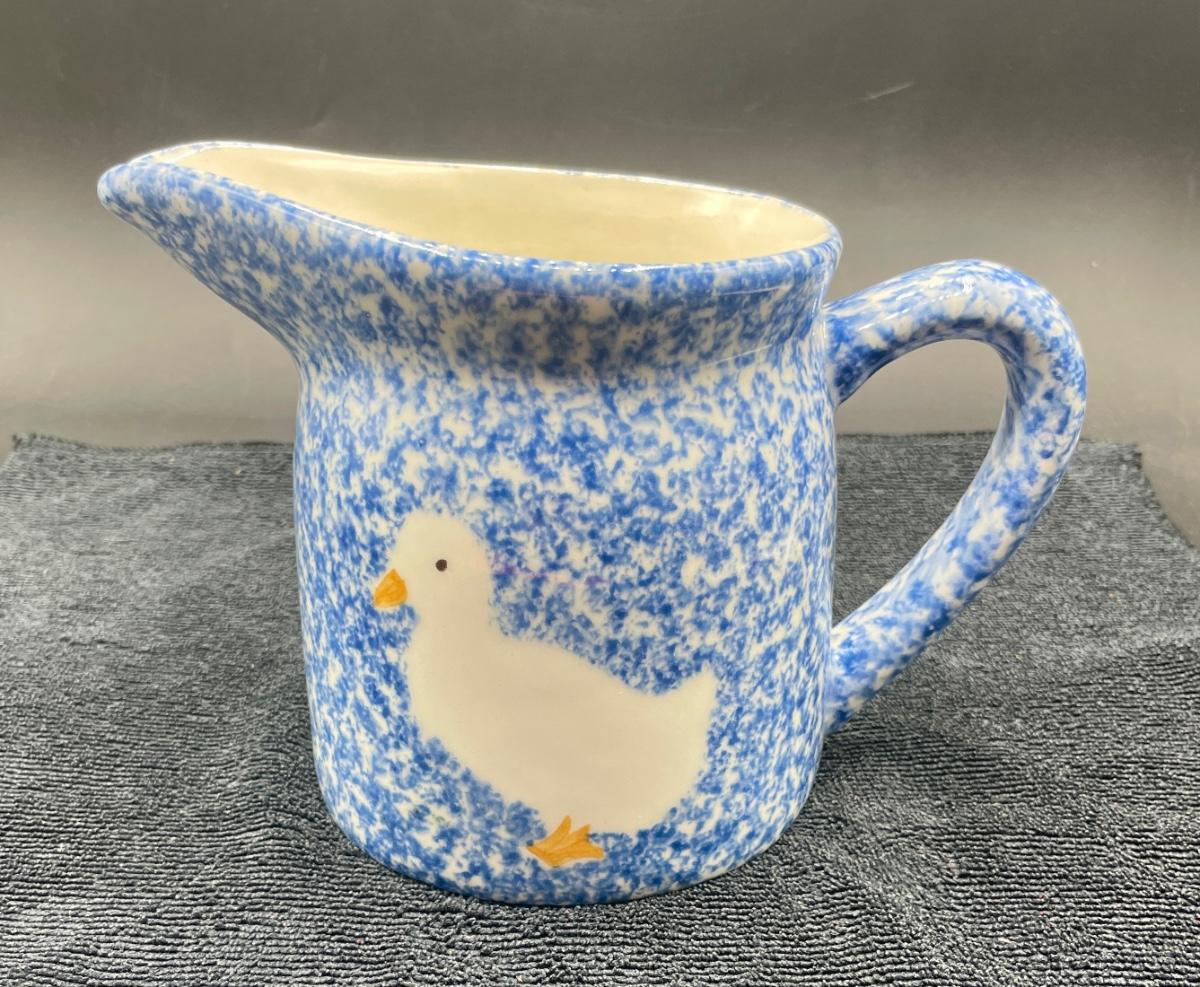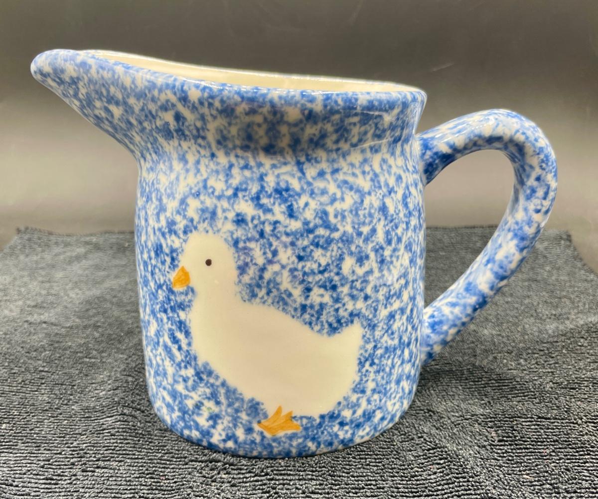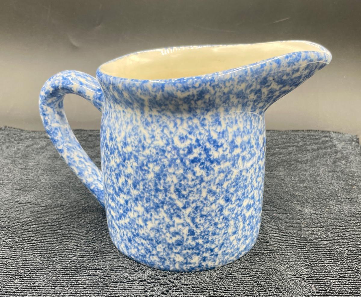Speckled-blue outside, cream-color inside. Good condition, no chips or cracks. Approx. 5" tall.