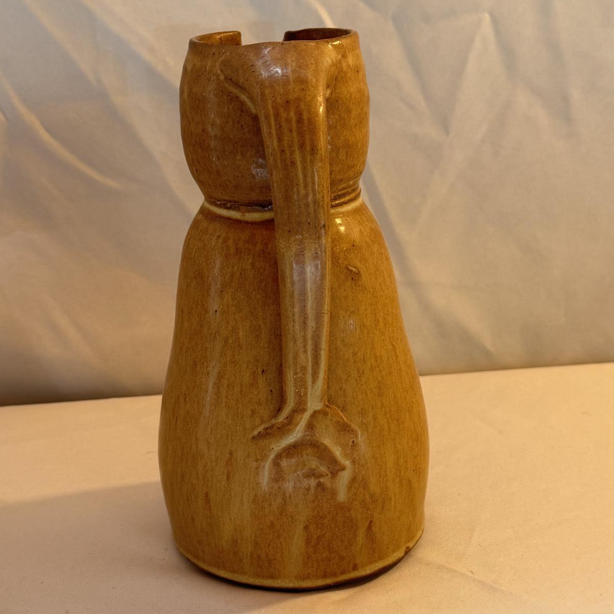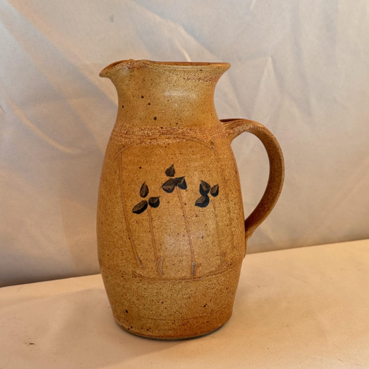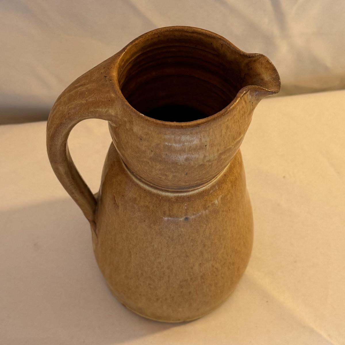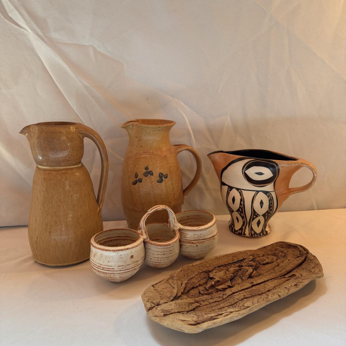 This lot includes three ceramic pitchers (one is marked), one ceramic dish/trinket holder, and one ceramic basket with three pockets. The largest piece is the tan ceramic pitcher that measures 6” x 3” x 10”H. This measurement includes the handle. There is a small crack on the back of the ceramic dish - see picture included. Shipping available.