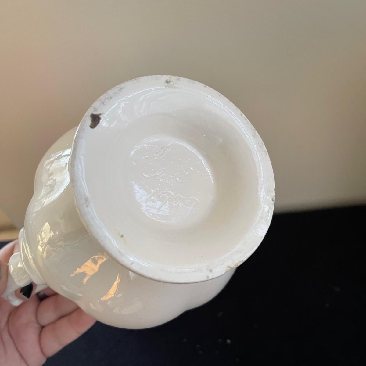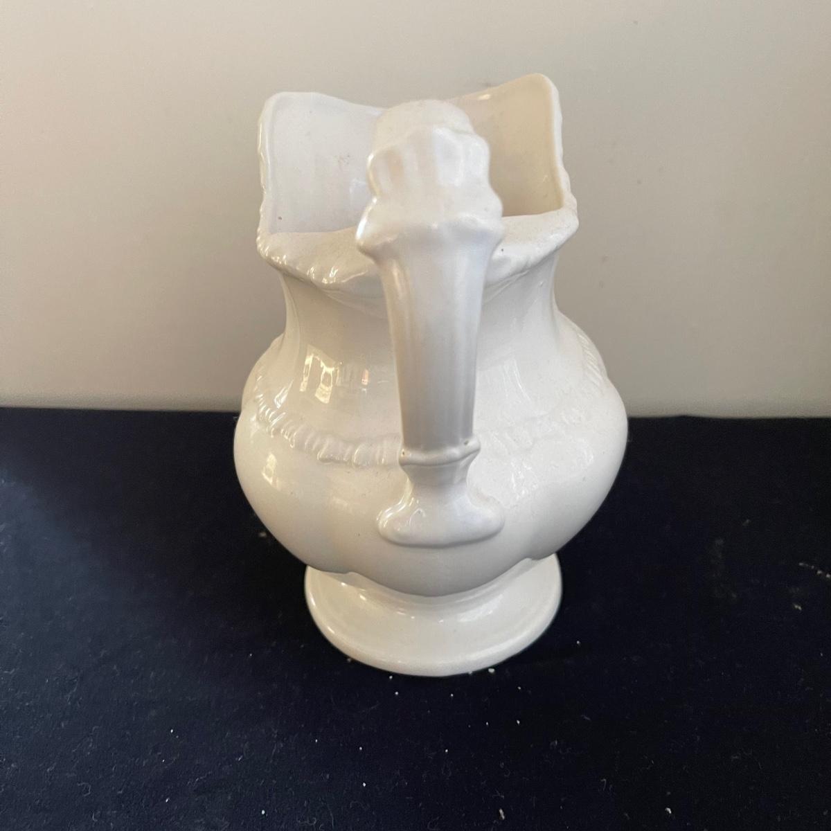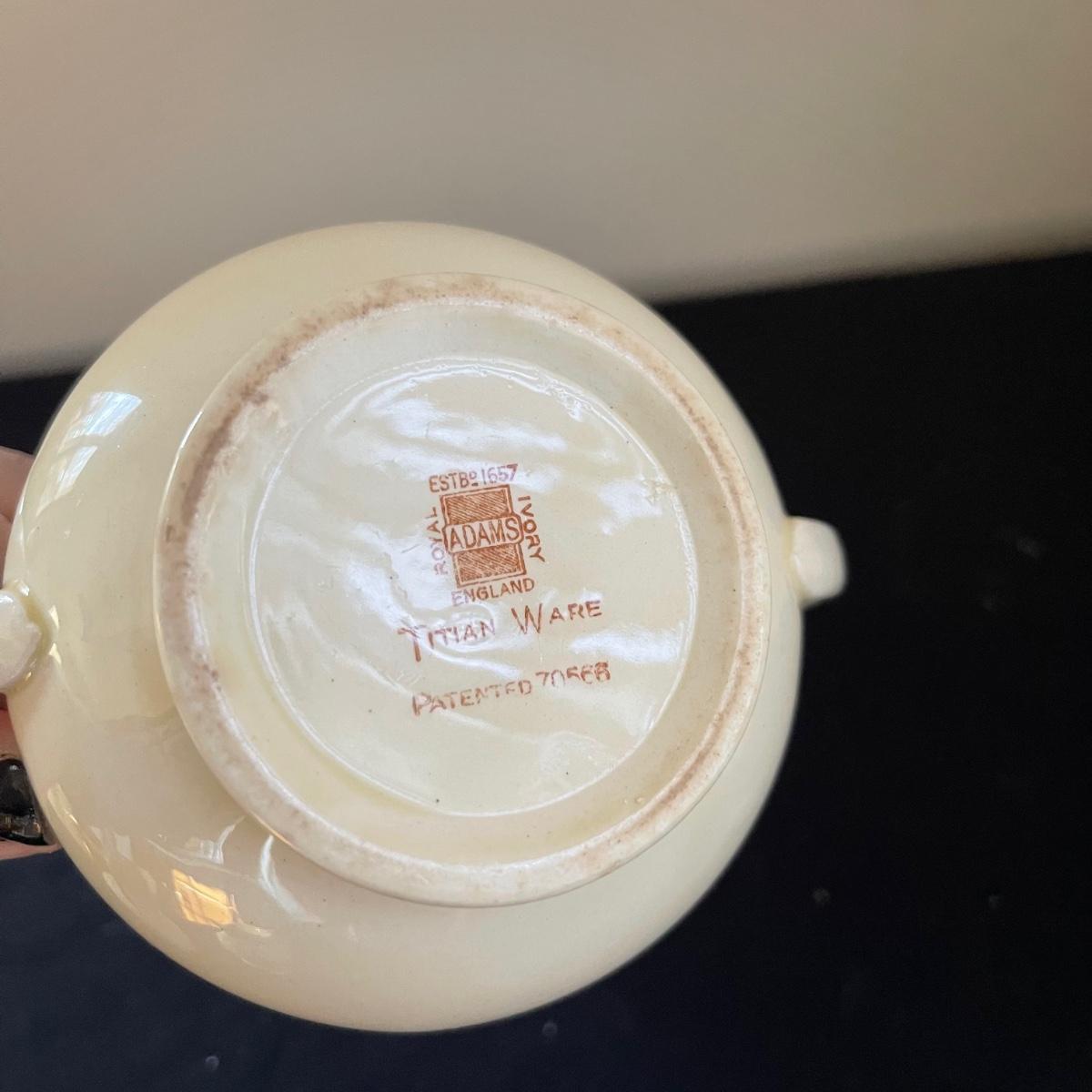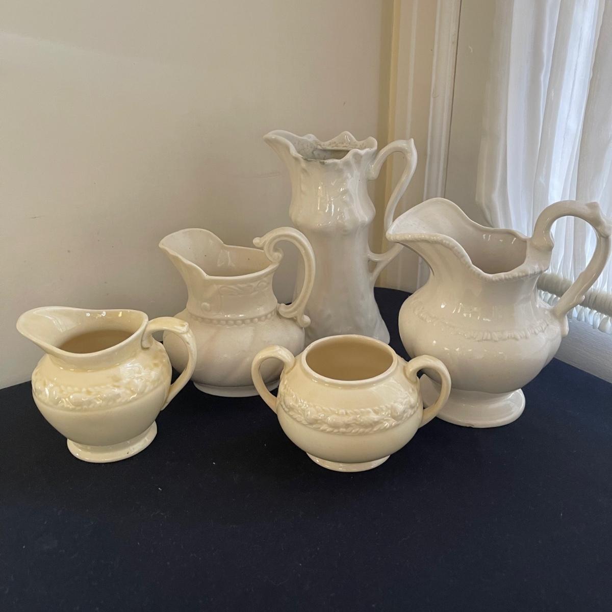 Collection of four white small ceramic pitchers and a sugar dish. The sugar dish and it’s matching pitcher are Titian Ware, made in England, and has Adams, royal, and ivory printed on them as well. The other pitcher with a stamp is Lenox brand. The tallest of the pitchers is 7.5”. Shipping available.