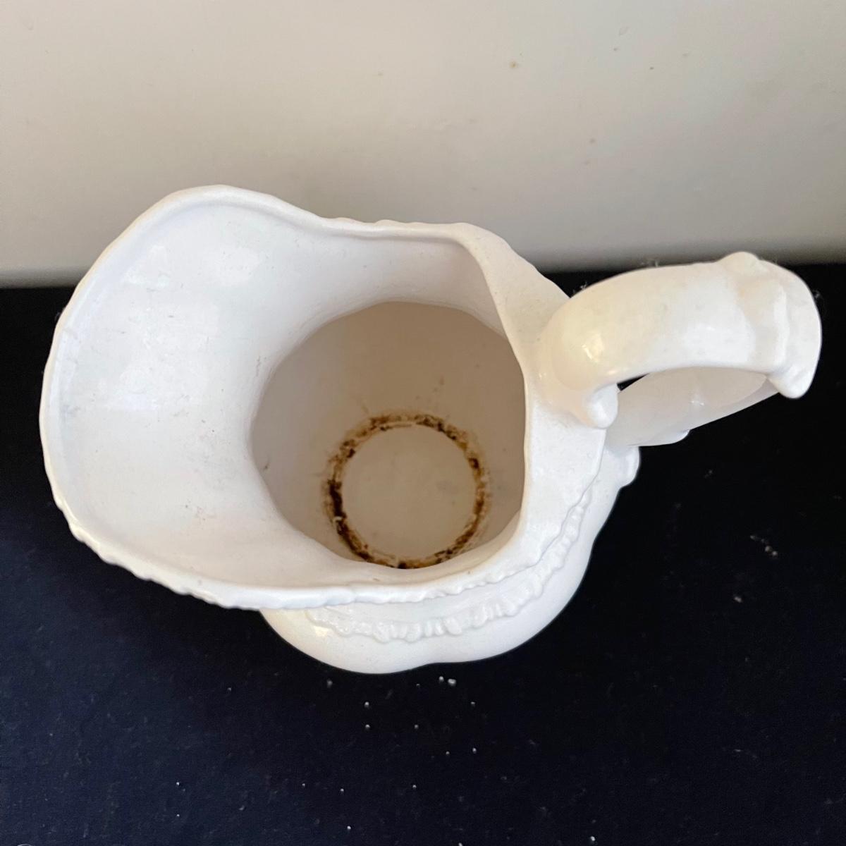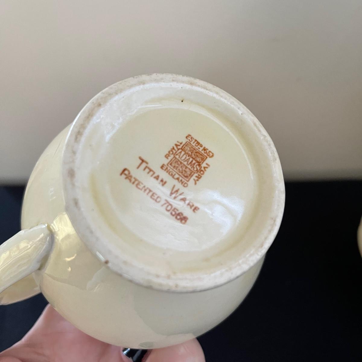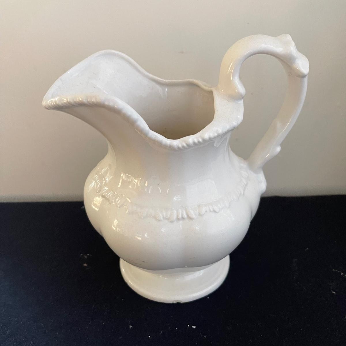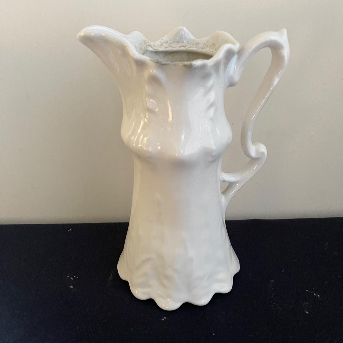 Collection of four white small ceramic pitchers and a sugar dish. The sugar dish and it’s matching pitcher are Titian Ware, made in England, and has Adams, royal, and ivory printed on them as well. The other pitcher with a stamp is Lenox brand. The tallest of the pitchers is 7.5”. Shipping available.