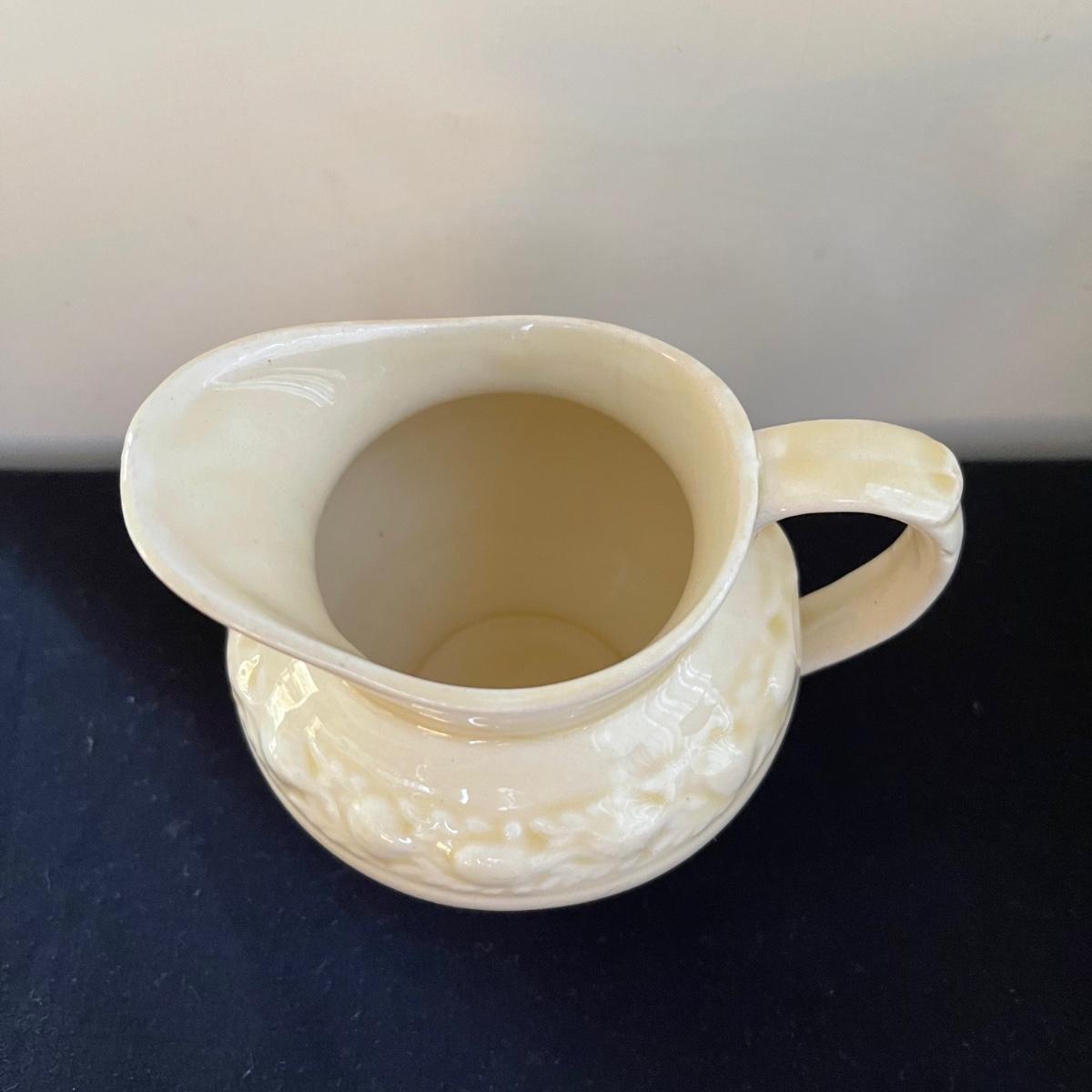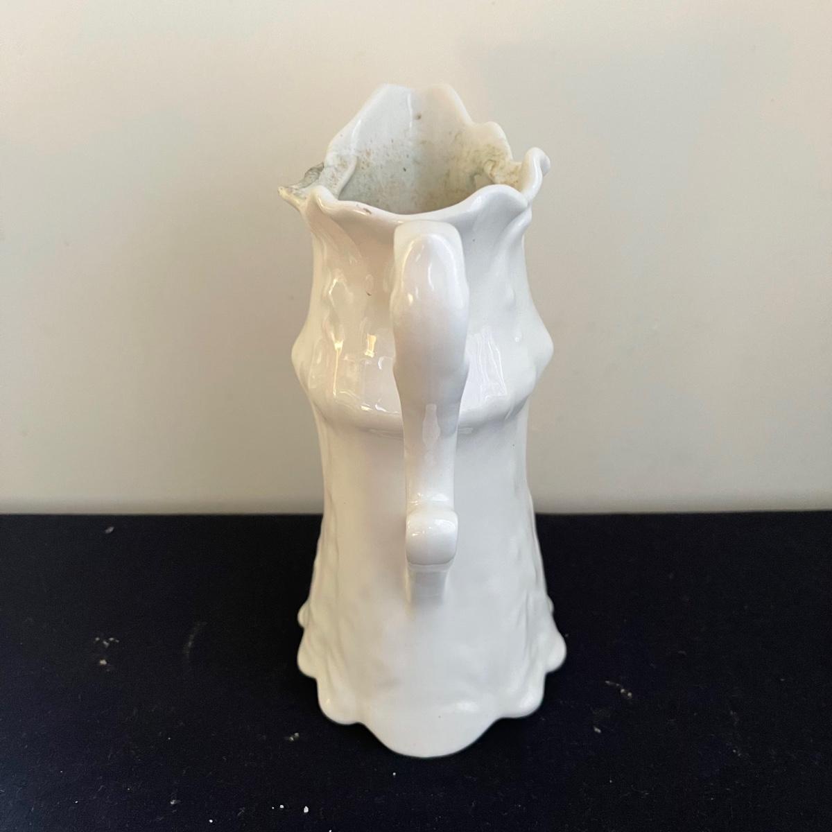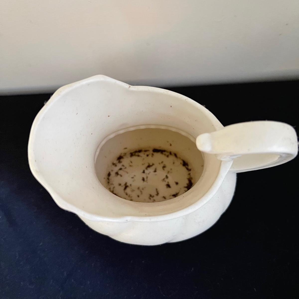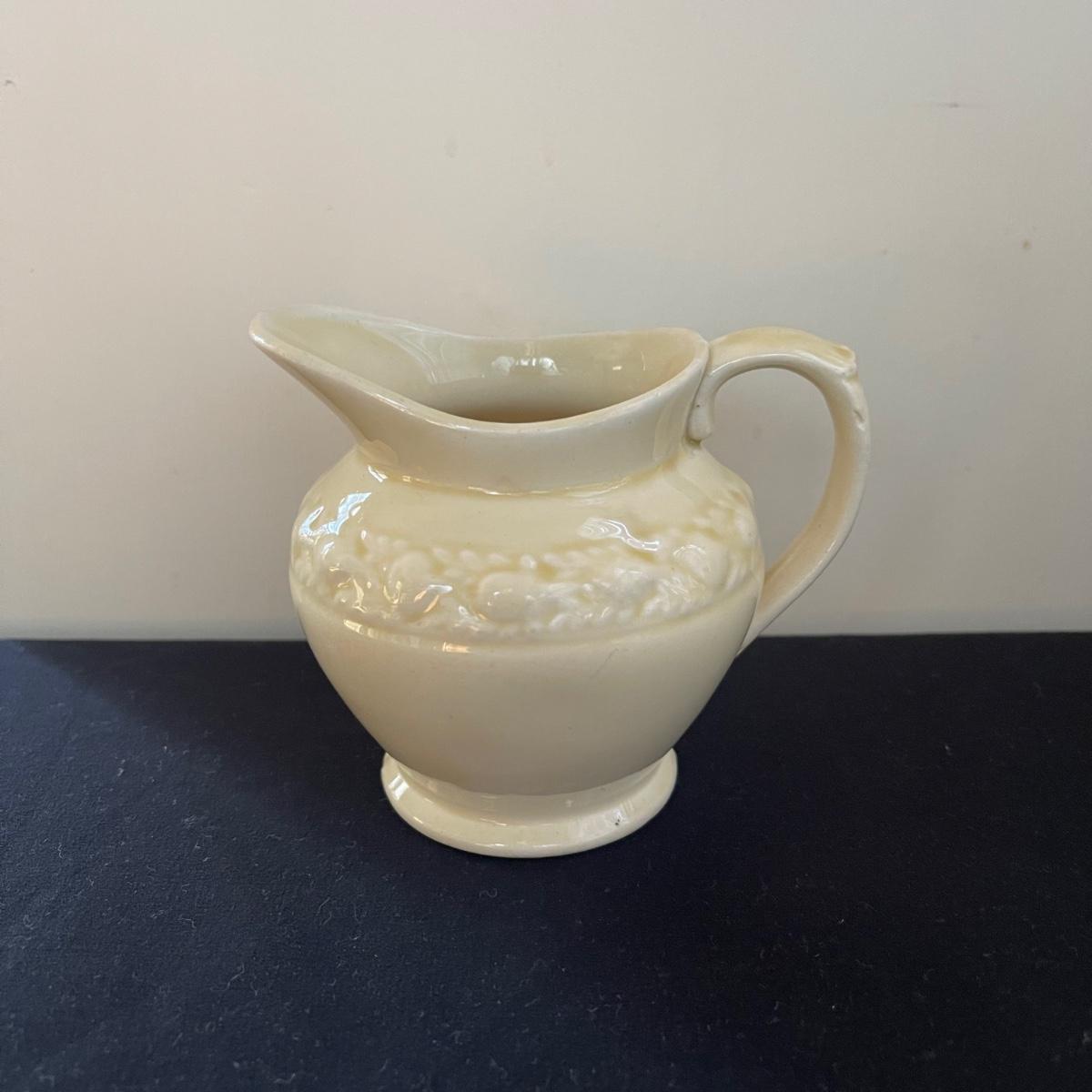 Collection of four white small ceramic pitchers and a sugar dish. The sugar dish and it’s matching pitcher are Titian Ware, made in England, and has Adams, royal, and ivory printed on them as well. The other pitcher with a stamp is Lenox brand. The tallest of the pitchers is 7.5”. Shipping available.
