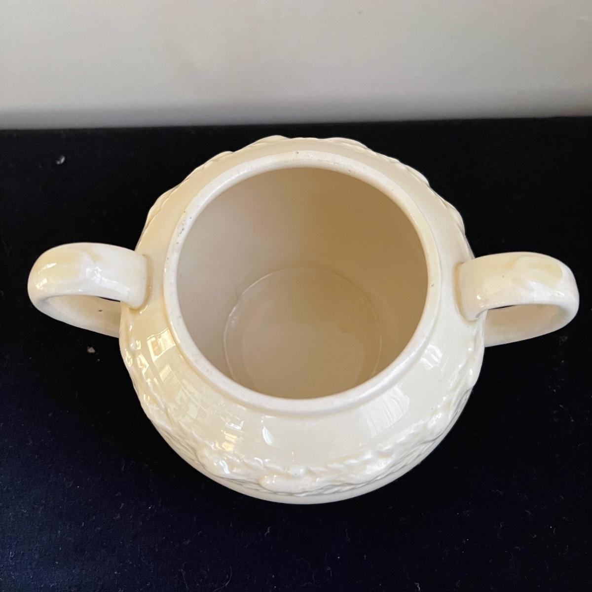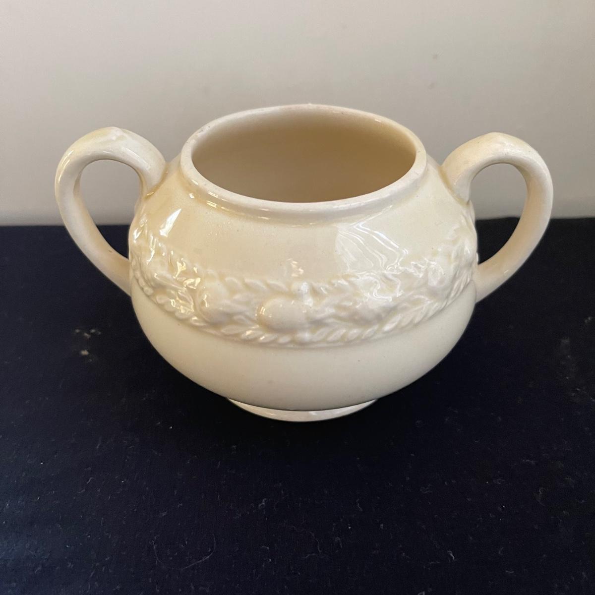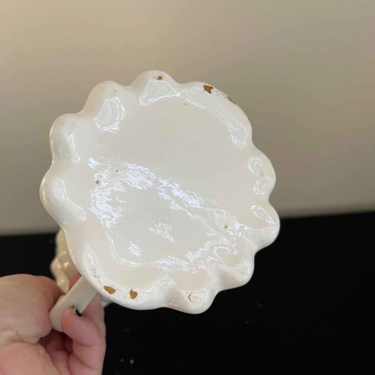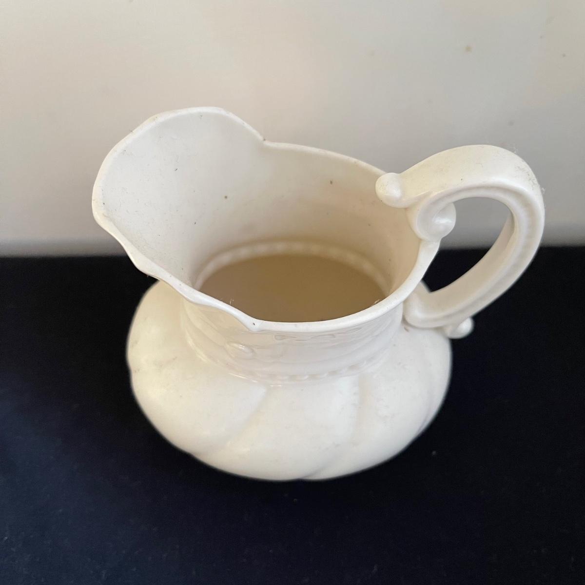Collection of four white small ceramic pitchers and a sugar dish. The sugar dish and it’s matching pitcher are Titian Ware, made in England, and has Adams, royal, and ivory printed on them as well. The other pitcher with a stamp is Lenox brand. The tallest of the pitchers is 7.5”. Shipping available.