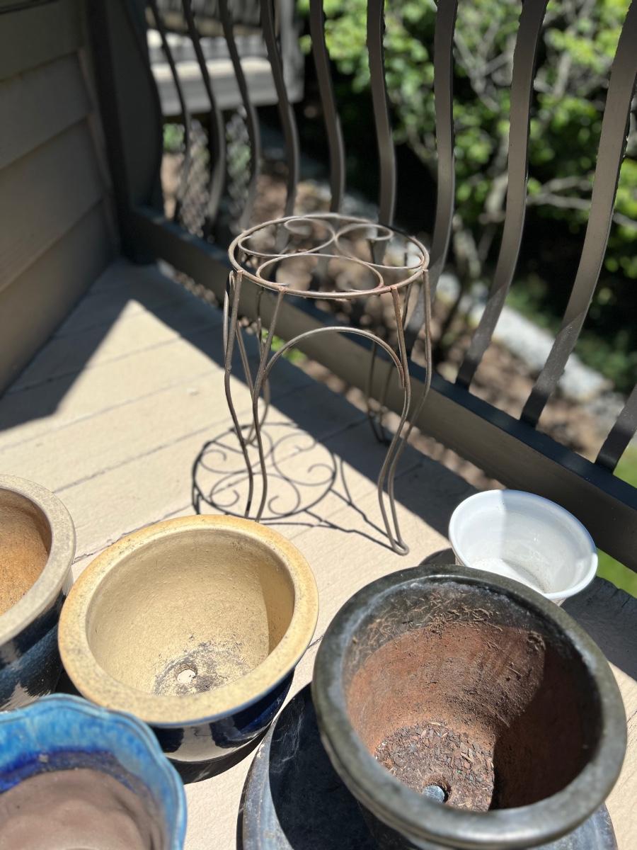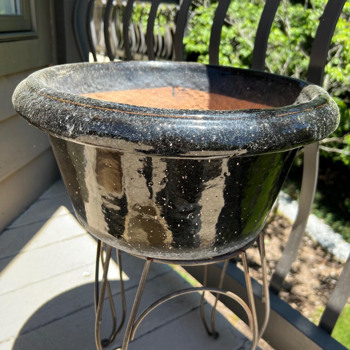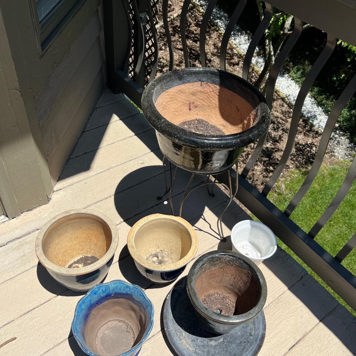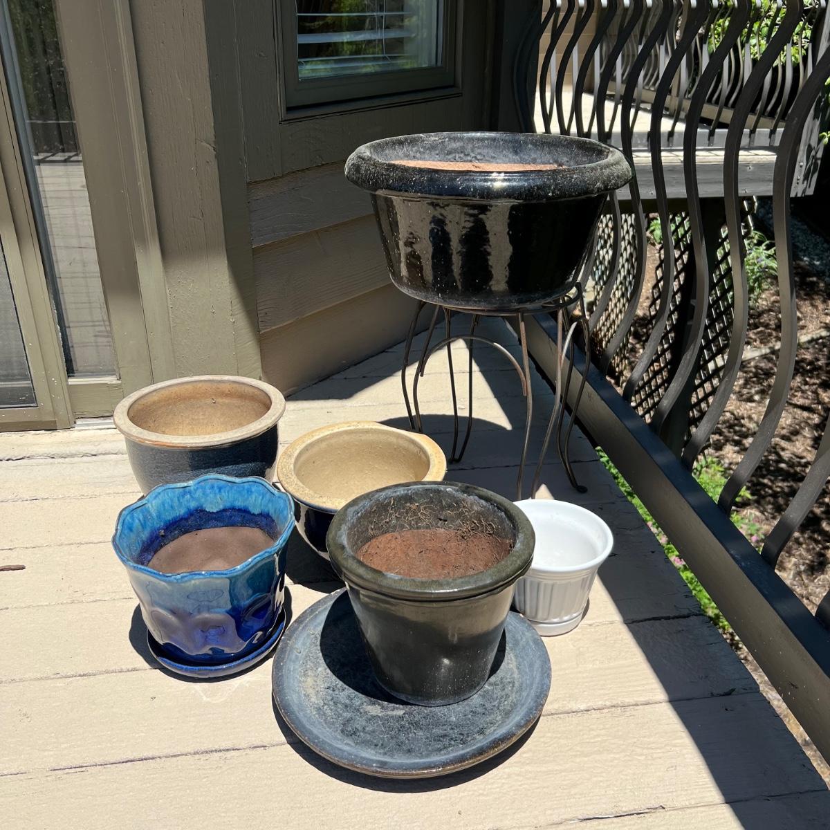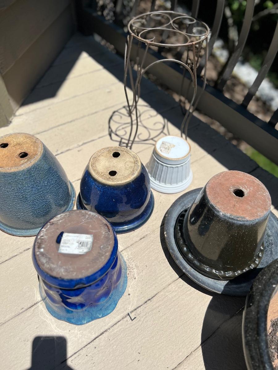 A nice assortment of ceramic plants pots in this lot with the largest, the black pot, measuring 15” D x 7” H. The metal pot stand measures 9” D x 15” H. The white square piece is 12" x 12" x 24"H and is a plaster mold..