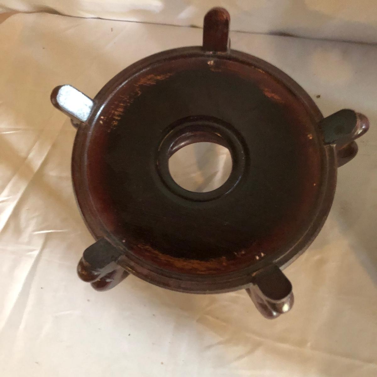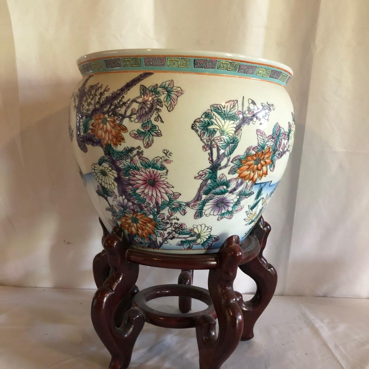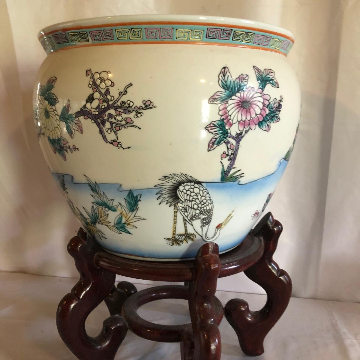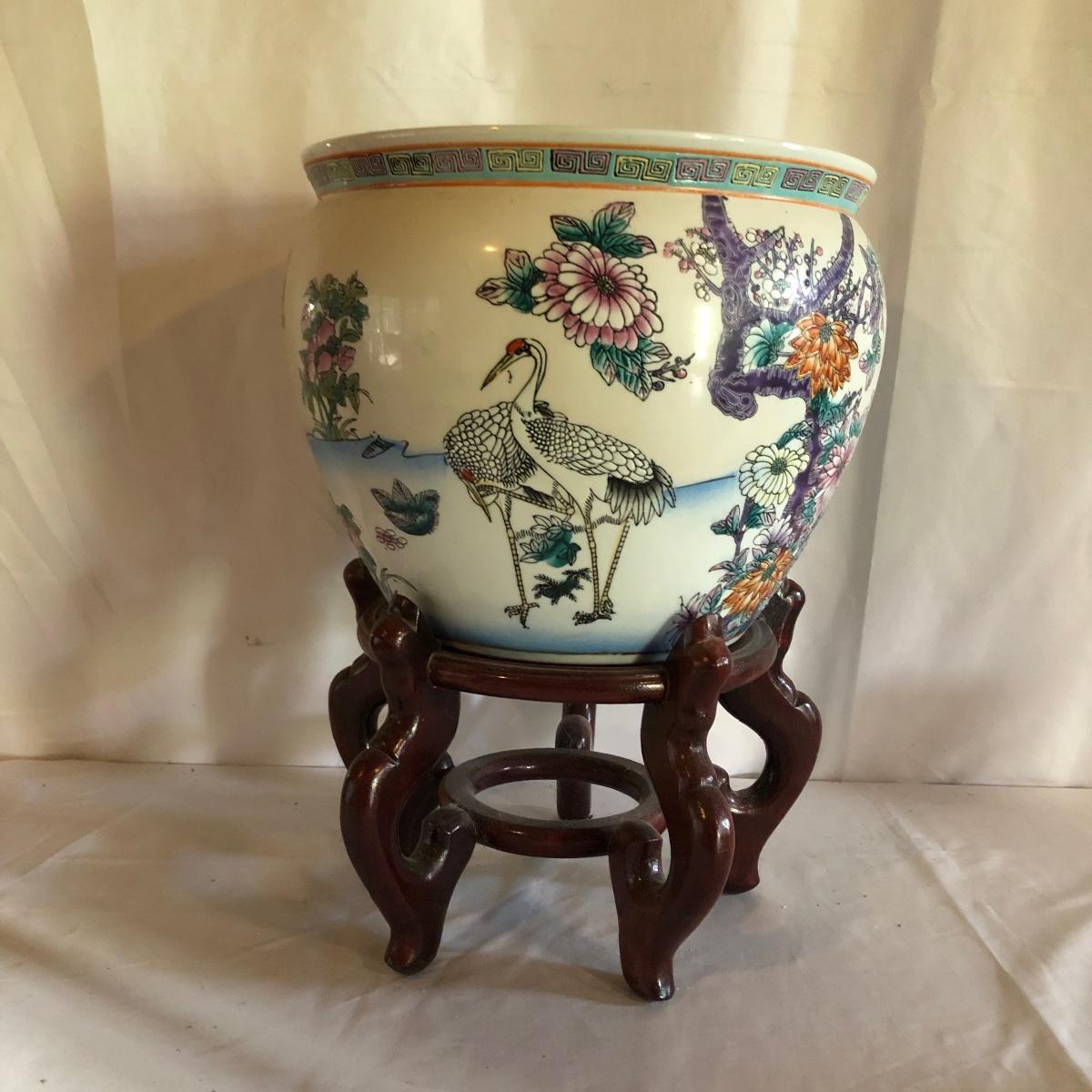 Lot includes a ceramic planter with a wooden stand. Planter and stand measure 12.5”D x 17” tall.