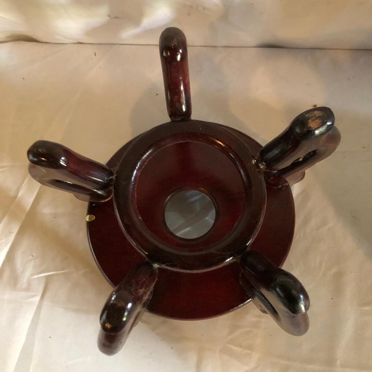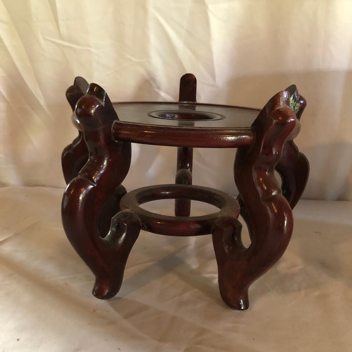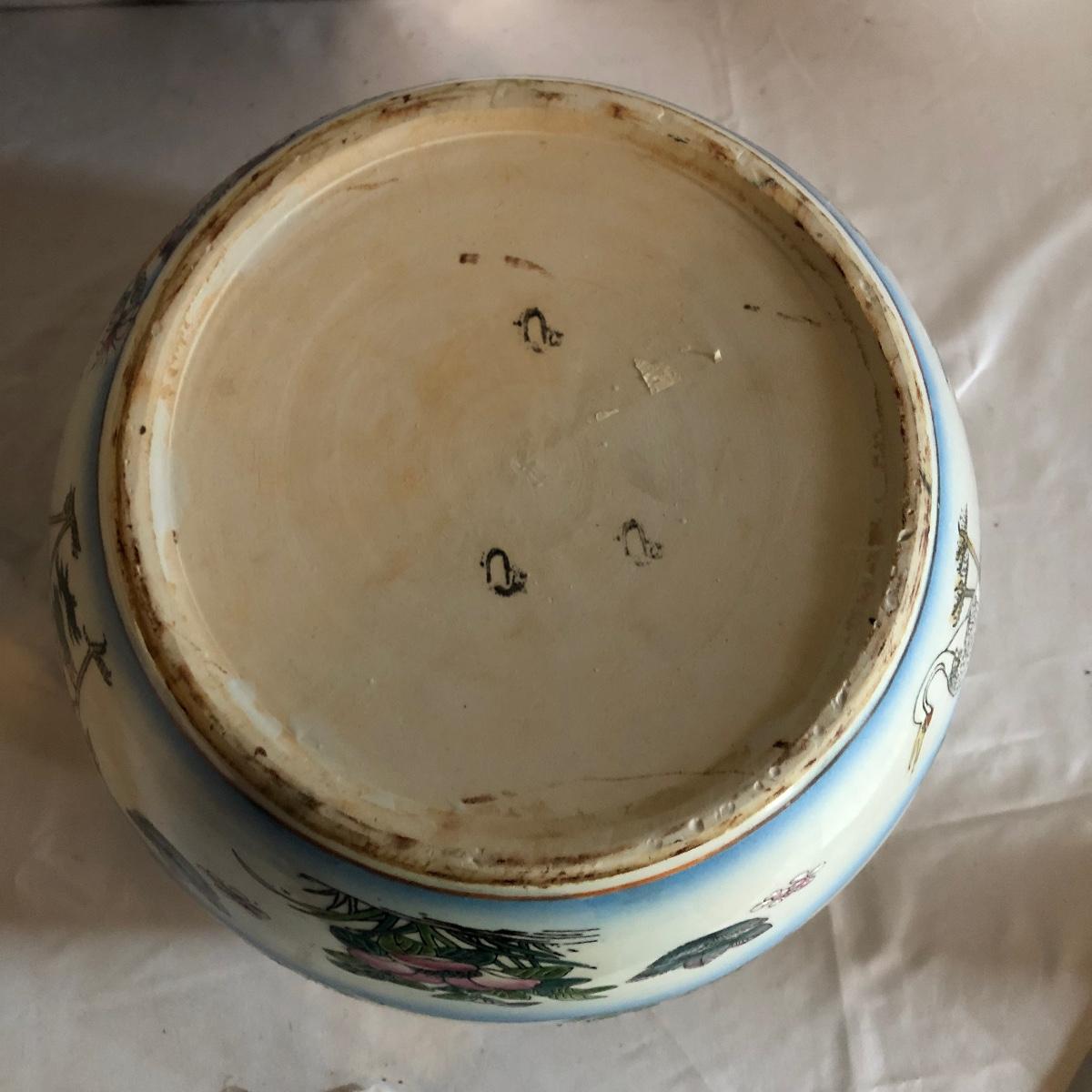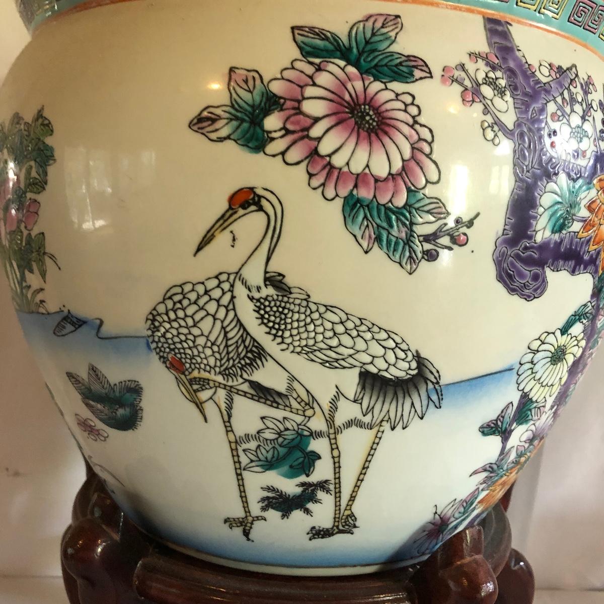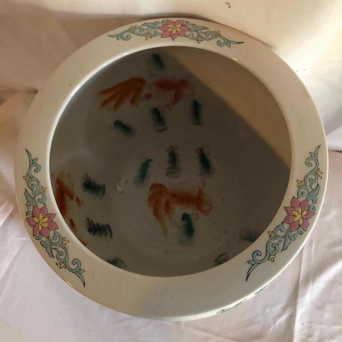 Lot includes a ceramic planter with a wooden stand. Planter and stand measure 12.5”D x 17” tall.