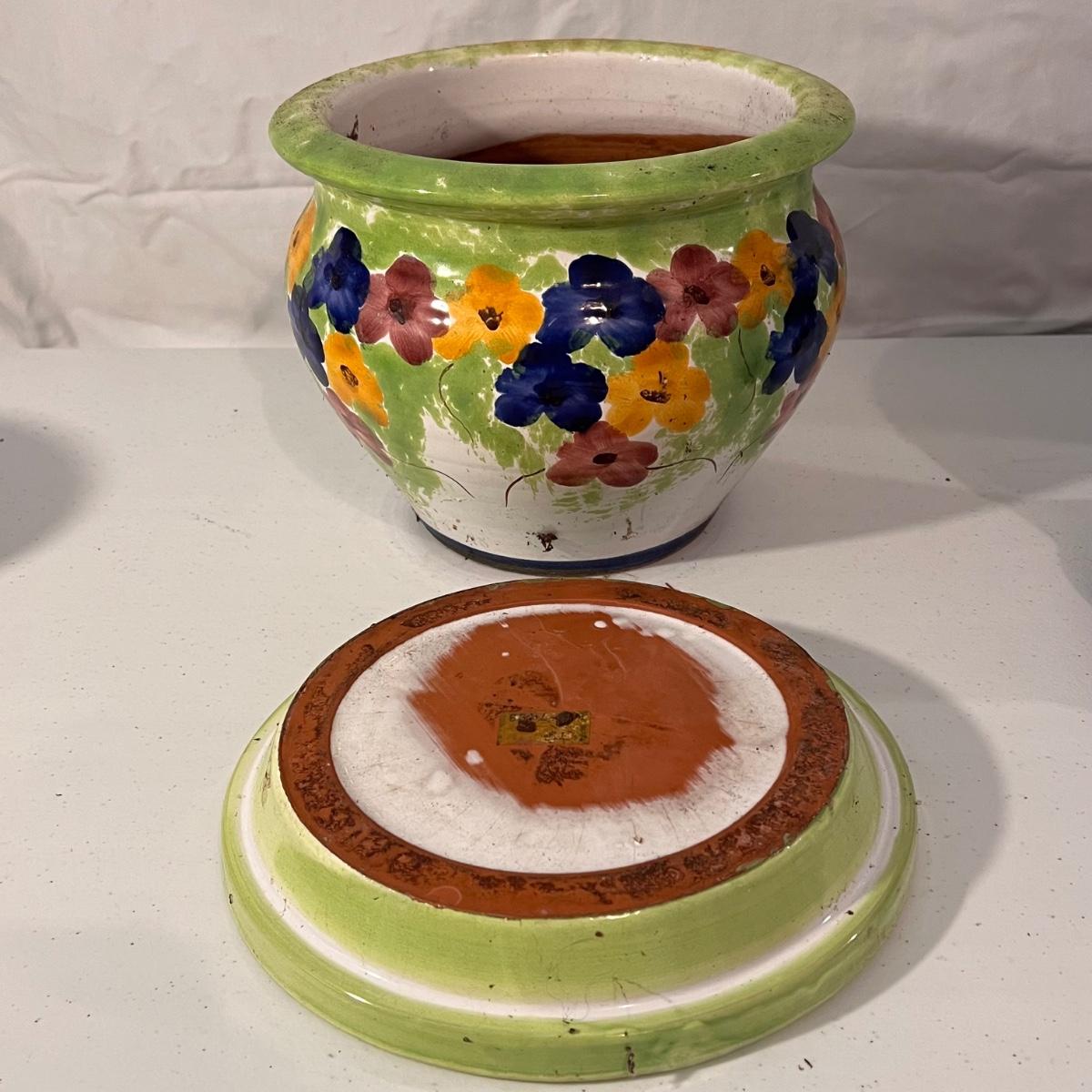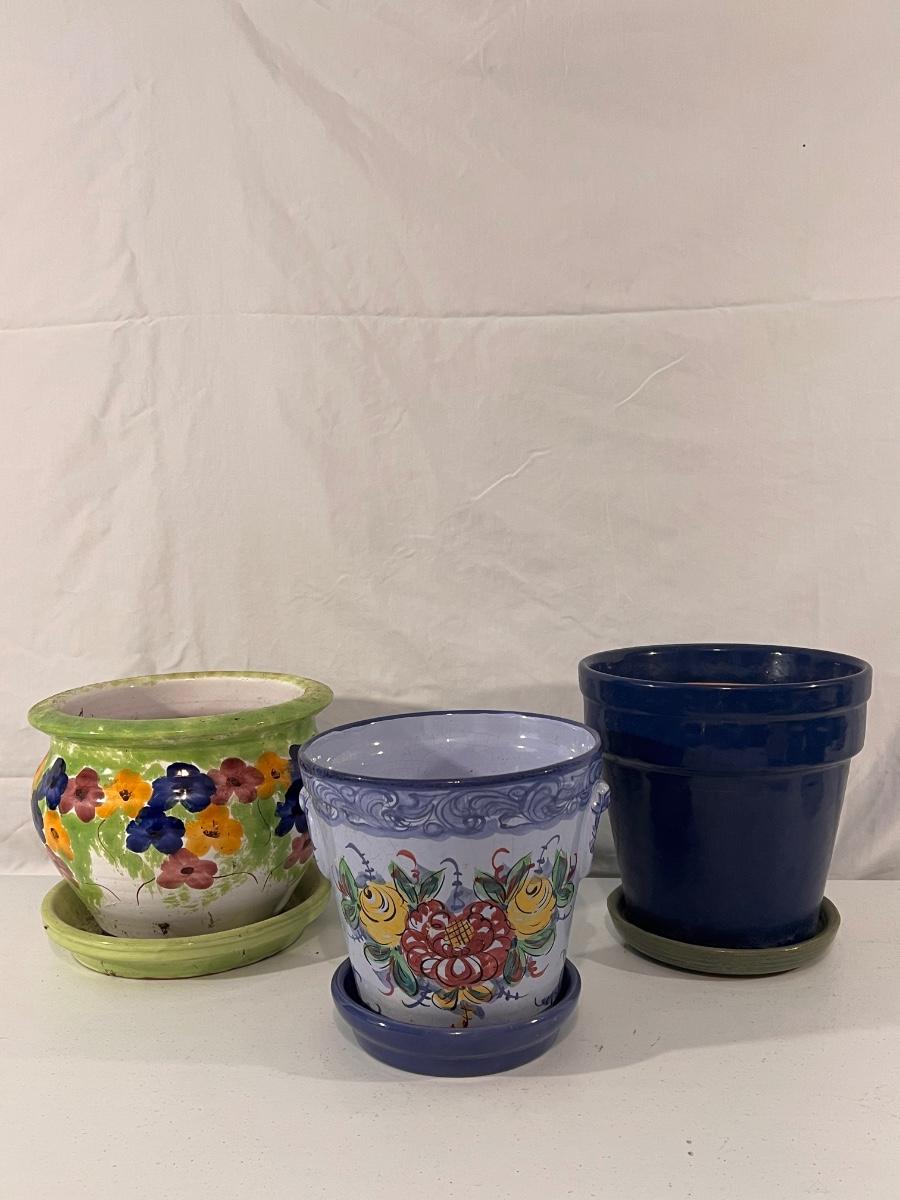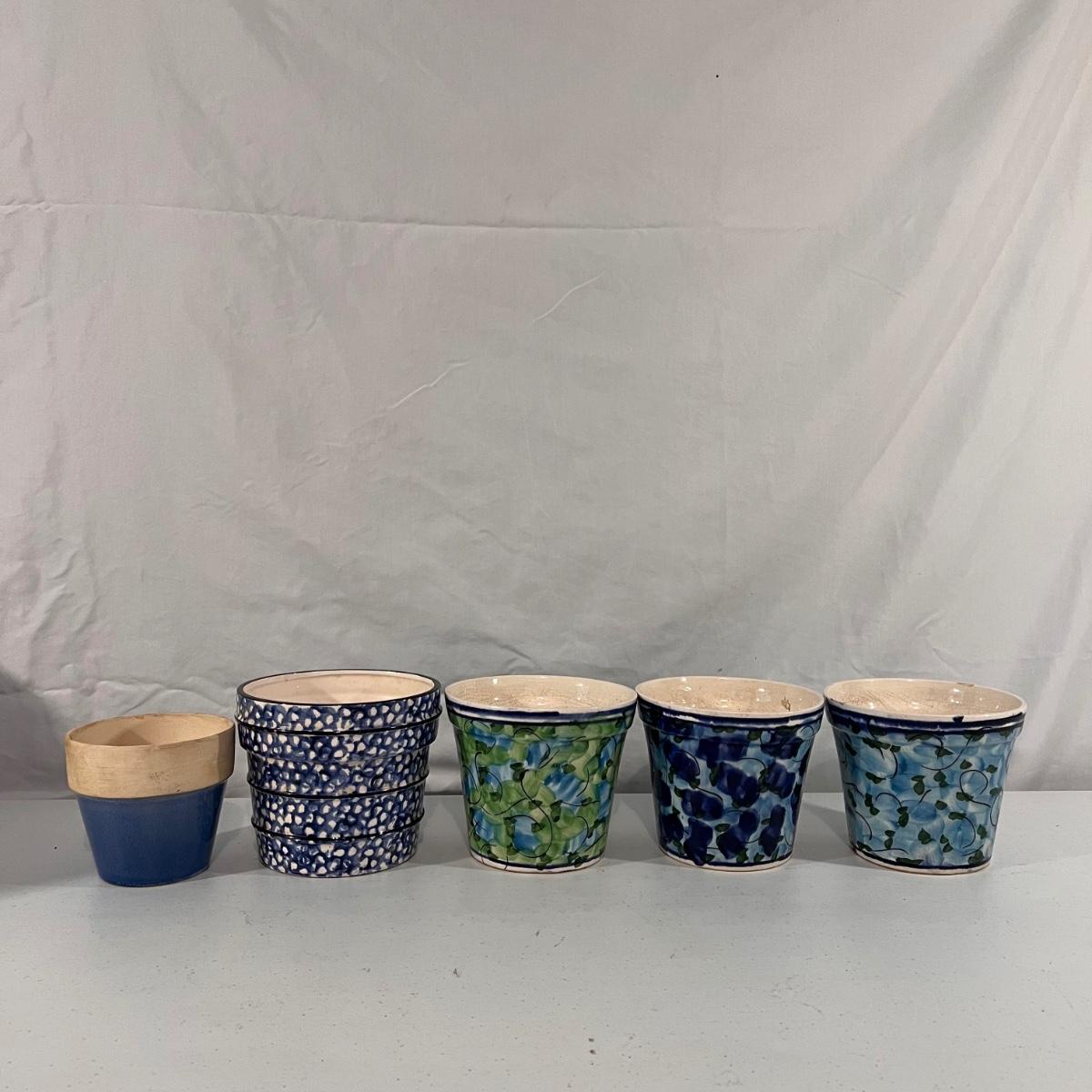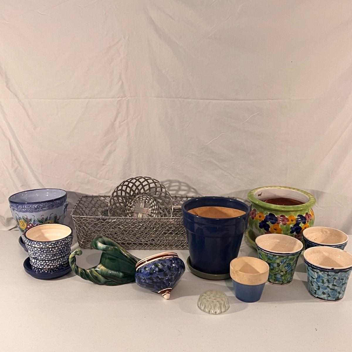 This lot includes 10 ceramic pots of various sizes, one glass flower frog, four ceramic planter bases, and three wire baskets. The largest rectangular plant basket measures 24” x 8” x 5”H. The largest pot is the green floral one that measures 9.5” x 8”H. The smallest pot is the ceramic blue with white top that measures 4.5” x 4”H. Local pickup only.