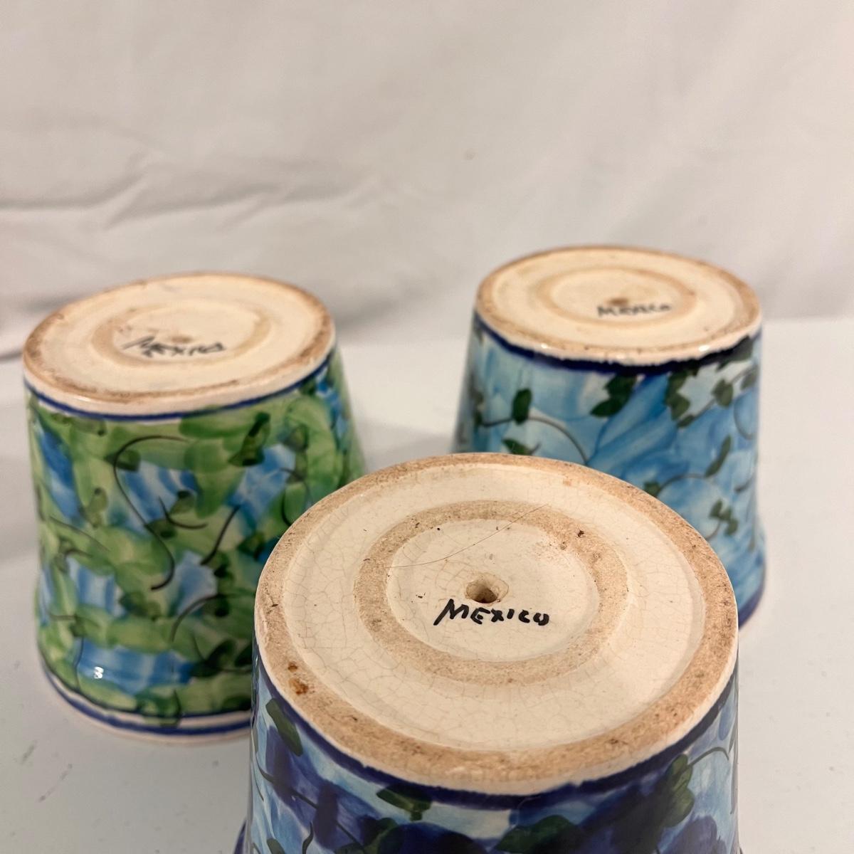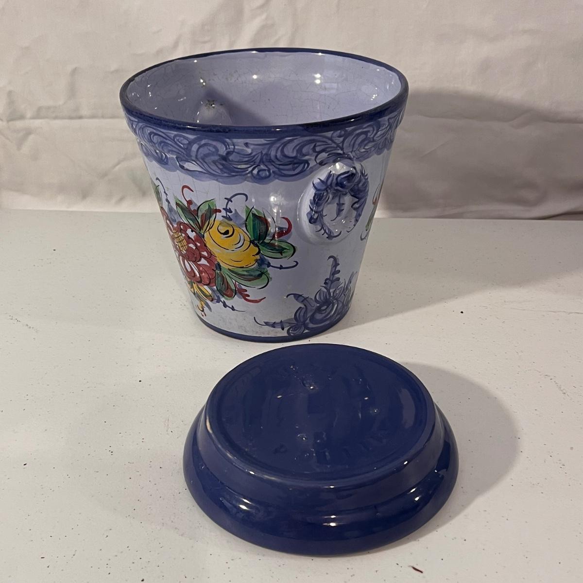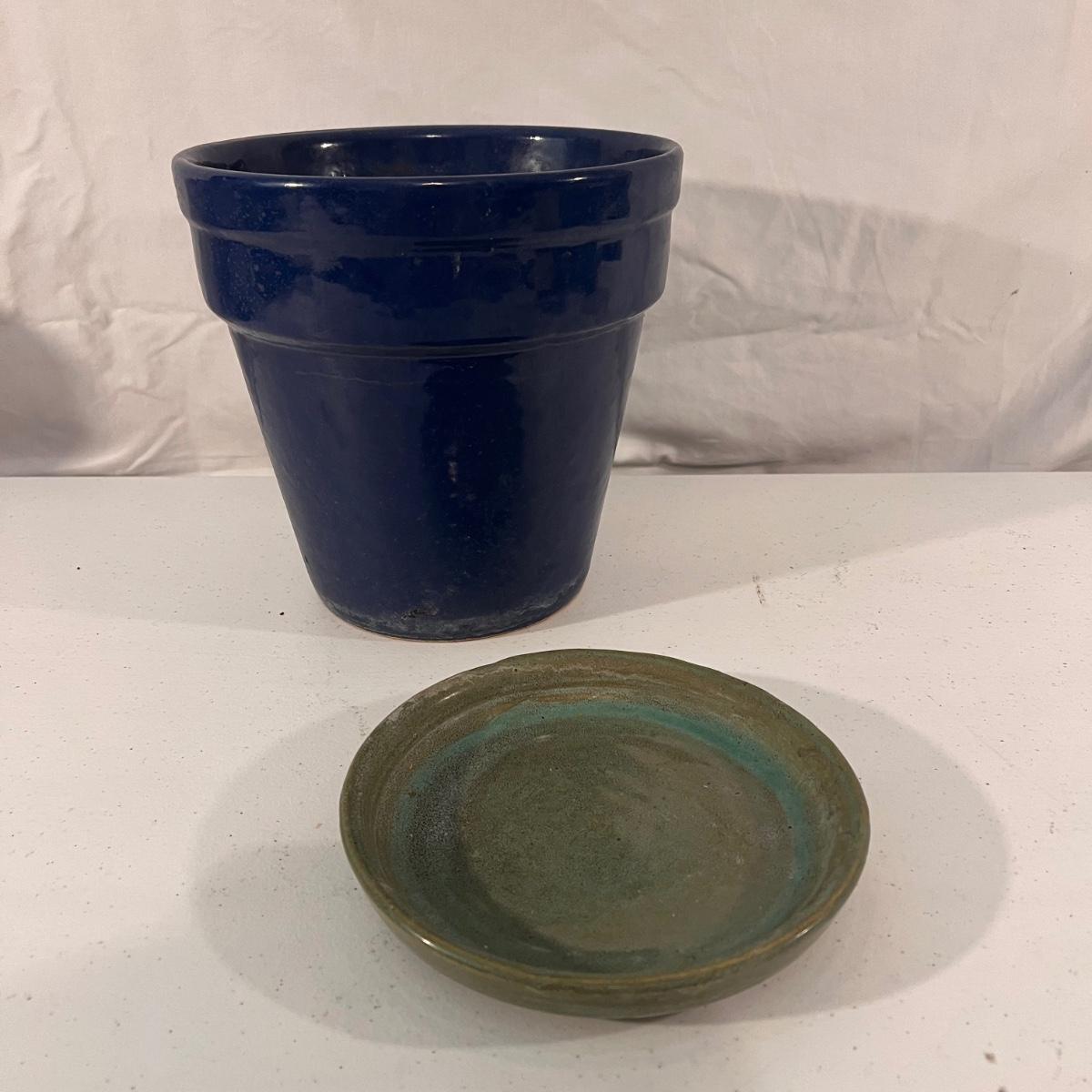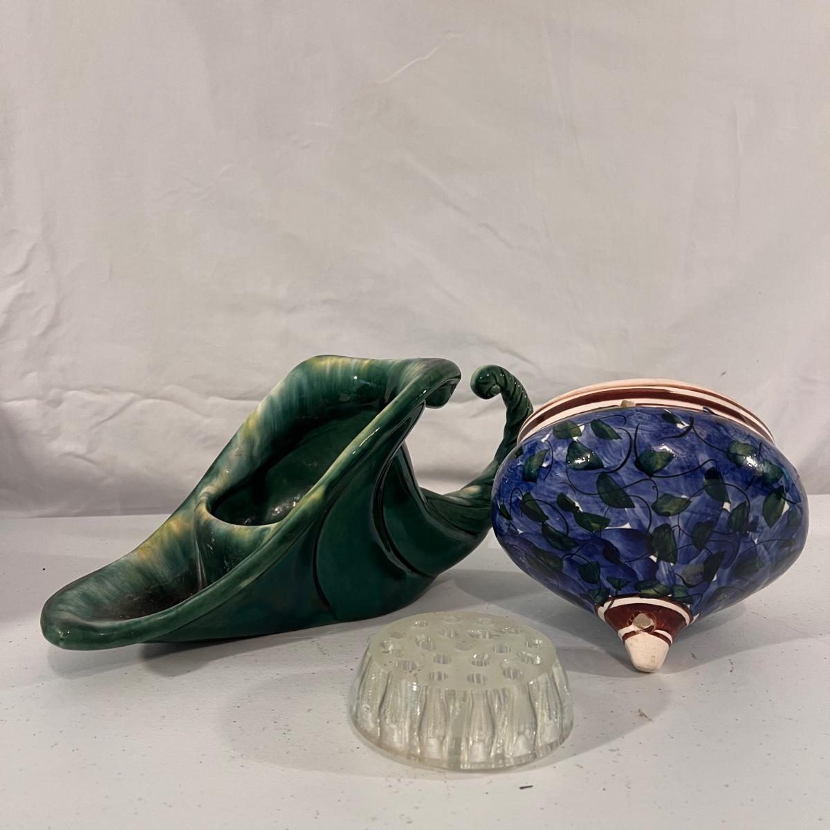 This lot includes 10 ceramic pots of various sizes, one glass flower frog, four ceramic planter bases, and three wire baskets. The largest rectangular plant basket measures 24” x 8” x 5”H. The largest pot is the green floral one that measures 9.5” x 8”H. The smallest pot is the ceramic blue with white top that measures 4.5” x 4”H. Local pickup only.