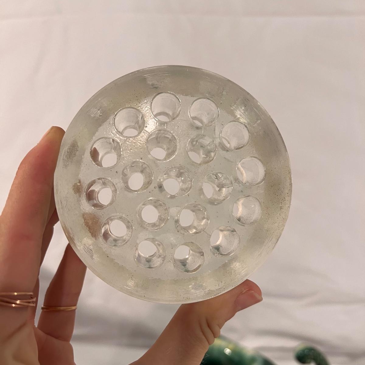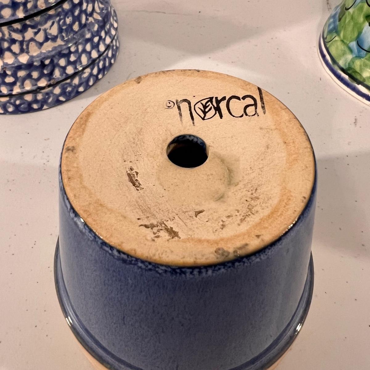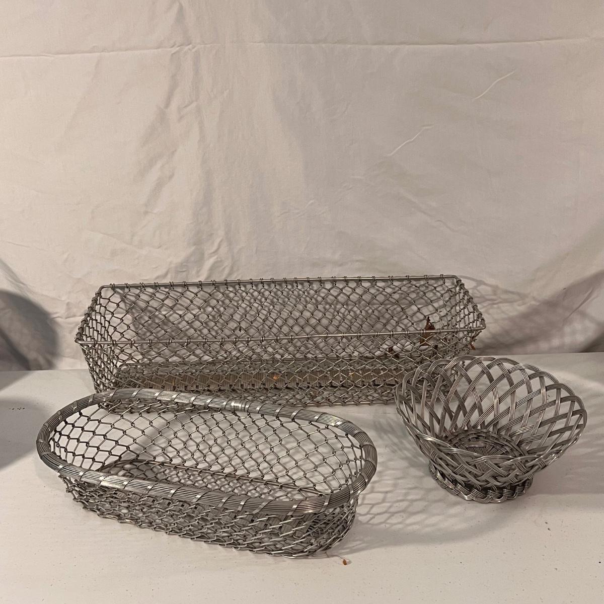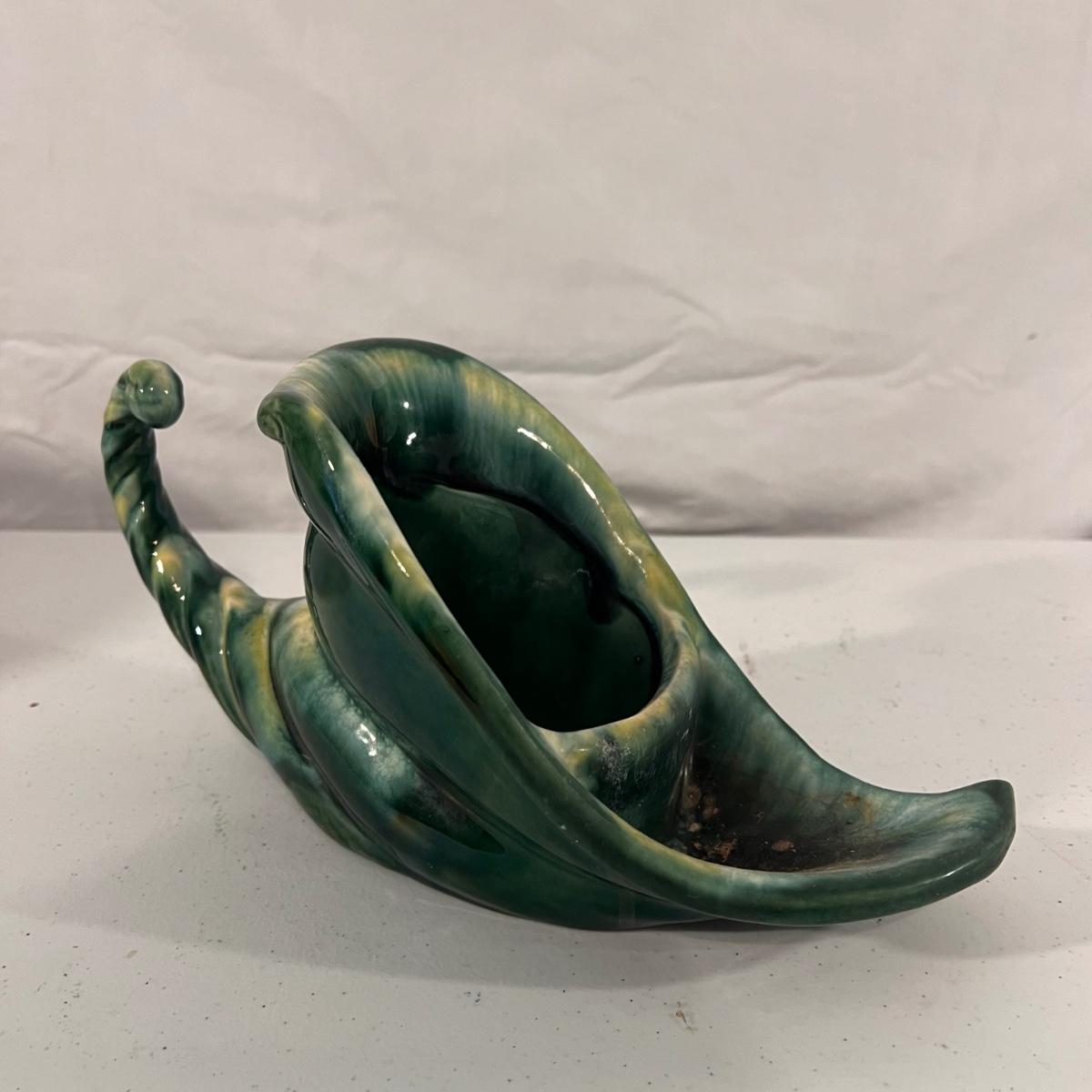 This lot includes 10 ceramic pots of various sizes, one glass flower frog, four ceramic planter bases, and three wire baskets. The largest rectangular plant basket measures 24” x 8” x 5”H. The largest pot is the green floral one that measures 9.5” x 8”H. The smallest pot is the ceramic blue with white top that measures 4.5” x 4”H. Local pickup only.