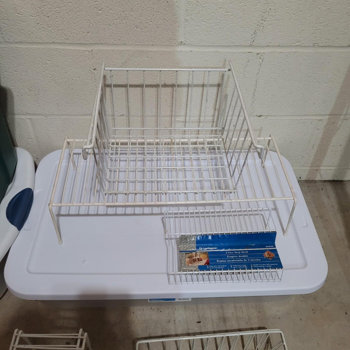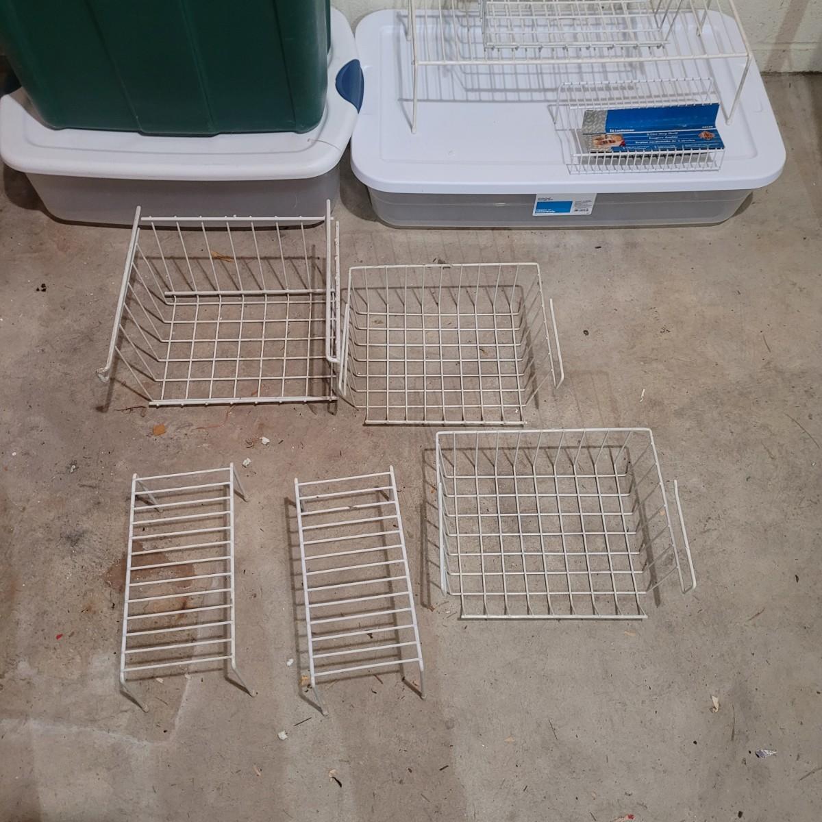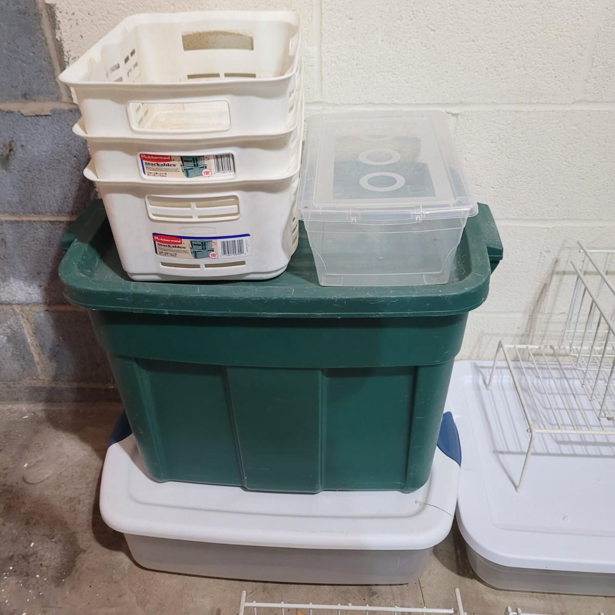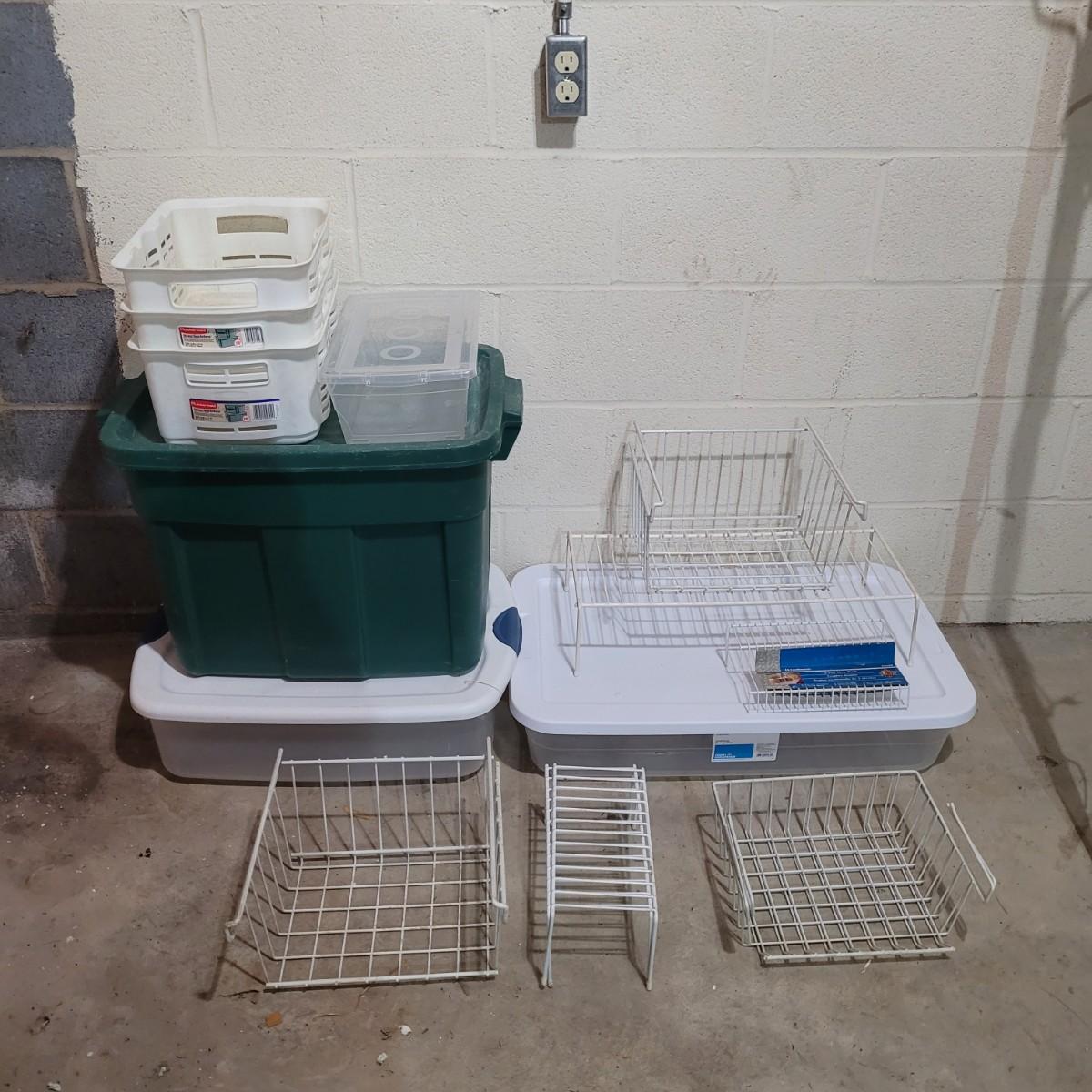 This lot includes two flat plastic storage bins, a large Rubbermaid bin, small stackable bins, and a variety of wire hanging bins and shelves. Some wire bins need a good cleaning. Green bin measures approximately 21.5” x 13” x 17”H. Local pick up only.