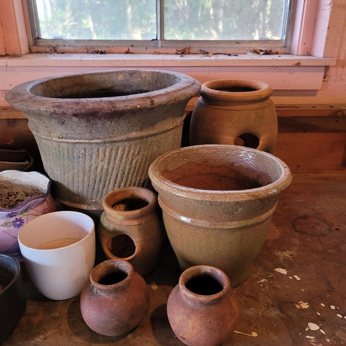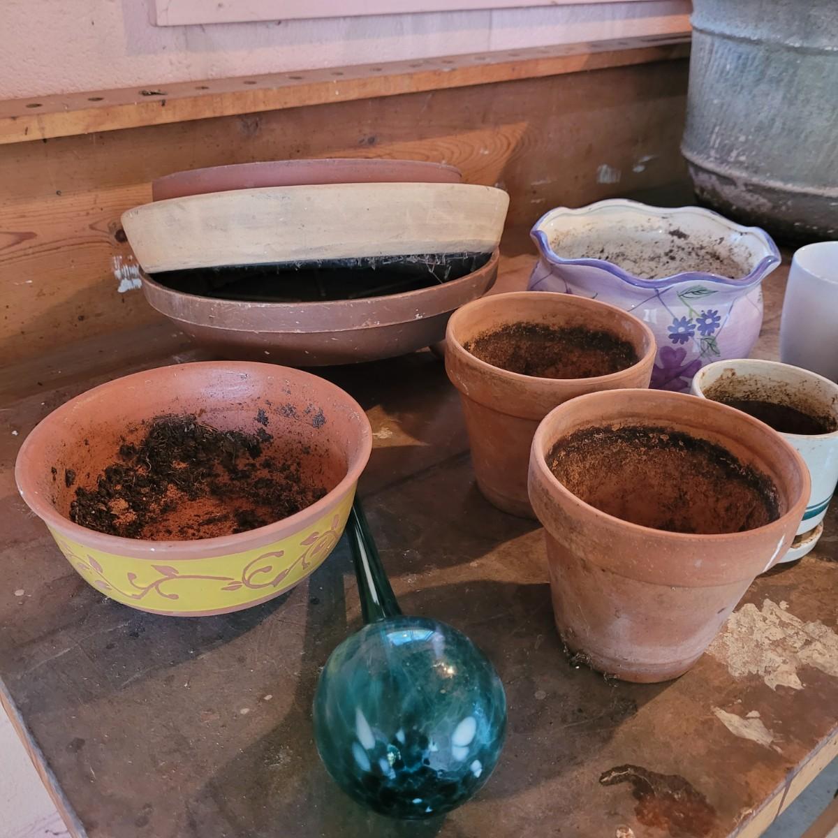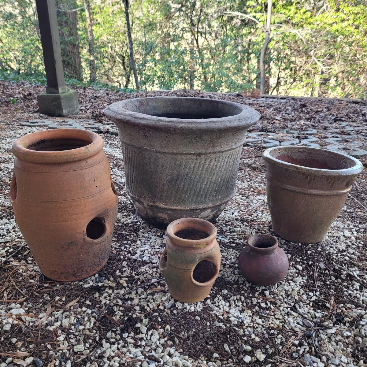 A large variety of ceramic and terra cotta planters, including trays and a water bulb. Largest pot measures approximately 17”DIA x 13”H. Local pick up only.
