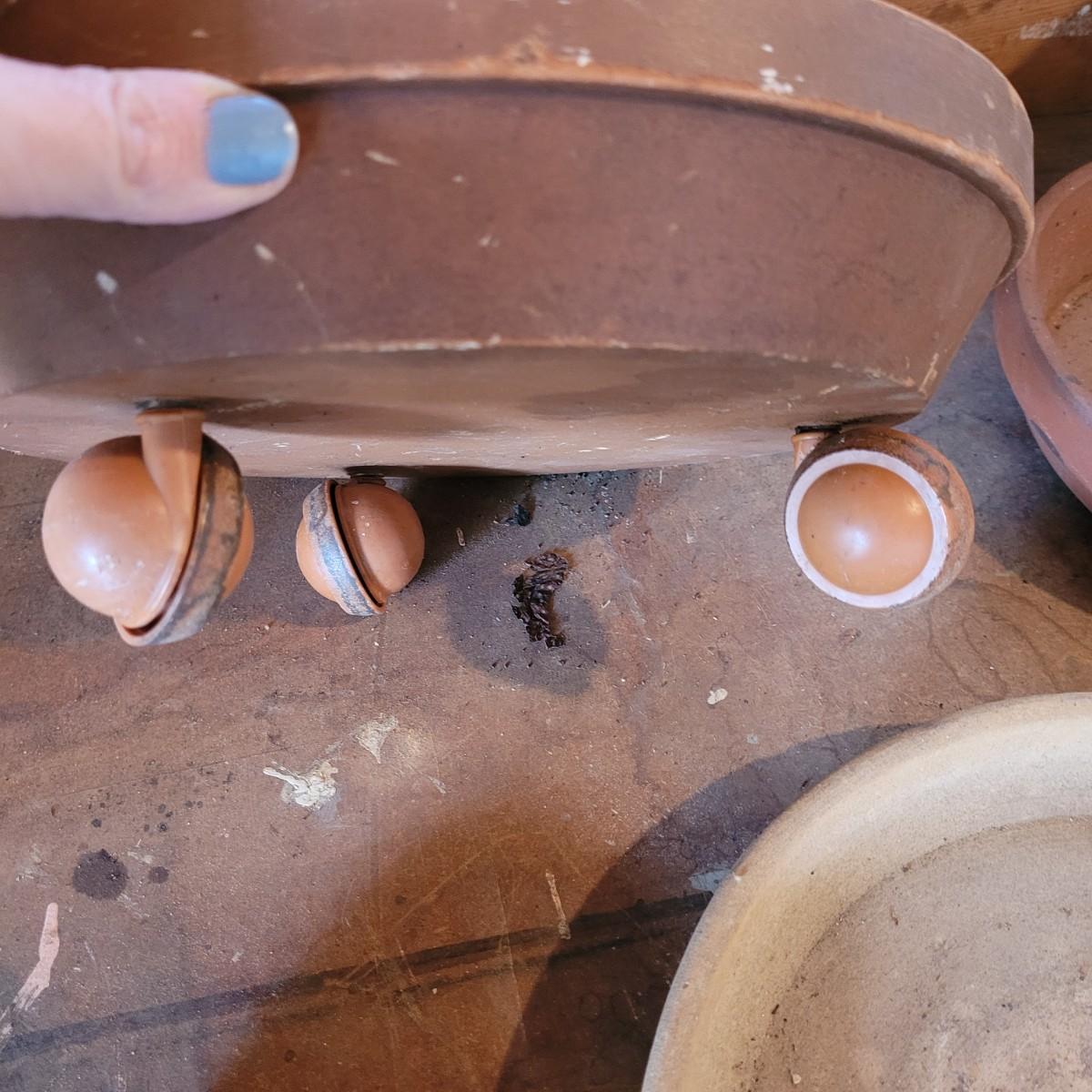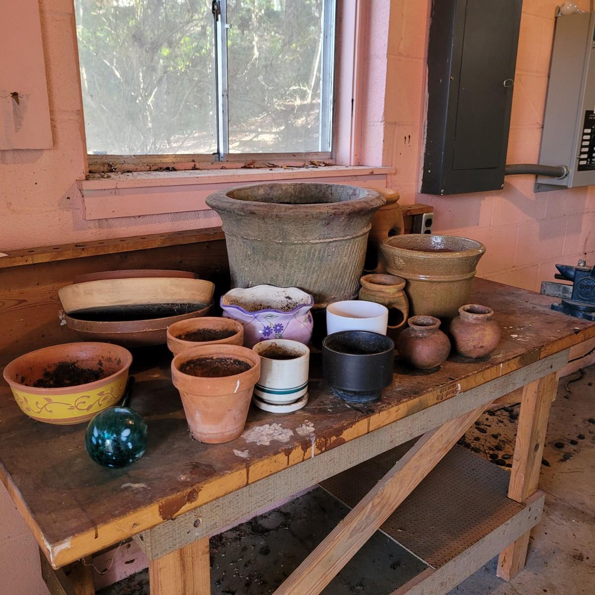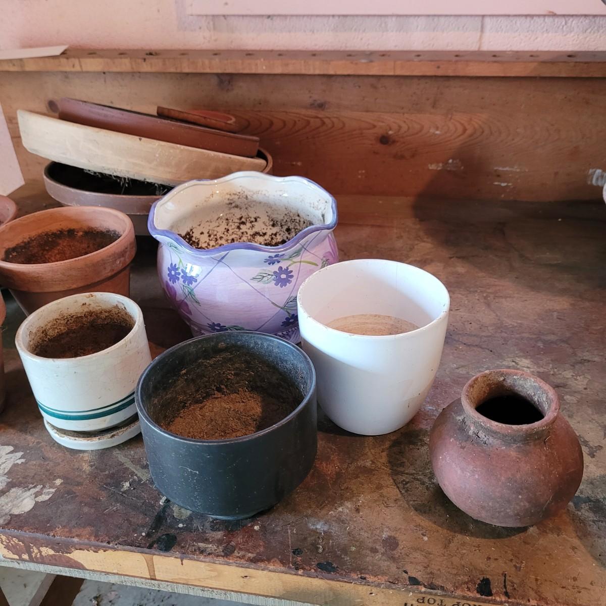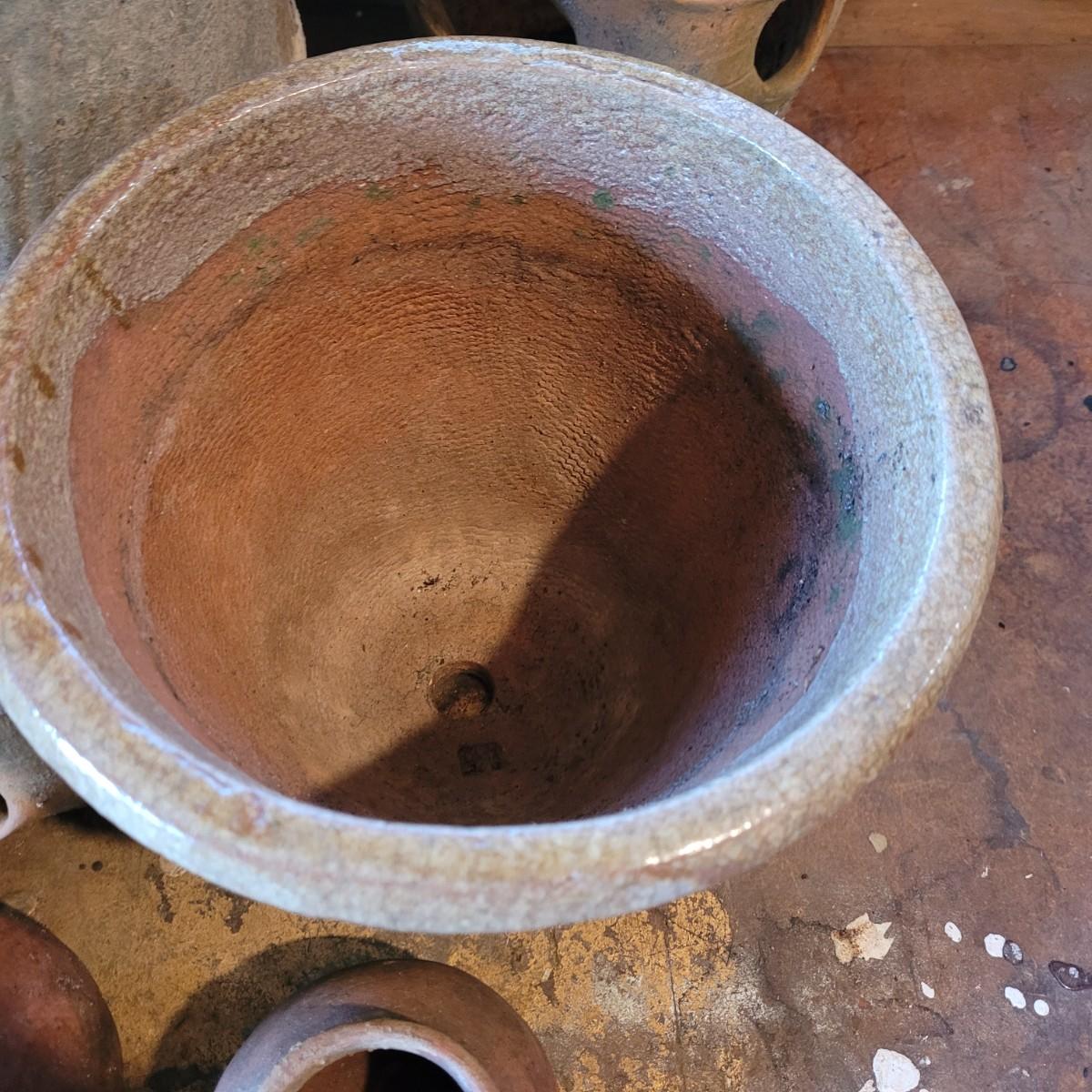 A large variety of ceramic and terra cotta planters, including trays and a water bulb. Largest pot measures approximately 17”DIA x 13”H. Local pick up only.