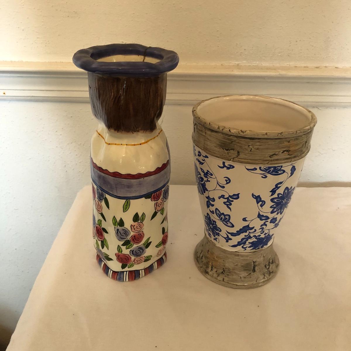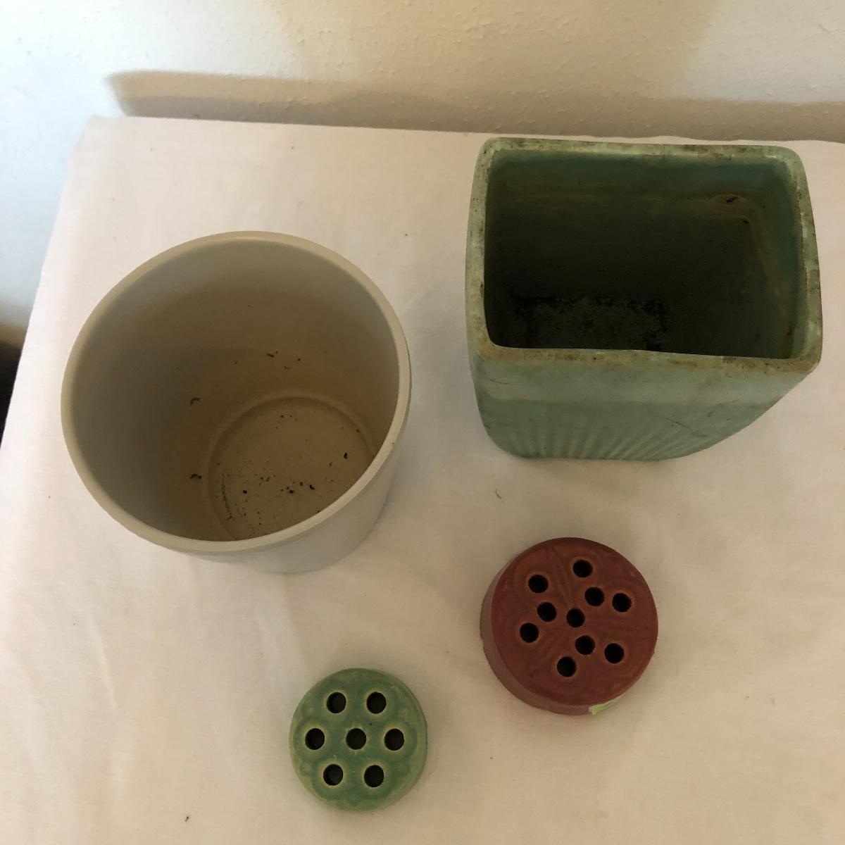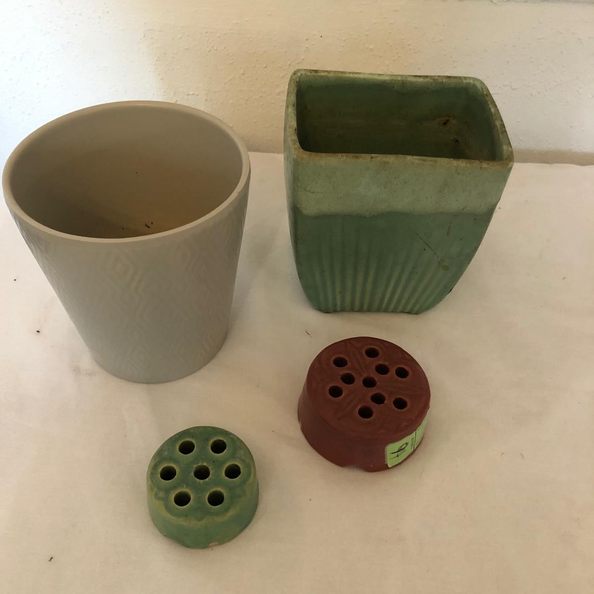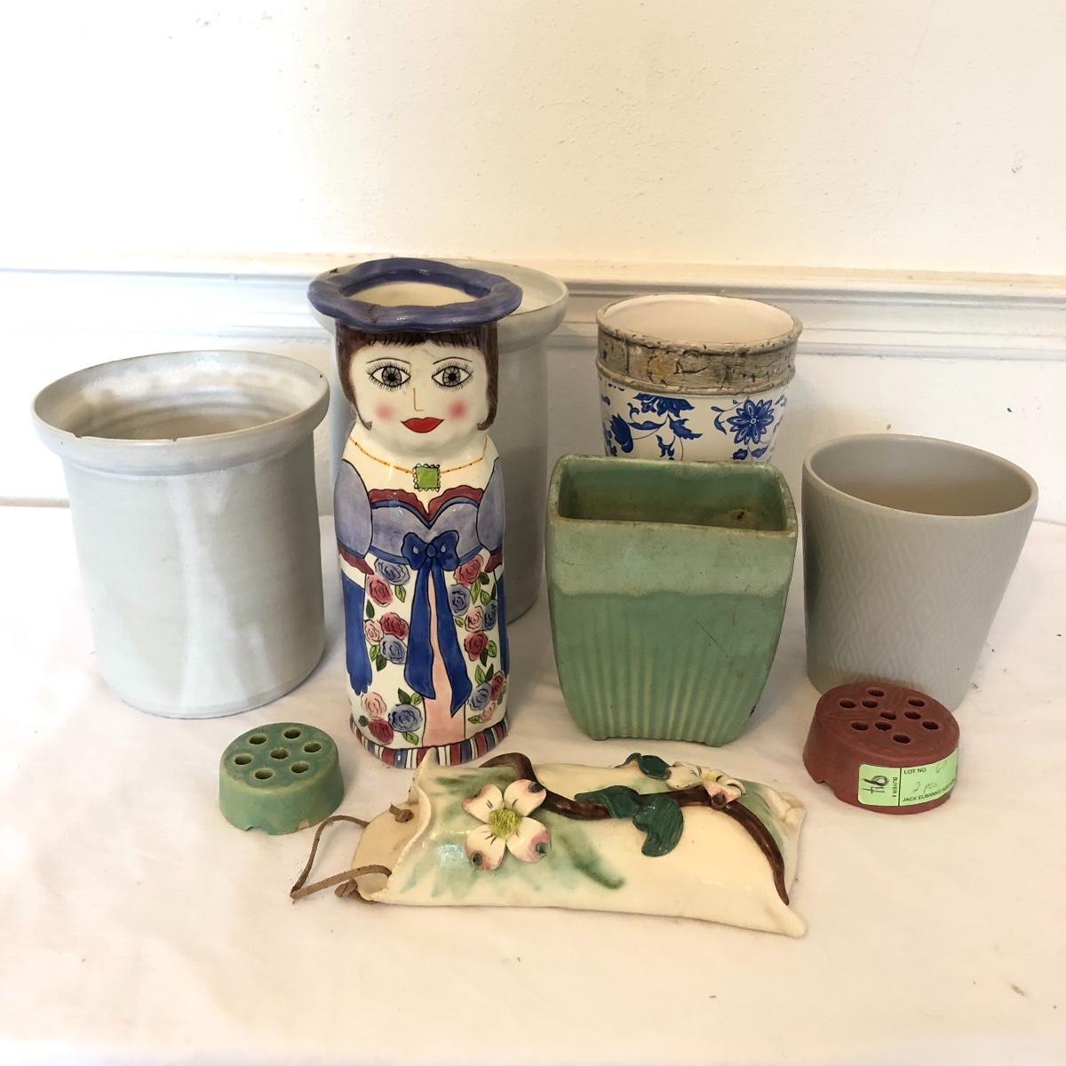 Six ceramic planters plus a hanging ceramic flower holder and two ceramic stem holders make up this lot. Tallest pot measures 6.5” x 9”.