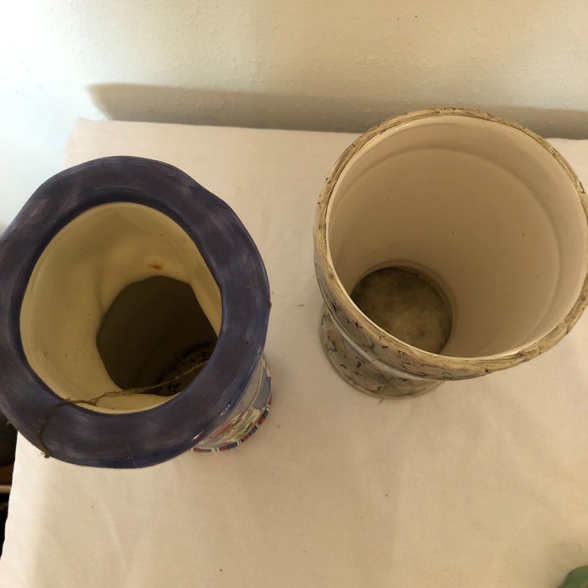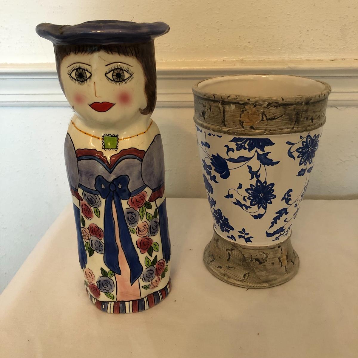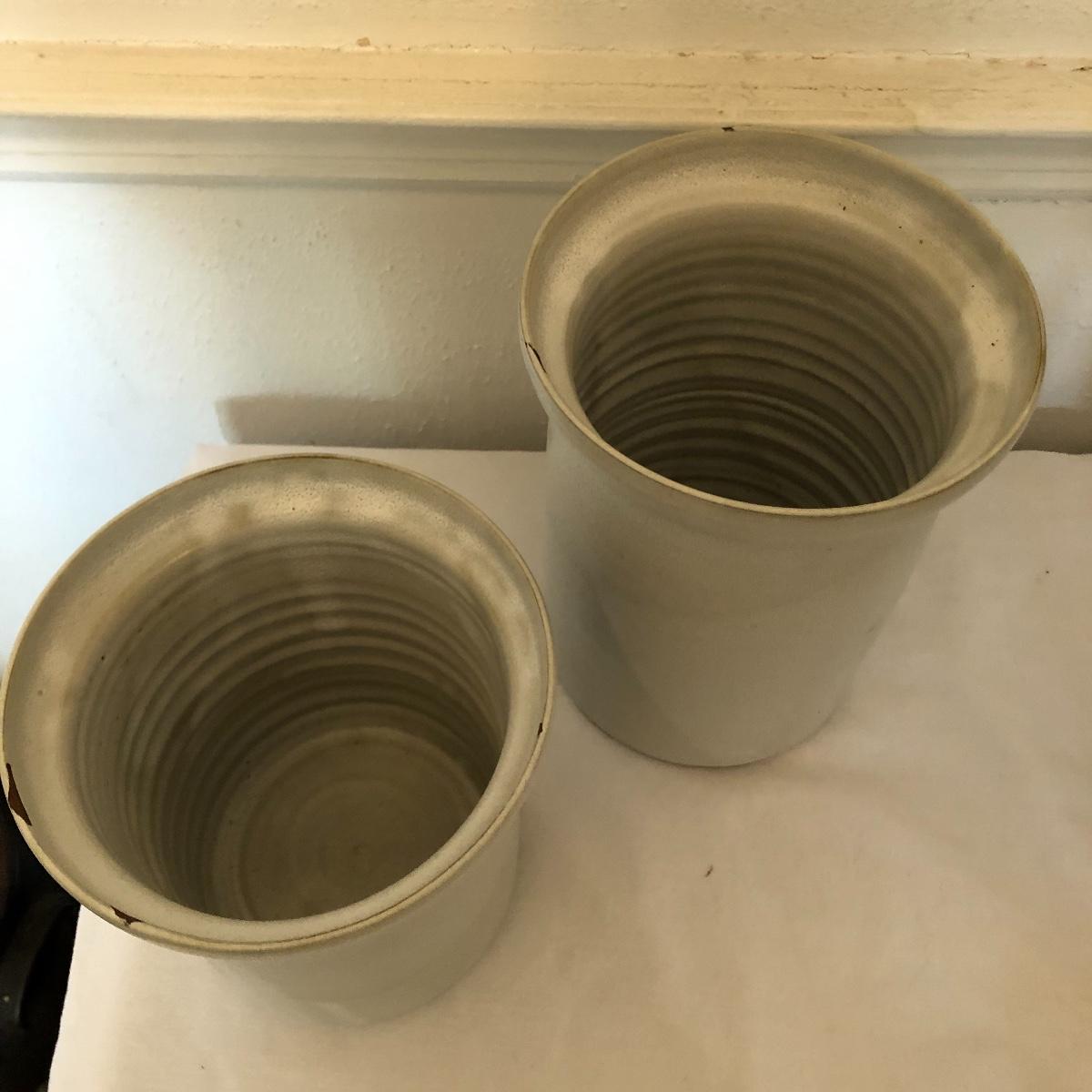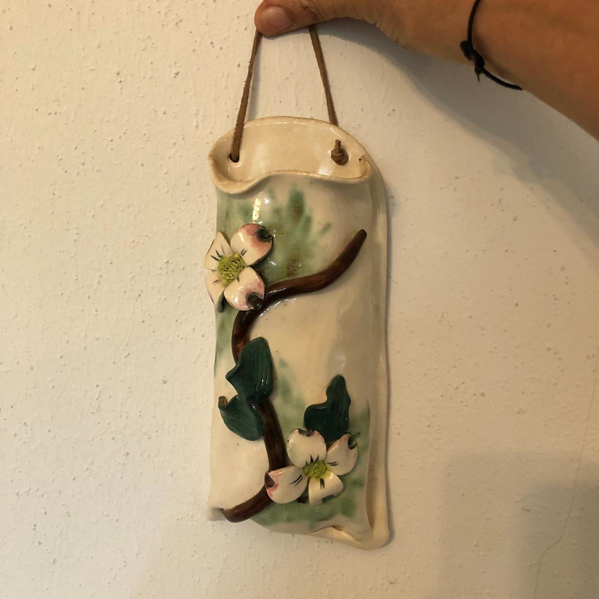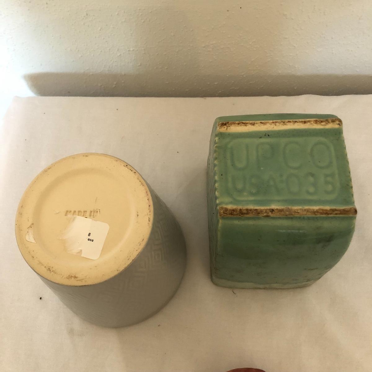 Six ceramic planters plus a hanging ceramic flower holder and two ceramic stem holders make up this lot. Tallest pot measures 6.5” x 9”.