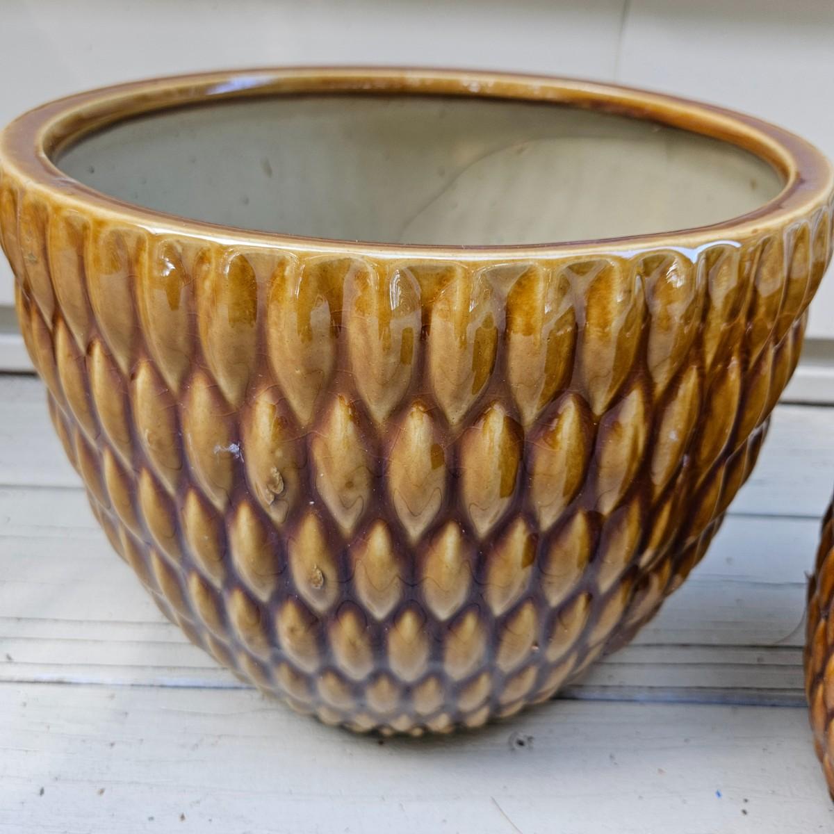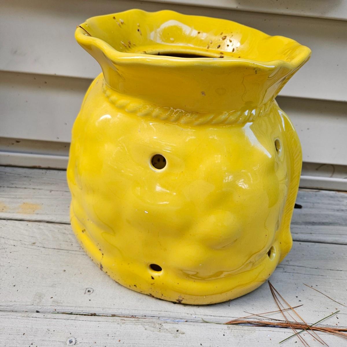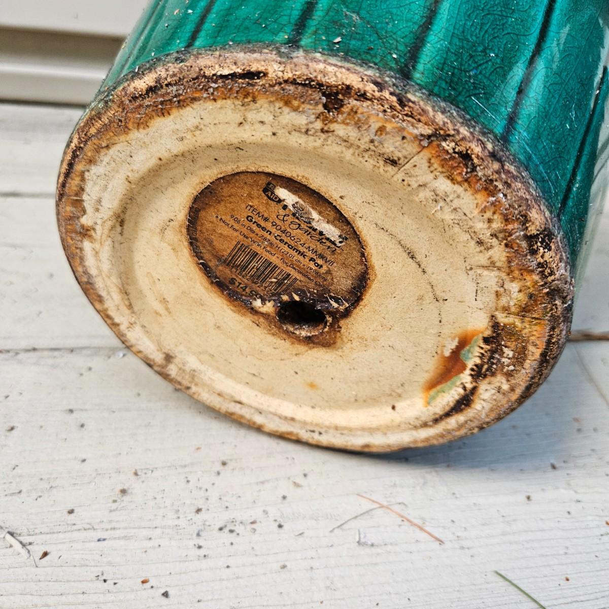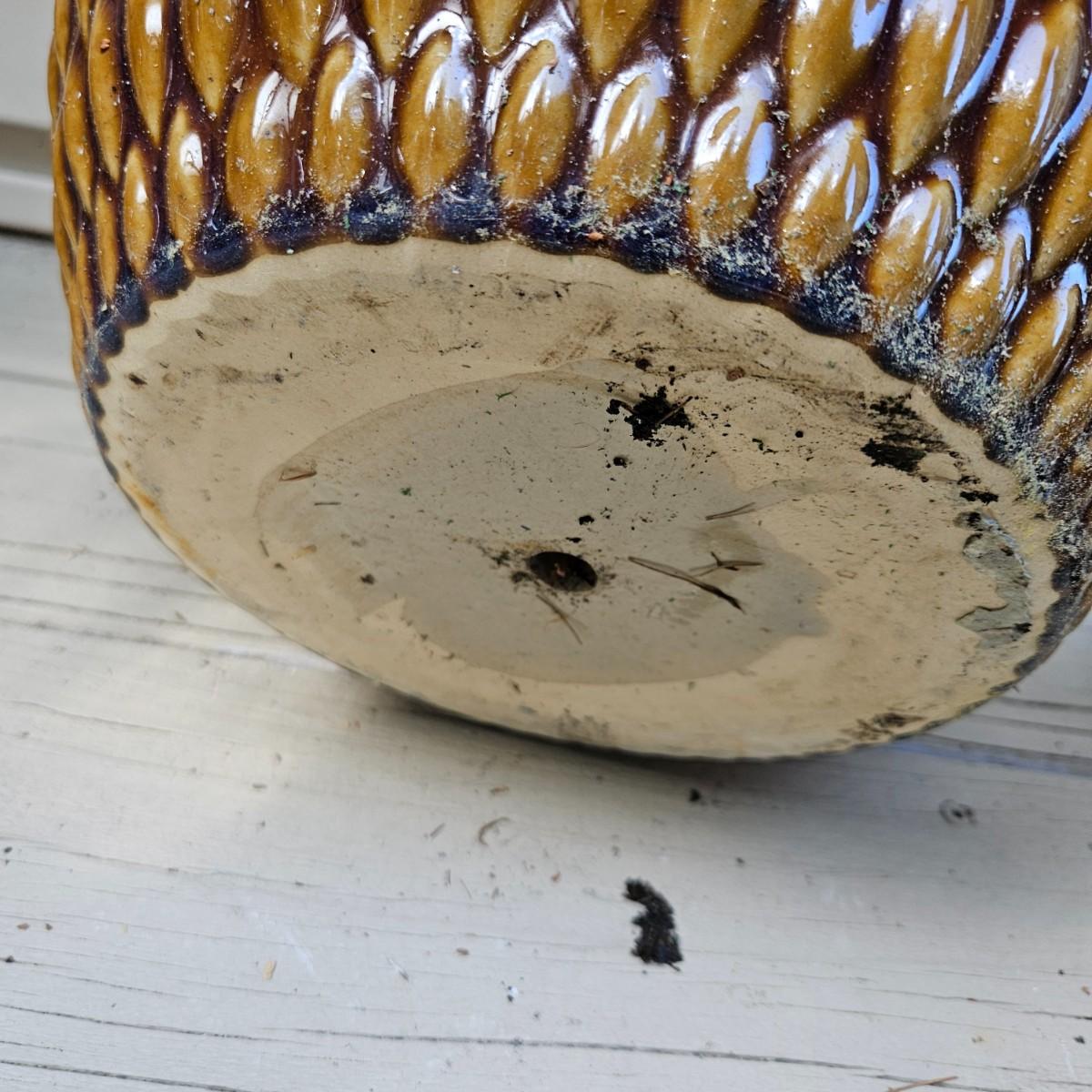 An assortment of five ceramic planters with the largest green one measuring approximately 11.5"D x 10"H. Both the largest green and tan colored planters have minor cracks in the interiors that do not go to the outside. Also included is a ceramic potato storage pot and a 14 qt unopened bag of potting soil. Local pickup only