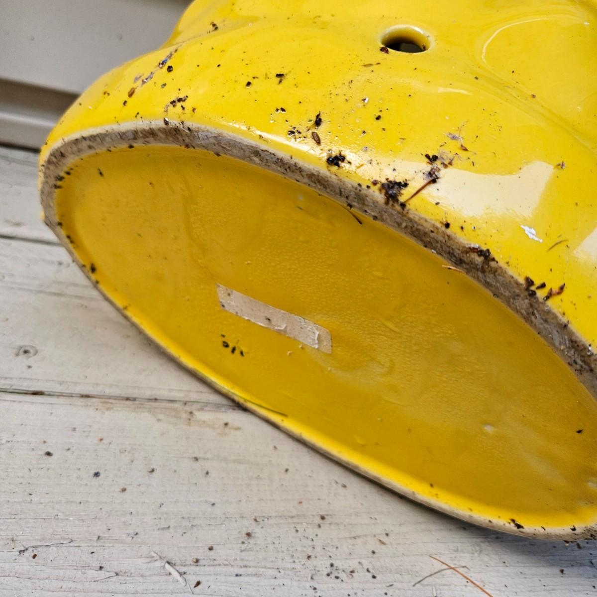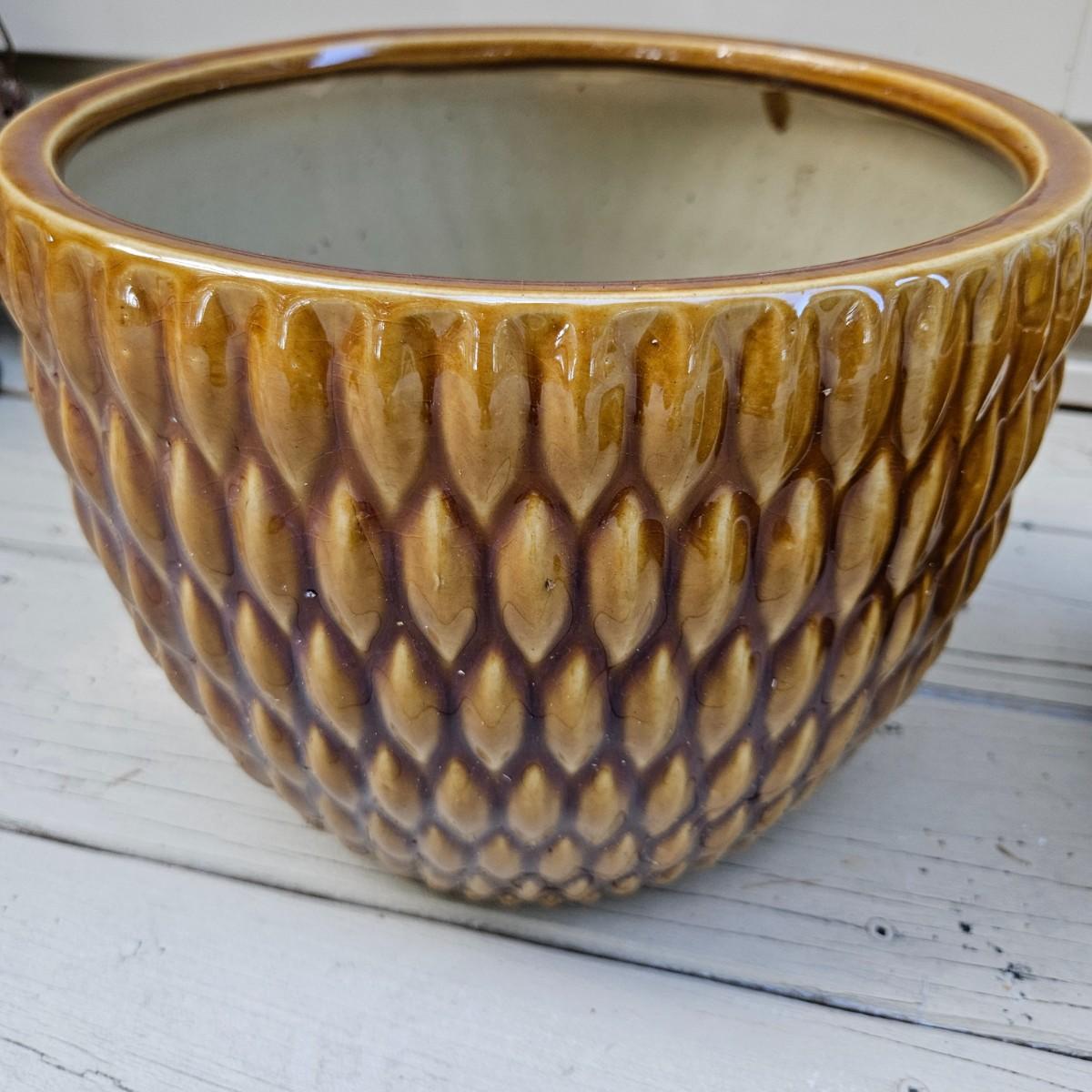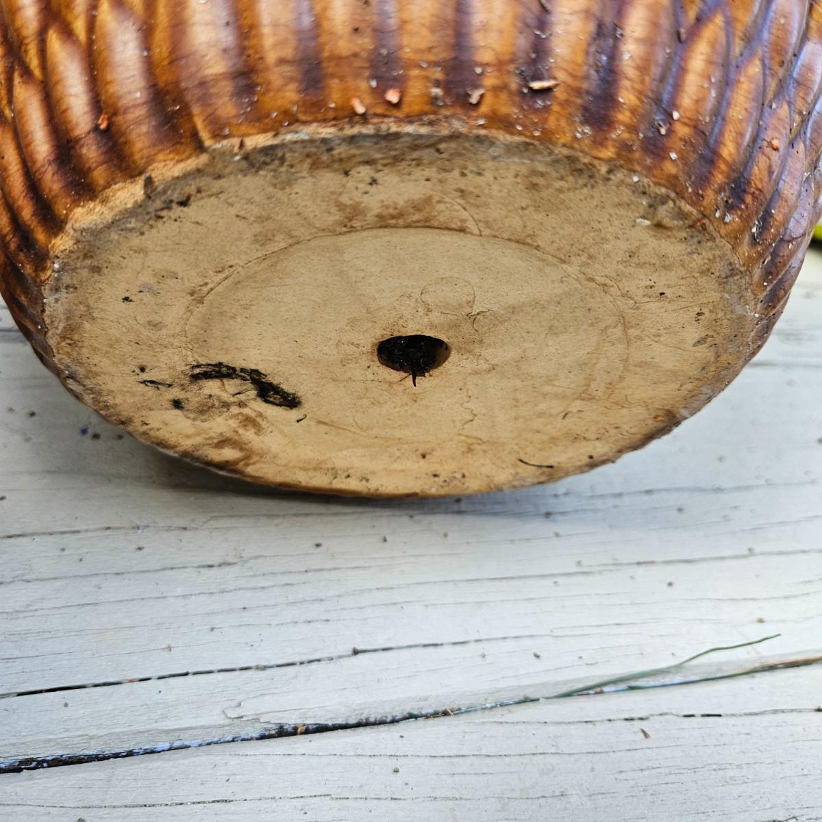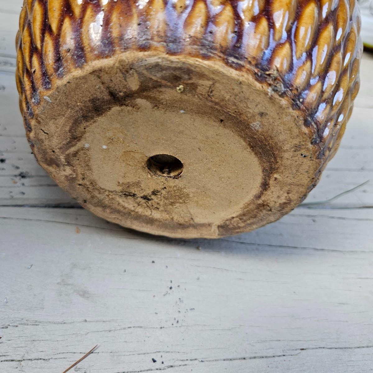 An assortment of five ceramic planters with the largest green one measuring approximately 11.5"D x 10"H. Both the largest green and tan colored planters have minor cracks in the interiors that do not go to the outside. Also included is a ceramic potato storage pot and a 14 qt unopened bag of potting soil. Local pickup only