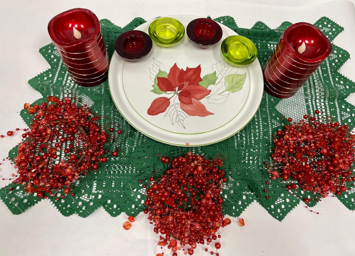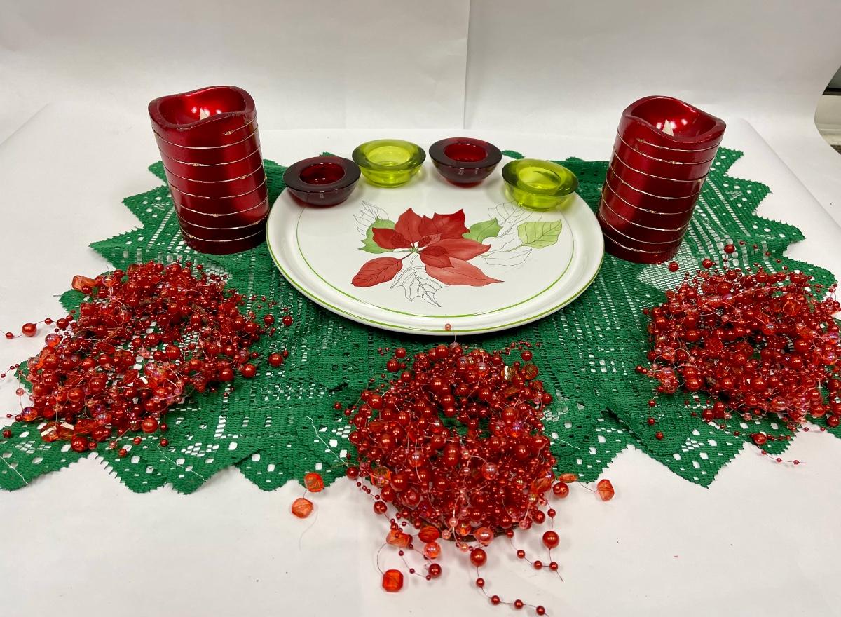 Ceramic Platter and other table decor - beads, electric candles, glass votive holders, 4 lightweight placemats