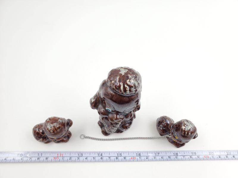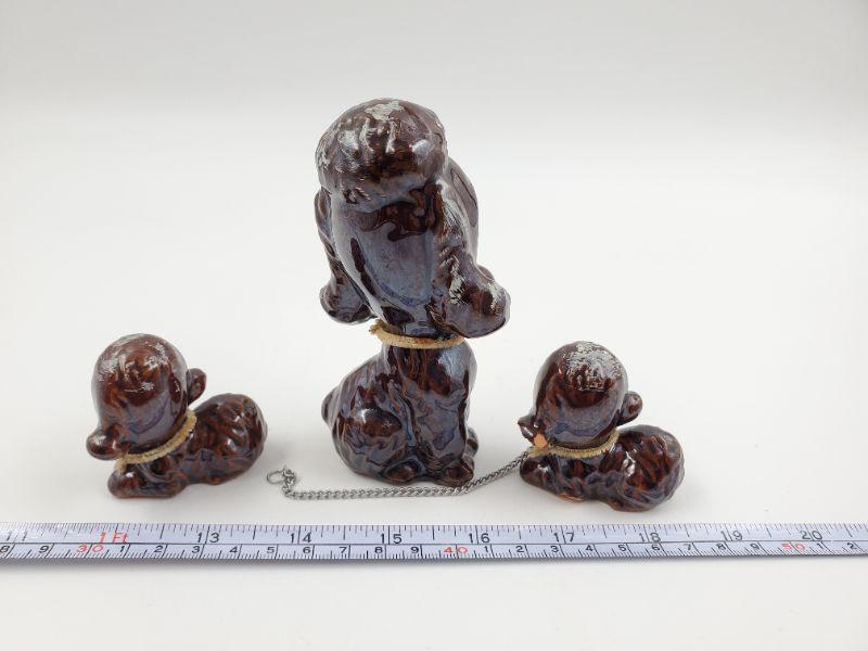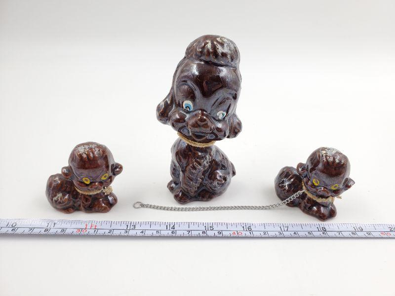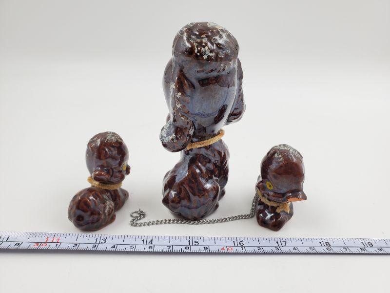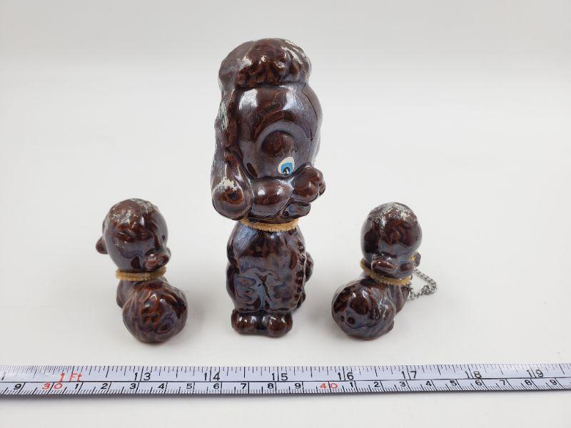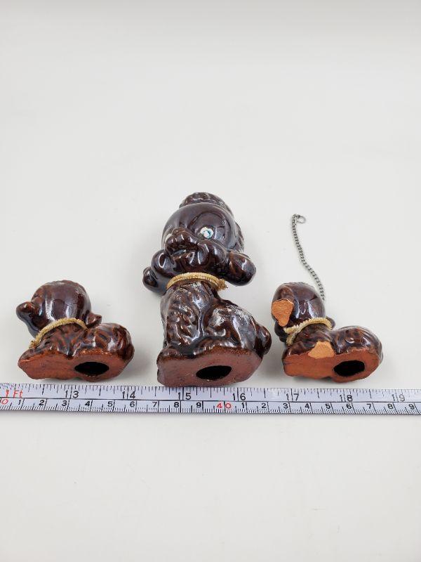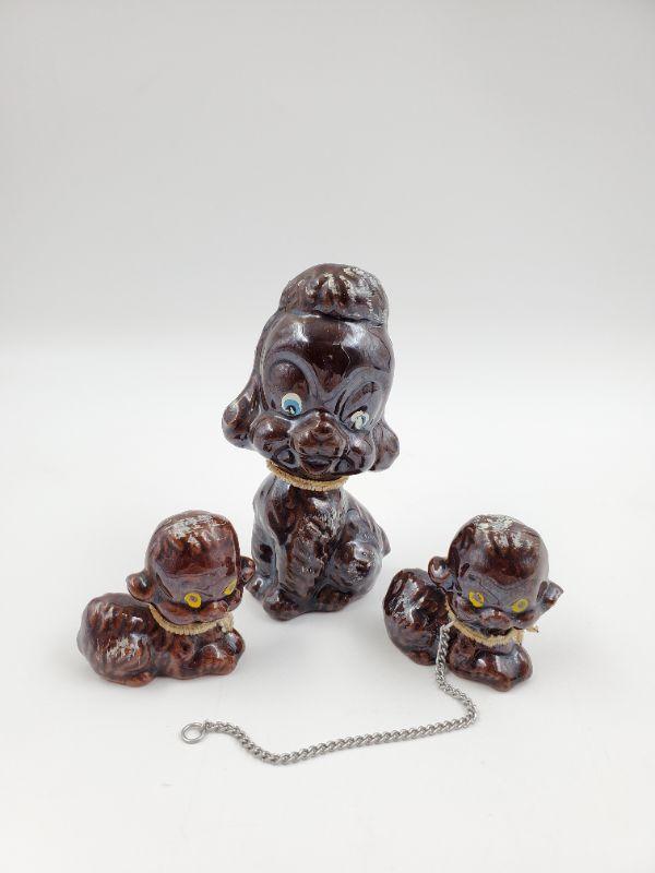 Adorable set of vintage mama poodle and puppies....brown with brown pipe cleaner collars....silver tone metal chain included. One of the puppies has a bit of damage but still an adorable set!