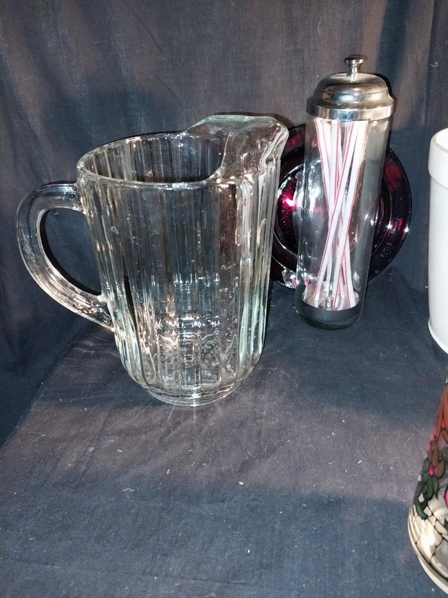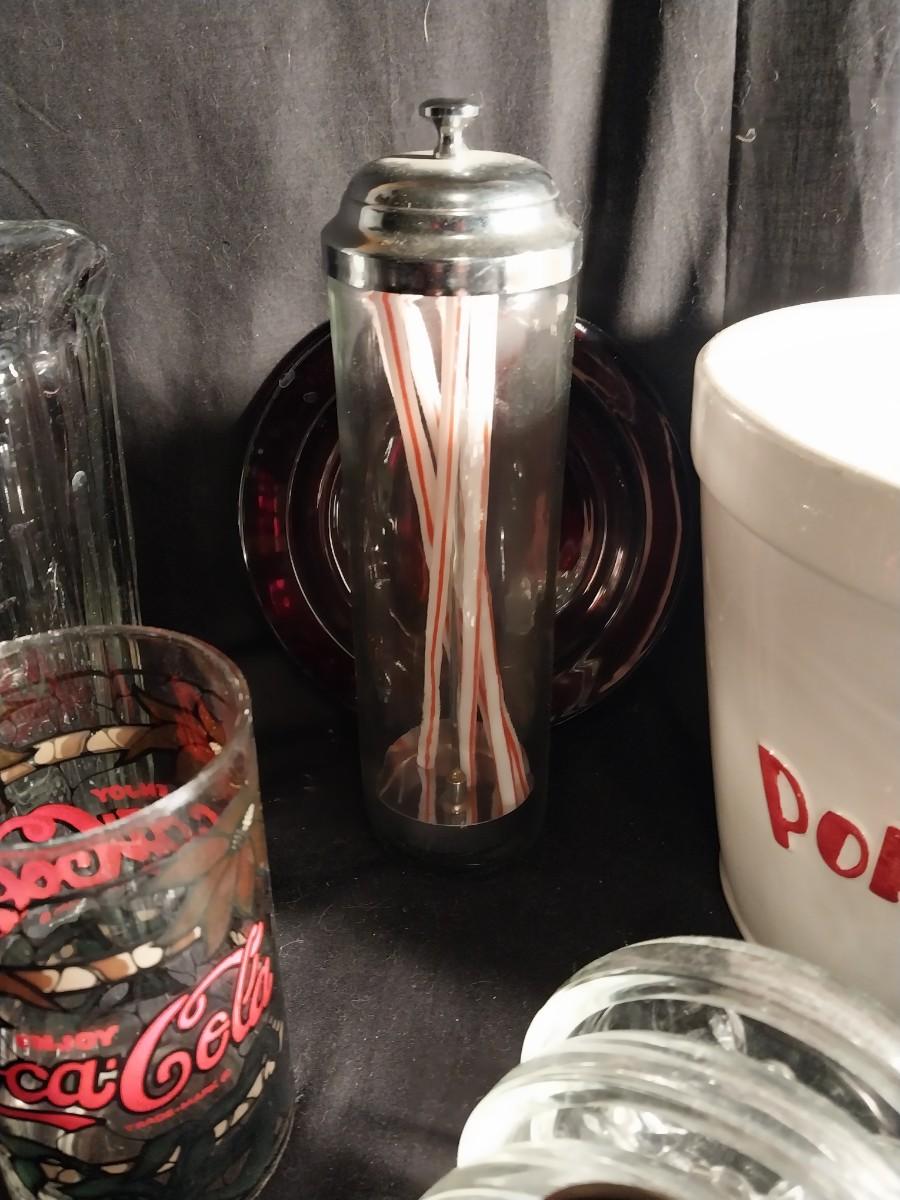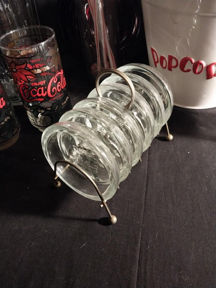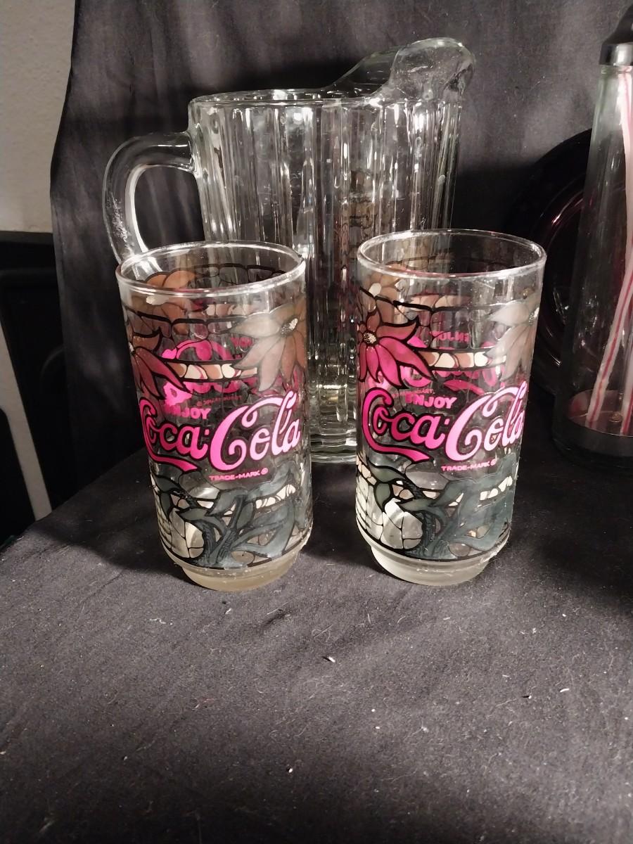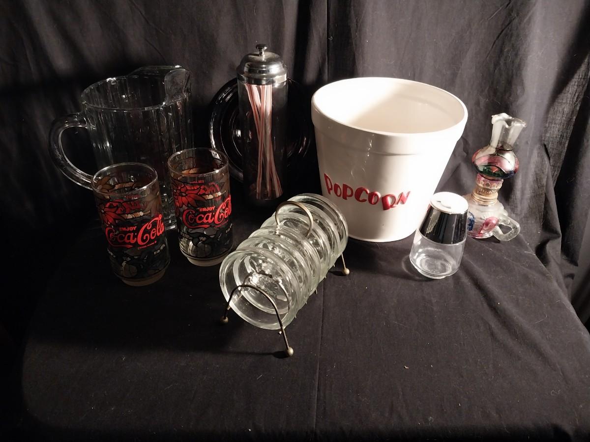 CERAMIC POPCORN BOWL-VINTAGE COKE GLASSES-GLASS PITCHER-GLASS COASTERS-STRAW HOLDER