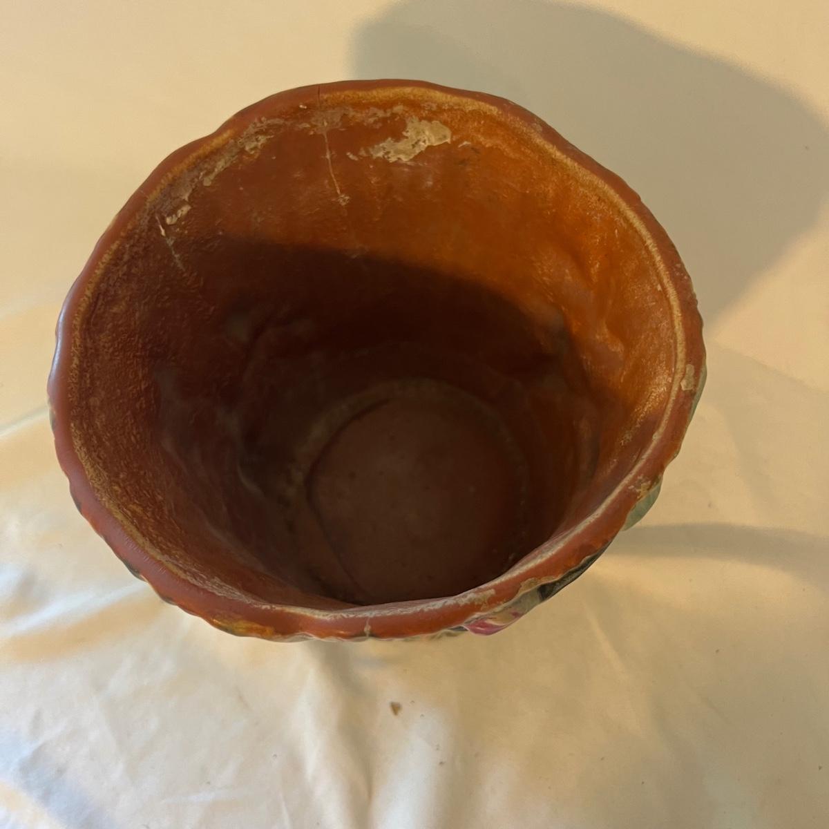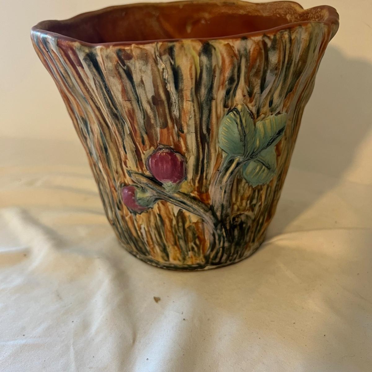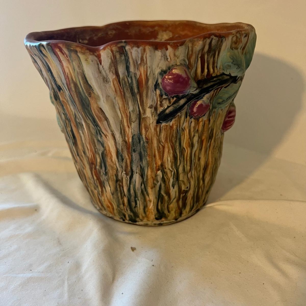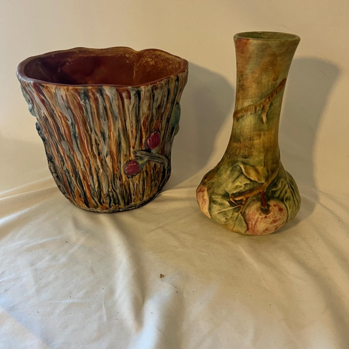 Ceramic pot and matching vase. The pot measures 6.5”D x 6”H. The vase measures approximately 4”D x 7”H.