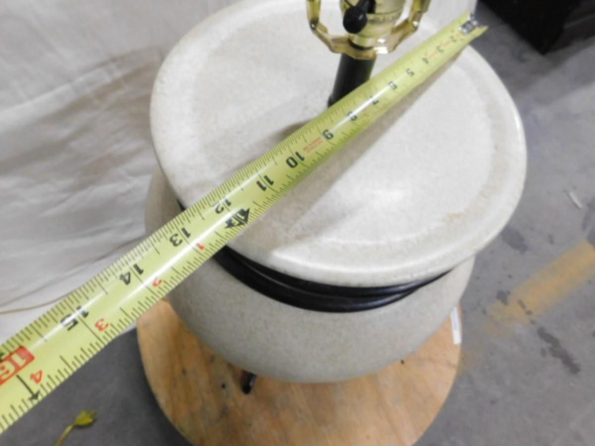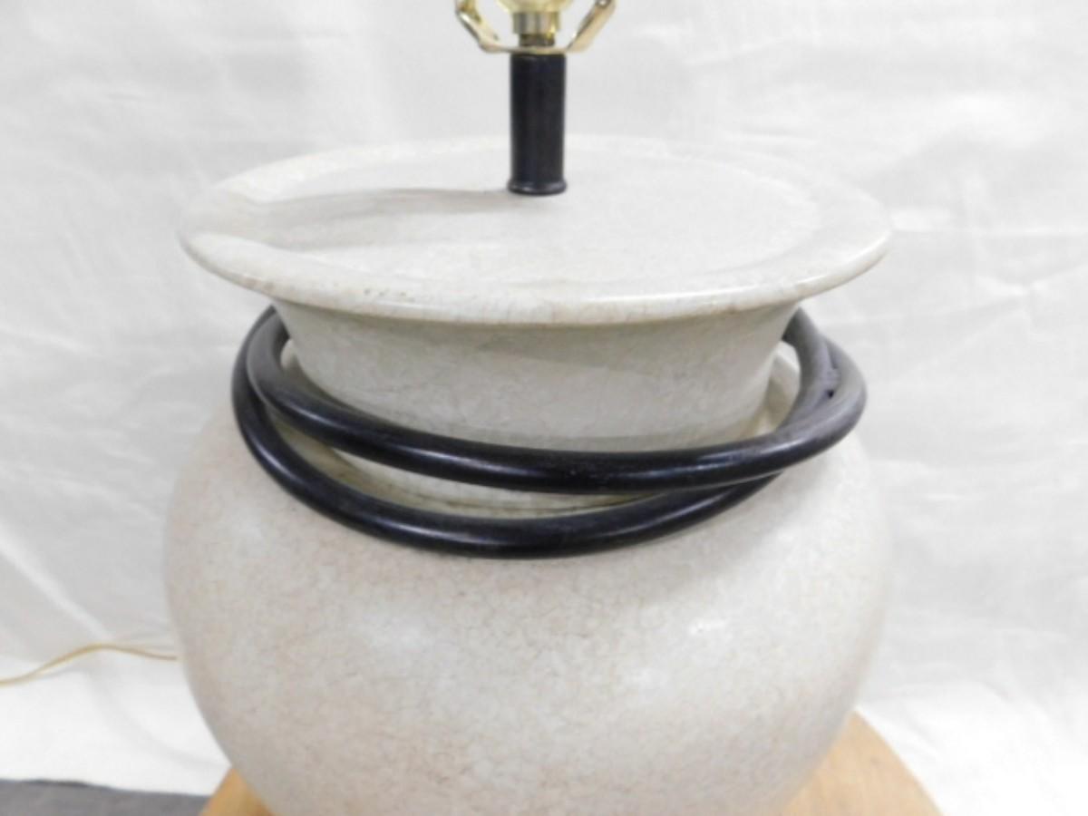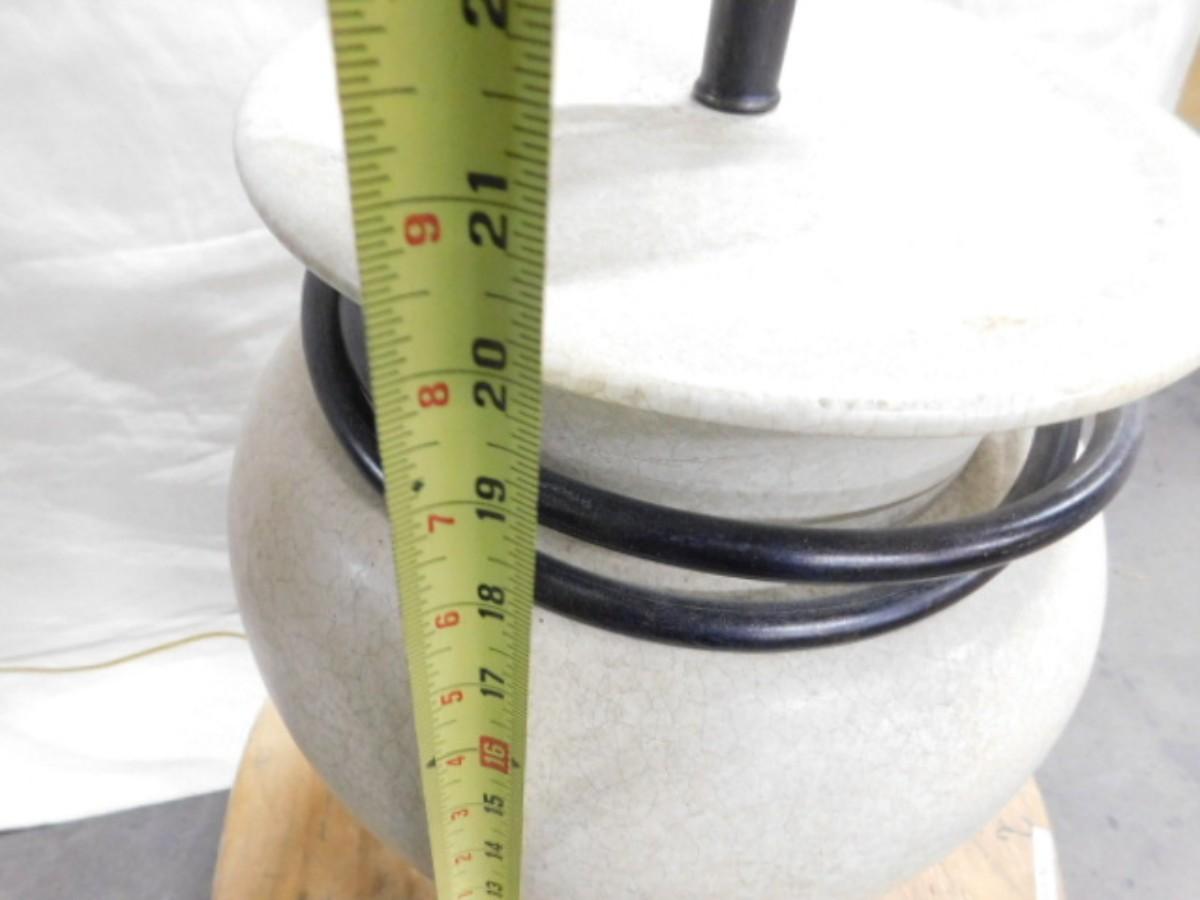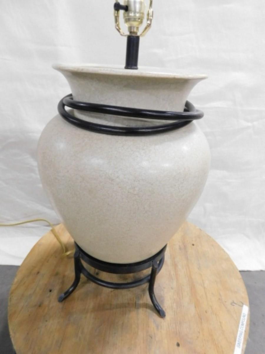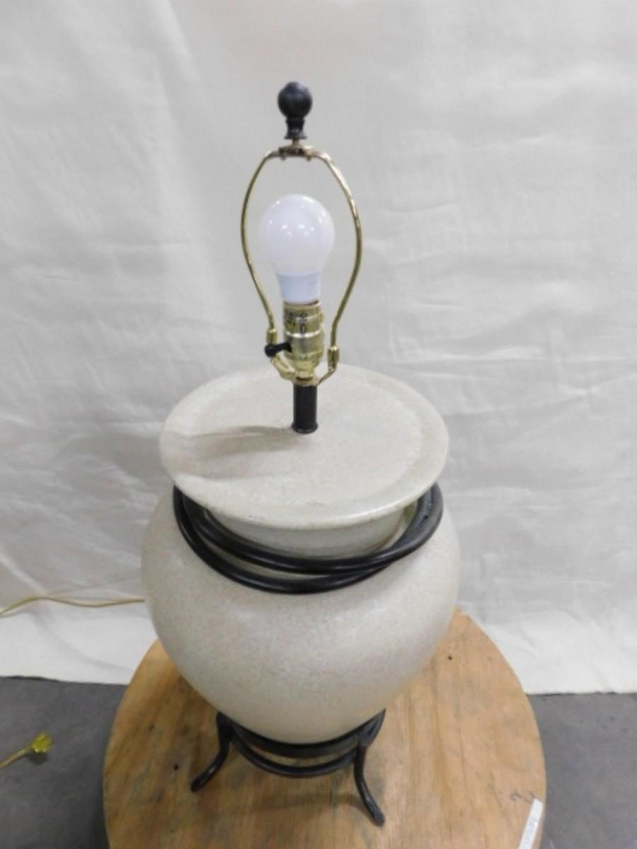 Pair of Ceramic Pot Belly Jar Lamp on Wrought Iron Stand Choice B Expect some wear or scratches to the finish. Shipping option available via freight or local mover at Buyer's expense. Buyer must have all shipping scheduled within the stated dates and times of pickup. Recommended local mover is Beaty Bros. Moving 828-201-2982