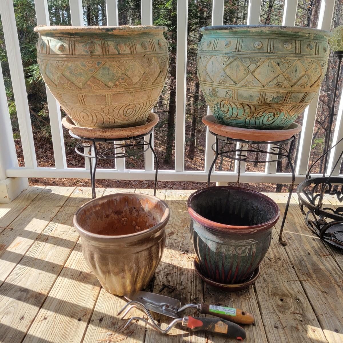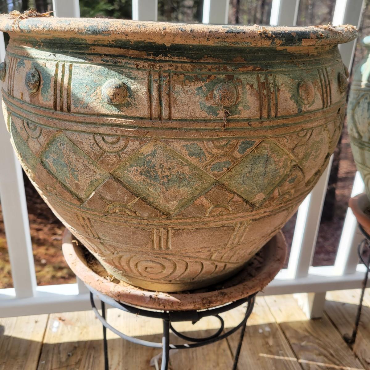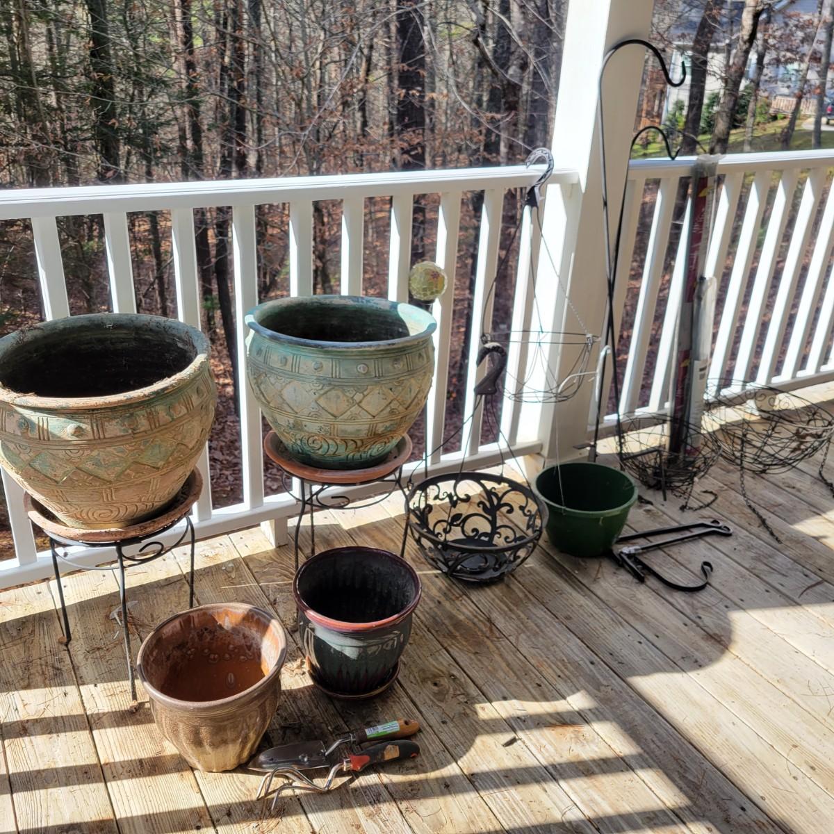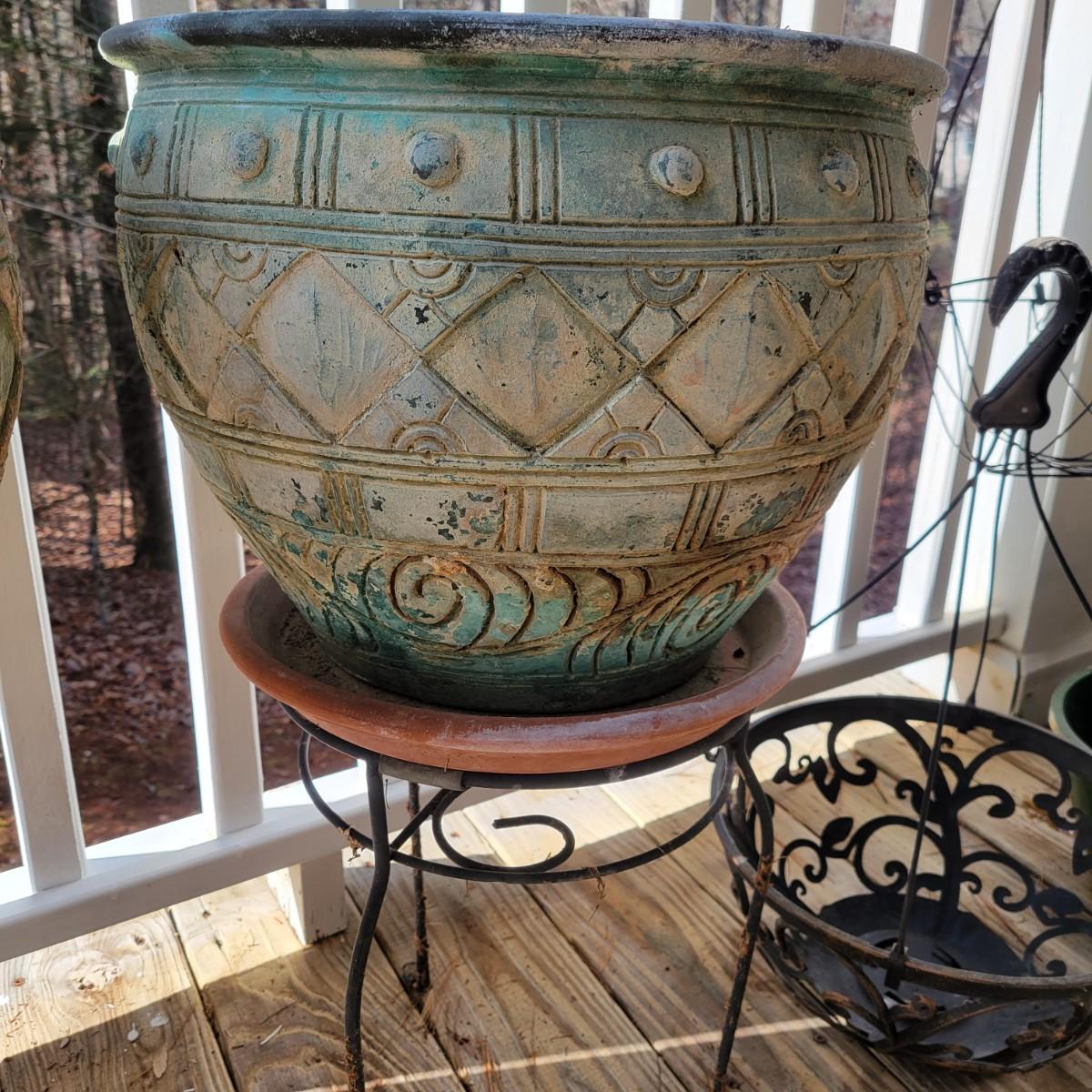 An assortment of ceramic pots, hanging planters, stands and other items in good condition with some damage. Two large ceramic planters that include terracotta bases and metal plants stands. One pot does have a piece missing from its lip. Pots measure approximately 16" x 12". Two smaller ceramic, glazed Pots are included. A pair of hand gardening tools, three metal wall mounted hanger, seven hanging planters that are a Mix of plastic and metal, two bags of bamboo plant stakes and two shepards hooks, one of which has a clamp base for mounting to a deck rail. The large flower pot with pansies is full of soil and very heavy. It measures approximately 22" x 16" and is a ceramic pot. Local pickup only. Winning bidder must bring assistance to help move and load this item due to its weight and/or size