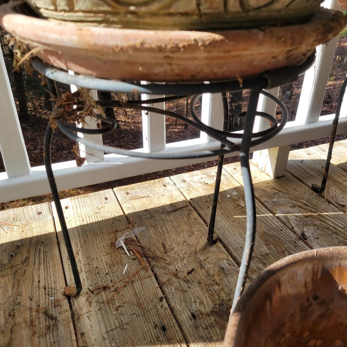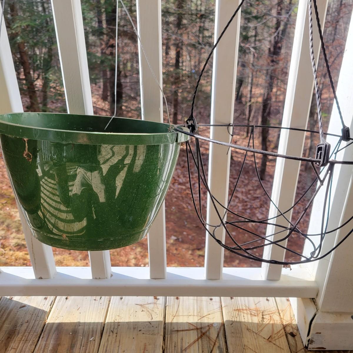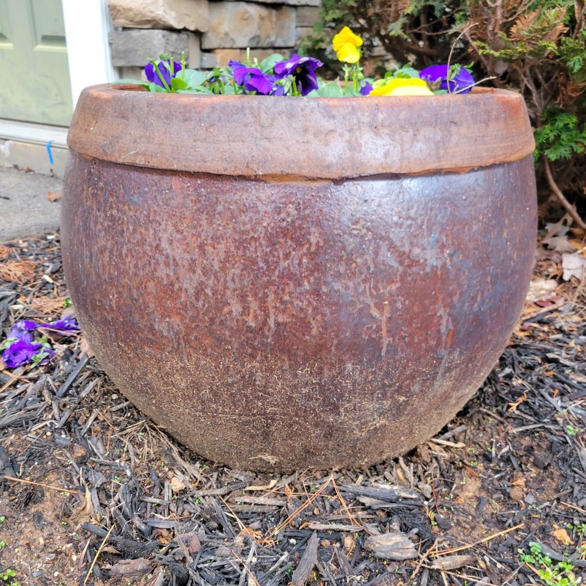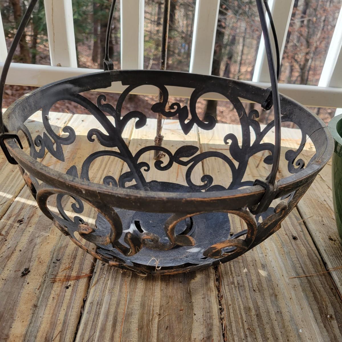 An assortment of ceramic pots, hanging planters, stands and other items in good condition with some damage. Two large ceramic planters that include terracotta bases and metal plants stands. One pot does have a piece missing from its lip. Pots measure approximately 16" x 12". Two smaller ceramic, glazed Pots are included. A pair of hand gardening tools, three metal wall mounted hanger, seven hanging planters that are a Mix of plastic and metal, two bags of bamboo plant stakes and two shepards hooks, one of which has a clamp base for mounting to a deck rail. The large flower pot with pansies is full of soil and very heavy. It measures approximately 22" x 16" and is a ceramic pot. Local pickup only. Winning bidder must bring assistance to help move and load this item due to its weight and/or size
