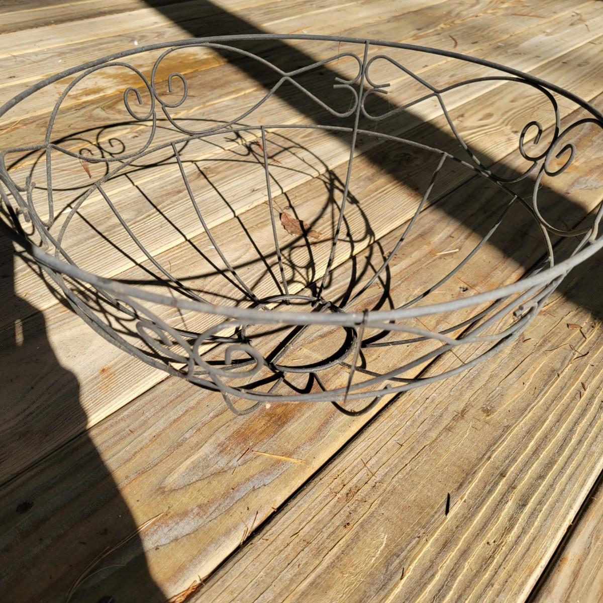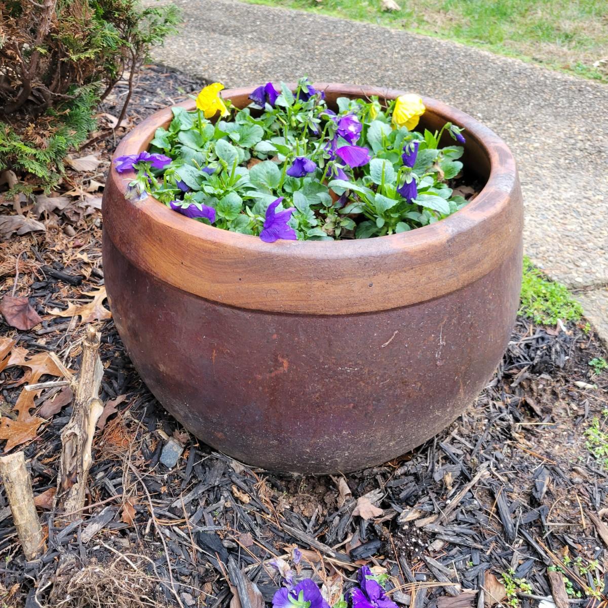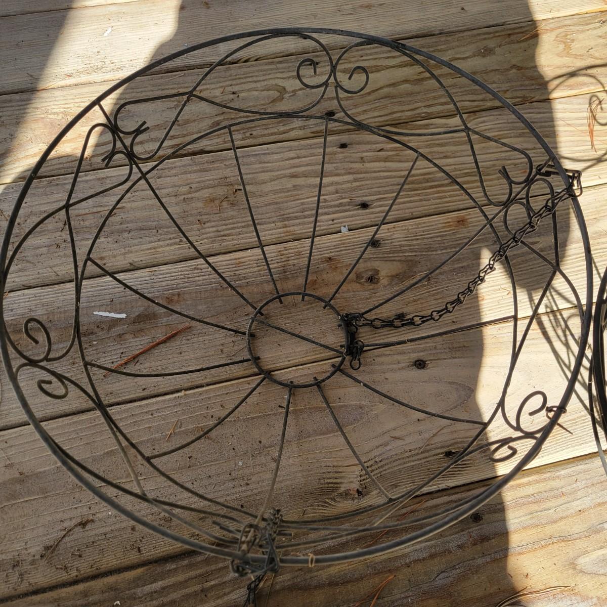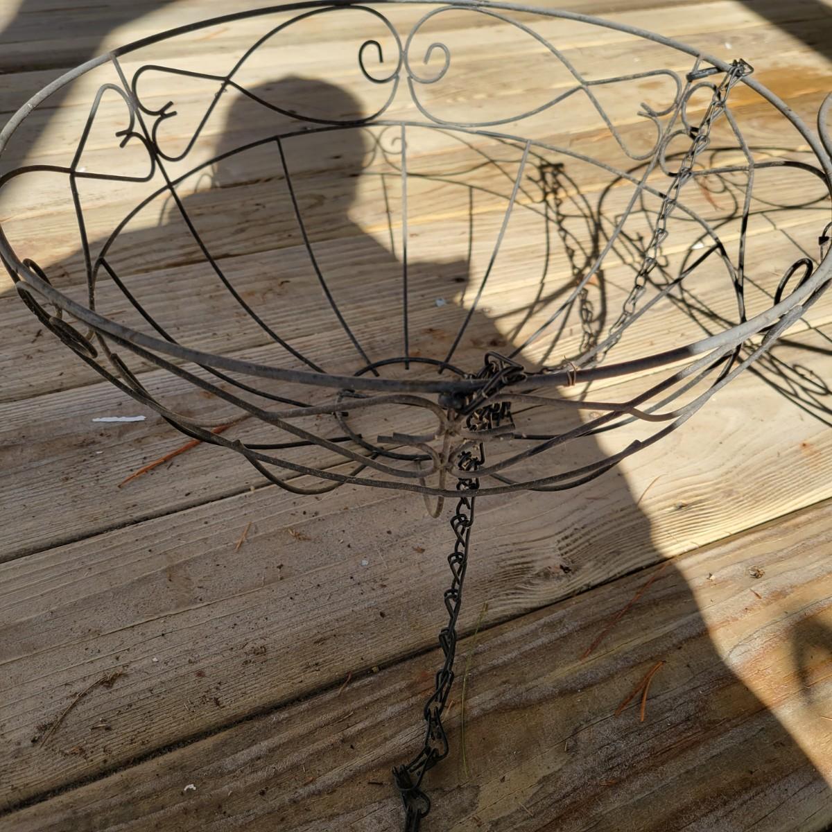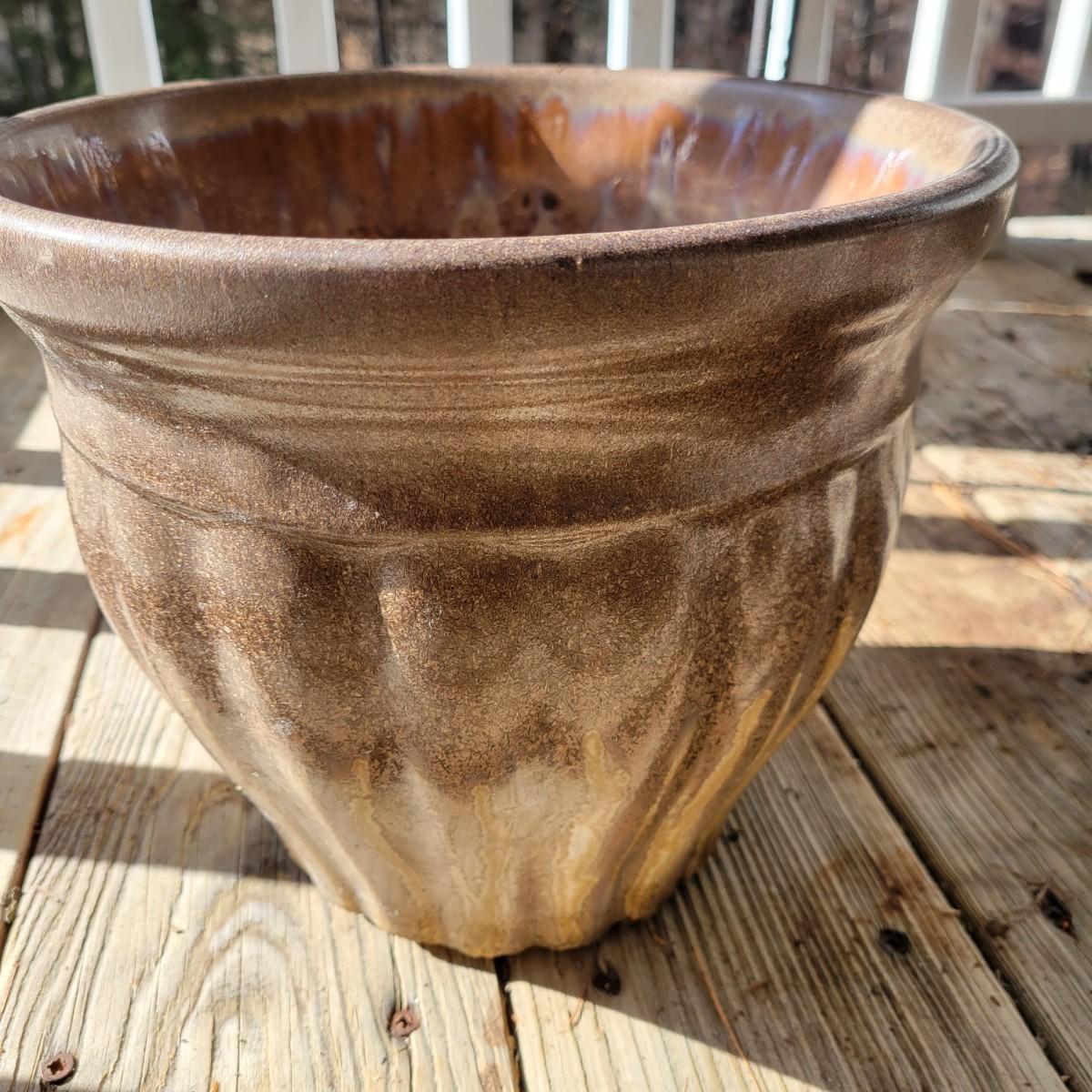 An assortment of ceramic pots, hanging planters, stands and other items in good condition with some damage. Two large ceramic planters that include terracotta bases and metal plants stands. One pot does have a piece missing from its lip. Pots measure approximately 16" x 12". Two smaller ceramic, glazed Pots are included. A pair of hand gardening tools, three metal wall mounted hanger, seven hanging planters that are a Mix of plastic and metal, two bags of bamboo plant stakes and two shepards hooks, one of which has a clamp base for mounting to a deck rail. The large flower pot with pansies is full of soil and very heavy. It measures approximately 22" x 16" and is a ceramic pot. Local pickup only. Winning bidder must bring assistance to help move and load this item due to its weight and/or size